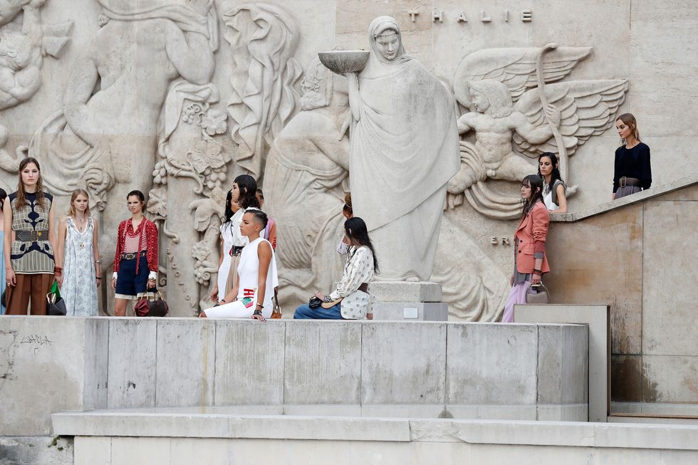 Designers took to the streets, or rather lush gardens and parks, monumental plazas and courtyards of Paris' impressive cityscape. Kenzo returned to the Jardin de Institut National de Jeune Sourds and Balmain to the Jardin des Plantes, but many forged new spots. Coperni held bragging rights by staging the "highest" fashion show in Paris at 210-meters on the modern rooftop terrace of the otherwise-known-as-eyesore Tour Montparnasse. Chloé took over Rick Owens endroit préféré and showed a generously spaced-out performance in the empty fountain of the Palais de Tokyo. Christelle Kocher held the Koché show in the misty, post-rain air of the Parc des Buttes Chaumont, where joggers and onlookers caught a glimpse of the show while simply passing through the park.