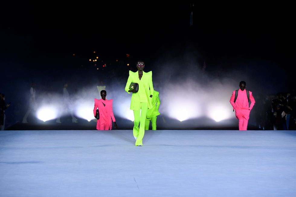 It wasn't all doom and gloom, though. There were moments of joy, most notable the Balmain show that jolted Paris back to life like a pack of feisty new hosts on Westworld ready for the next showdown. Staged in the Jardin des Plantes, the location was also the site of the brand's summer Solstice music festival-style men's show slash concert in 2018. In an ode to founder Pierre Balmain, Olivier Rousteing took to the runway with a group of older well-known couture house fit models and surveyed his new collection to the sound of Sinatra's "My Way." The show launched into an explosion of neon and energy, set to more self-explanatory music Depeche Mode's "People are People" and Bowie's "Life on Mars" as a cacophony of neon-clad, Pagoda-shouldered, crystal and house logo-covered, Jorts-wearing models paraded in social-distanced packs.