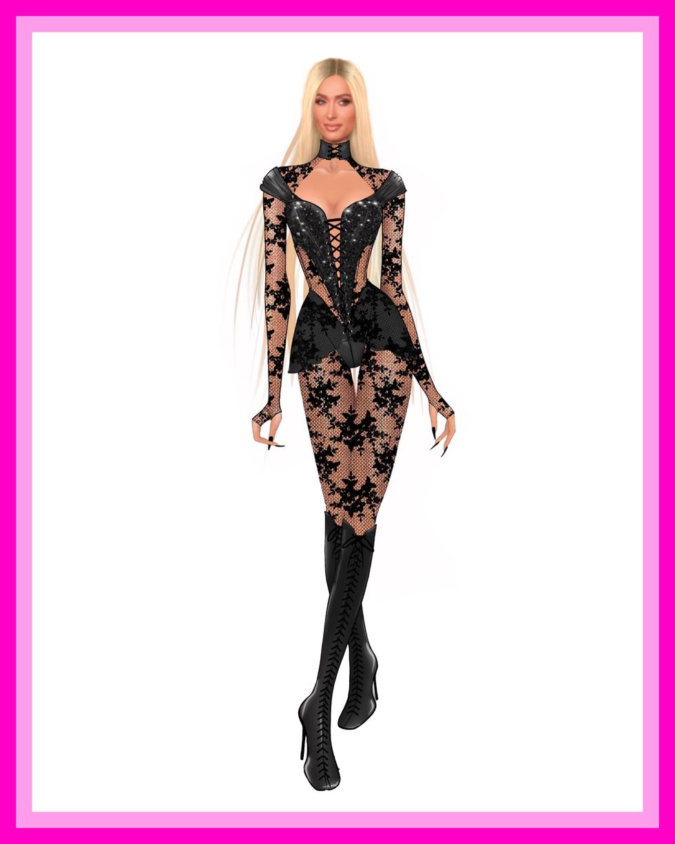 Hilton’s costumer and stylist Sammy Kassaie was also critical to the Infinite Icon Experience, saying she “envisioned a dazzling spectacle where [Paris’] iconic monochromatic themes would distinctly separate each act.” Backup dancers further amplified this mission, “like perfect Ken doll clones,” Kassaie adds, broken into the five acts that mirrored “pivotal chapters of Paris’ life.” Between Hilton, who’s “the ultimate muse,” and Minden, the collaboration process was “an awe-inspiring, unforgettable journey” for Kassaie.”