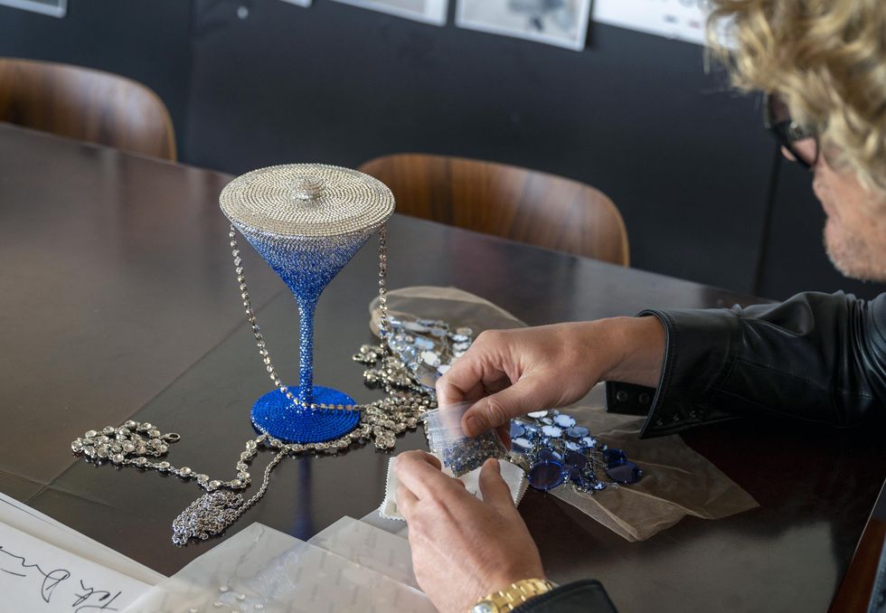 To bring the boozy design to life, Dundas worked with his “dear friend,” Marina Raphael at Swarovski, to embellish the bag with 3,404 crystals, all set in-hand “in an ombré from majestic blue to a clear crystal.” The creation took nearly two months to complete, since Dundas explains that creating a flask bag “required a bit of engineering” and a “great amount of attention to detail to perfect.”