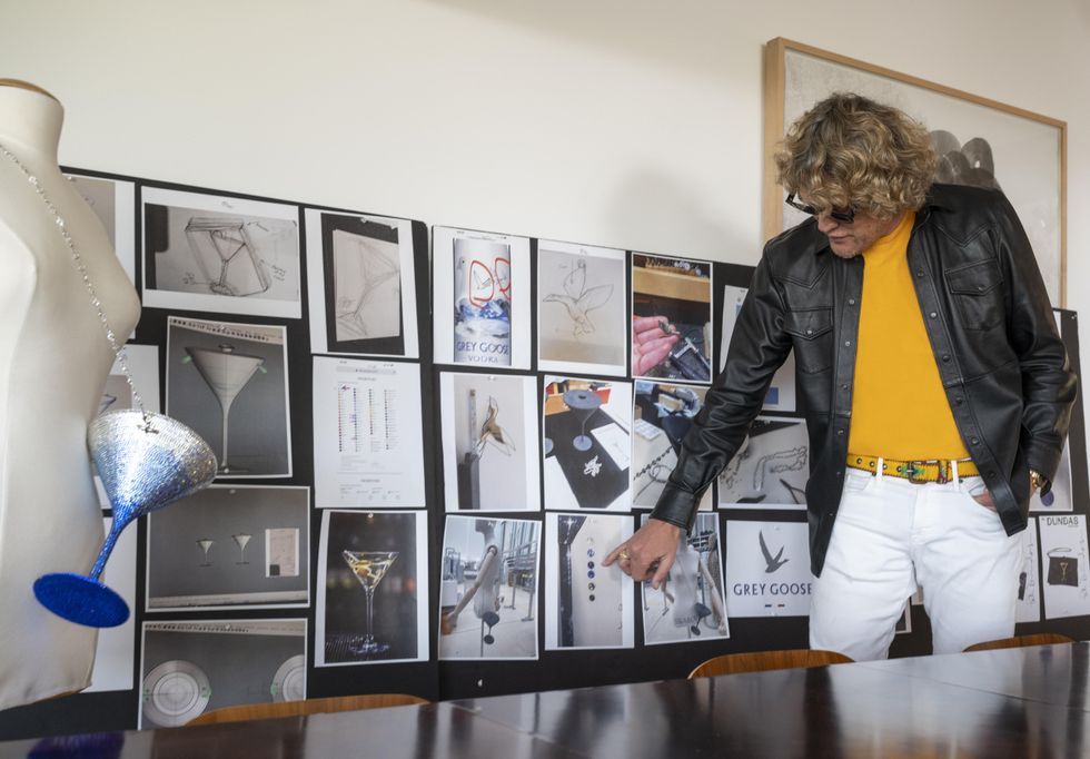 He considered Grey Goose’s signature branding when developing the design, leaning into its “clean, natural taste” and famous bottle, both of which speak to Dundas’ own Celtic roots. “I wanted to incorporate the frosted glass and metallic-blue tones from the bottle into the final design,” he says. “I also incorporated handcrafted silver goose charms attached to the crystal strap, making the piece even more unique.”