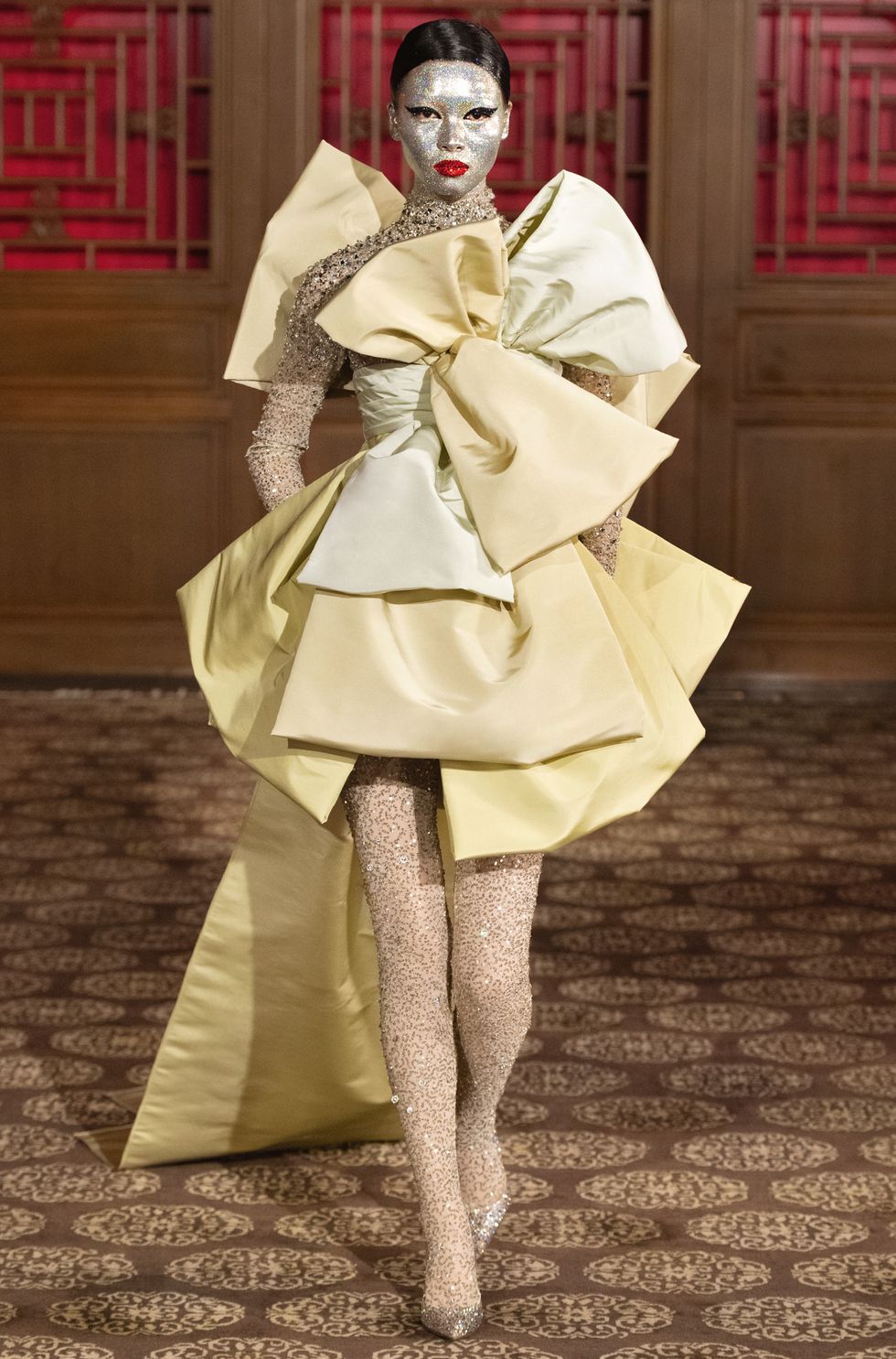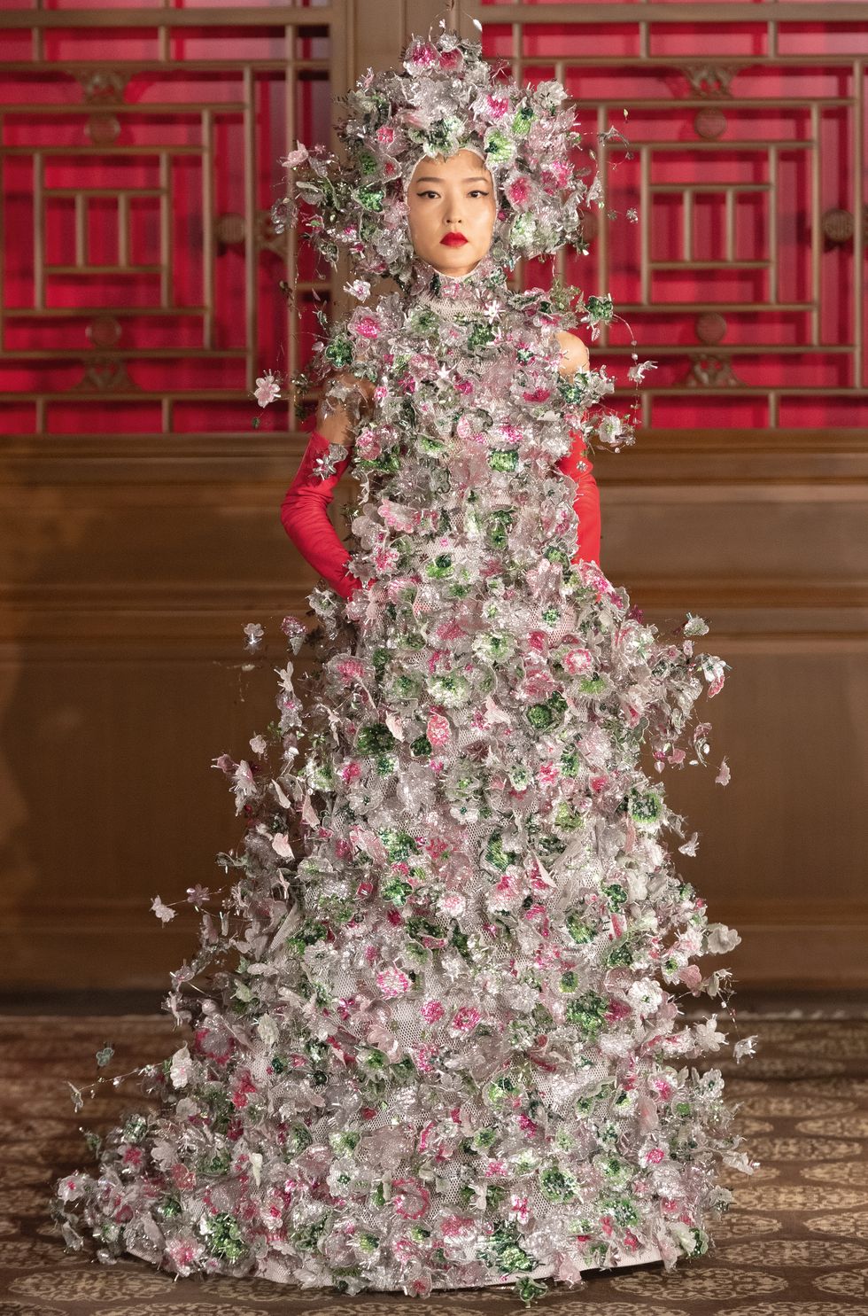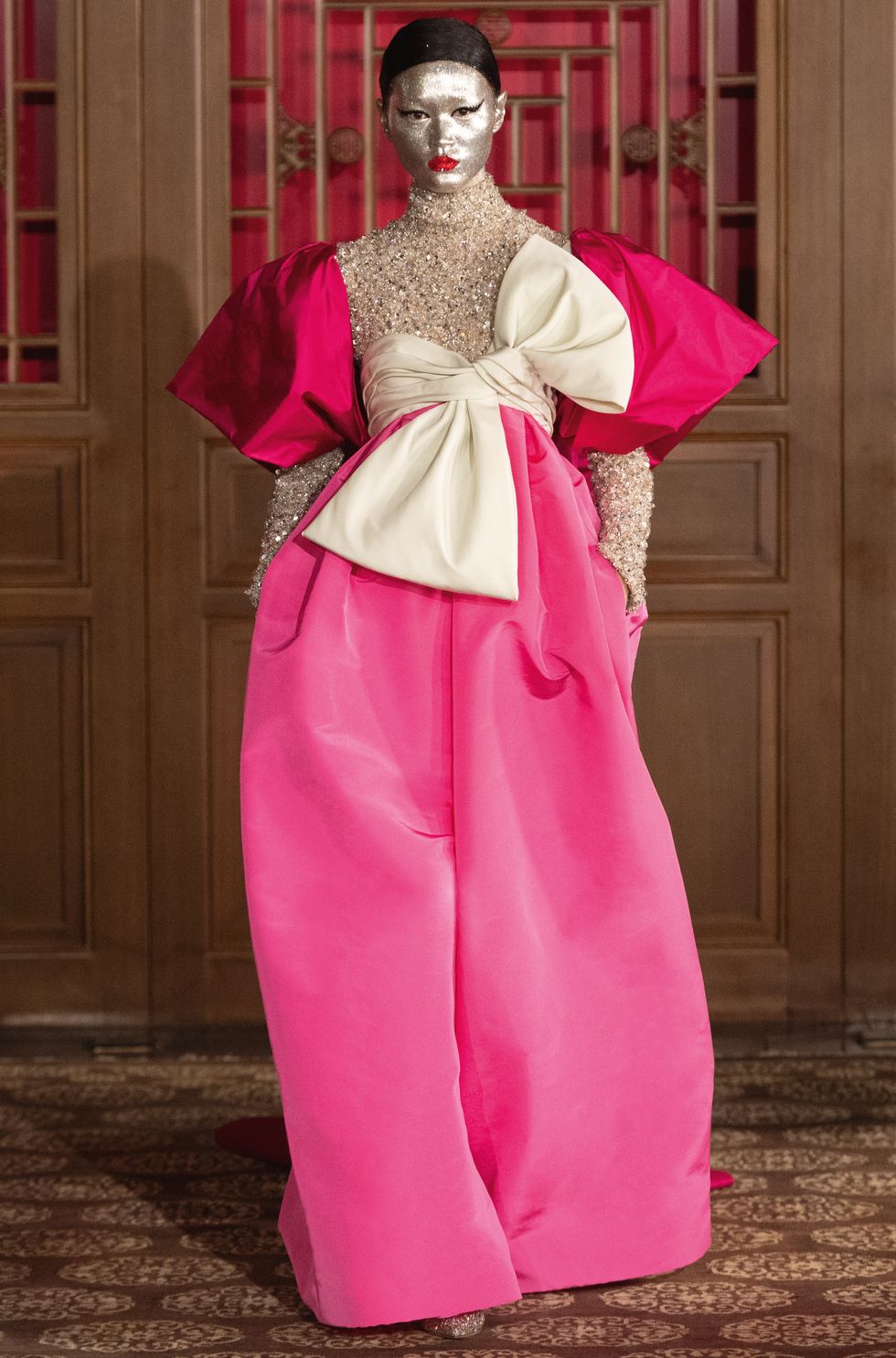 For the show, titled "Daydream," Creative Director Pierpaolo Piccioli also shared the artist's vision in creating the dramatic look and matched it with a series of giant ball gowns, sheath dresses, exaggerated rose prints and bows.