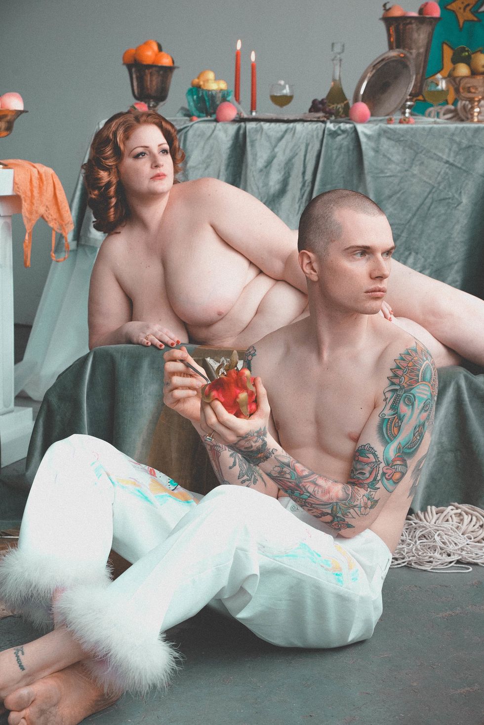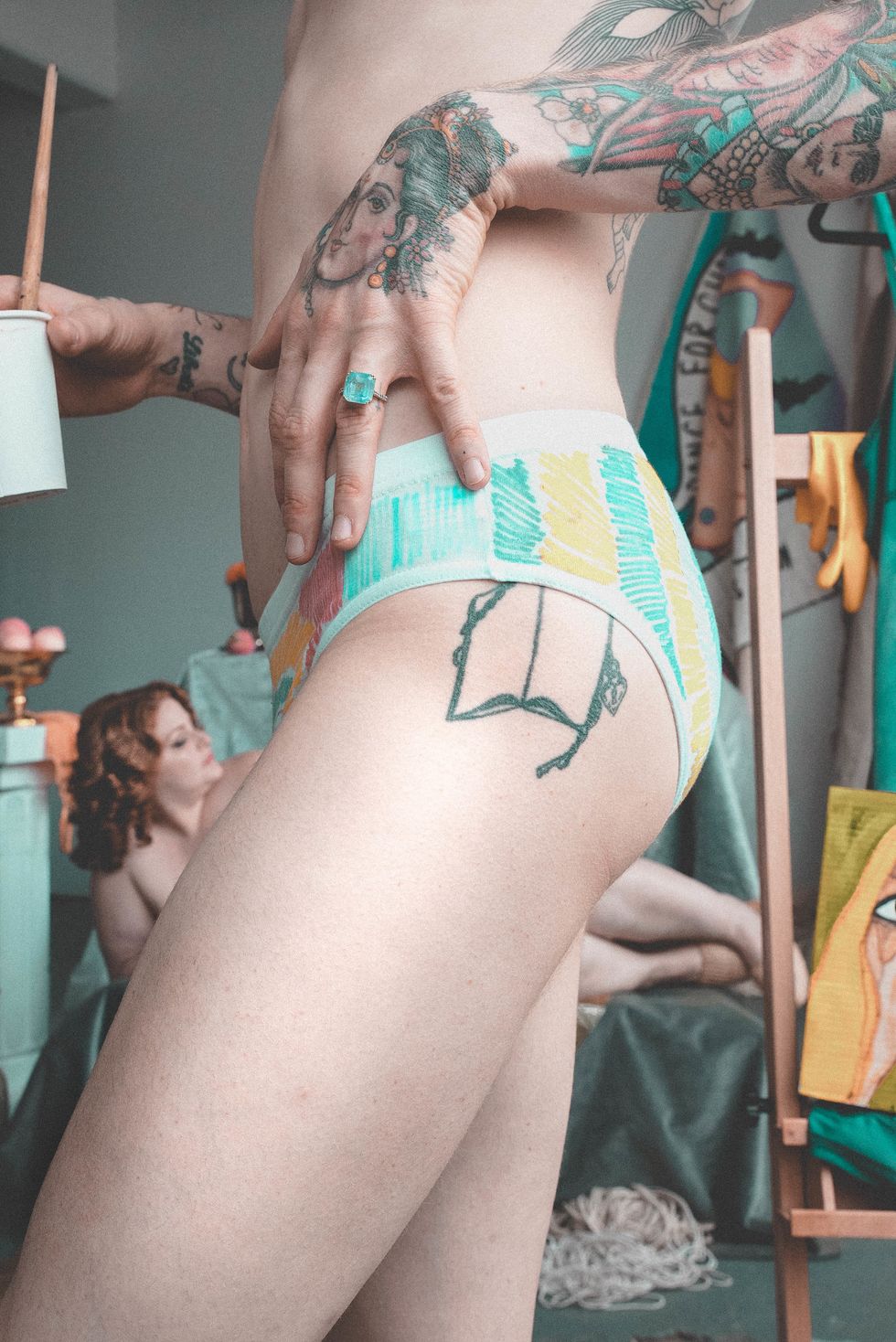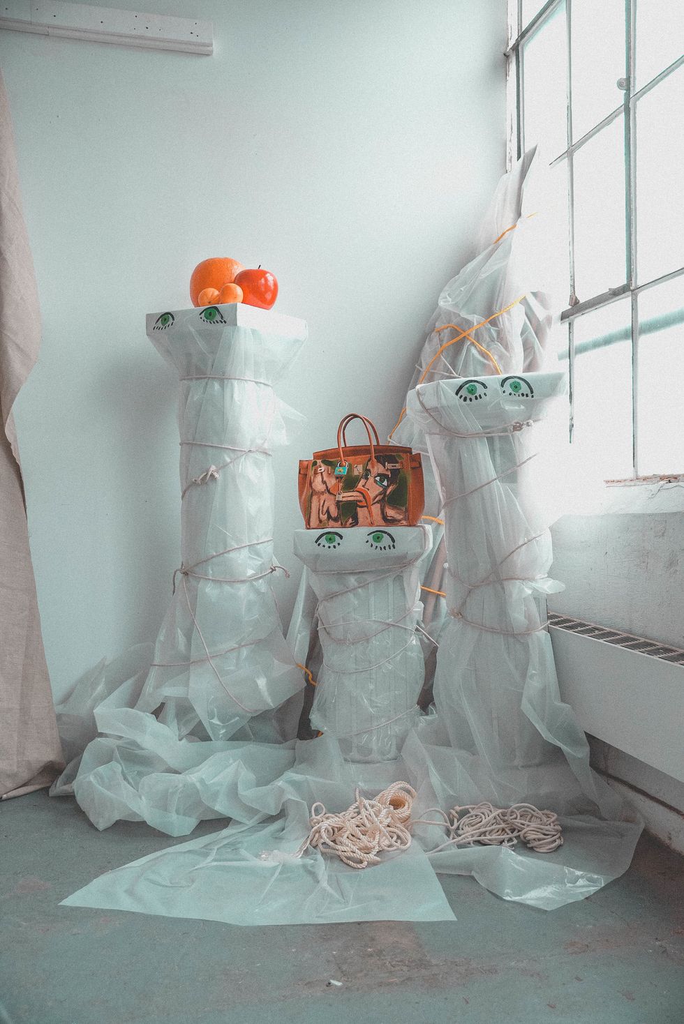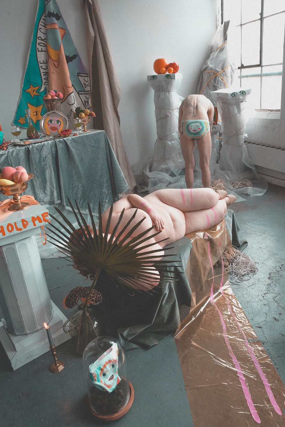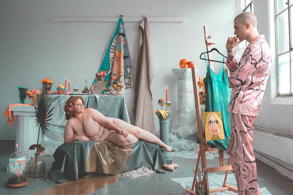 Set against a dramatic opera soundtrack, Church's new film I Look For You In Everything spotlights this method. Director Chelsy Mitchell captured the artist with a nude model, surrounded by objects he's painted, from bags to underwear and giant swaths of suspended fabric. At first, Church paints the subject's face onto a slip — his signature — but then he begins painting himself, painting fruit, painting a pedestal, all while dancing in the sun-soaked space. Eventually, Church moves onto his model's breast, transforming her into one of his many interdisciplinary works.