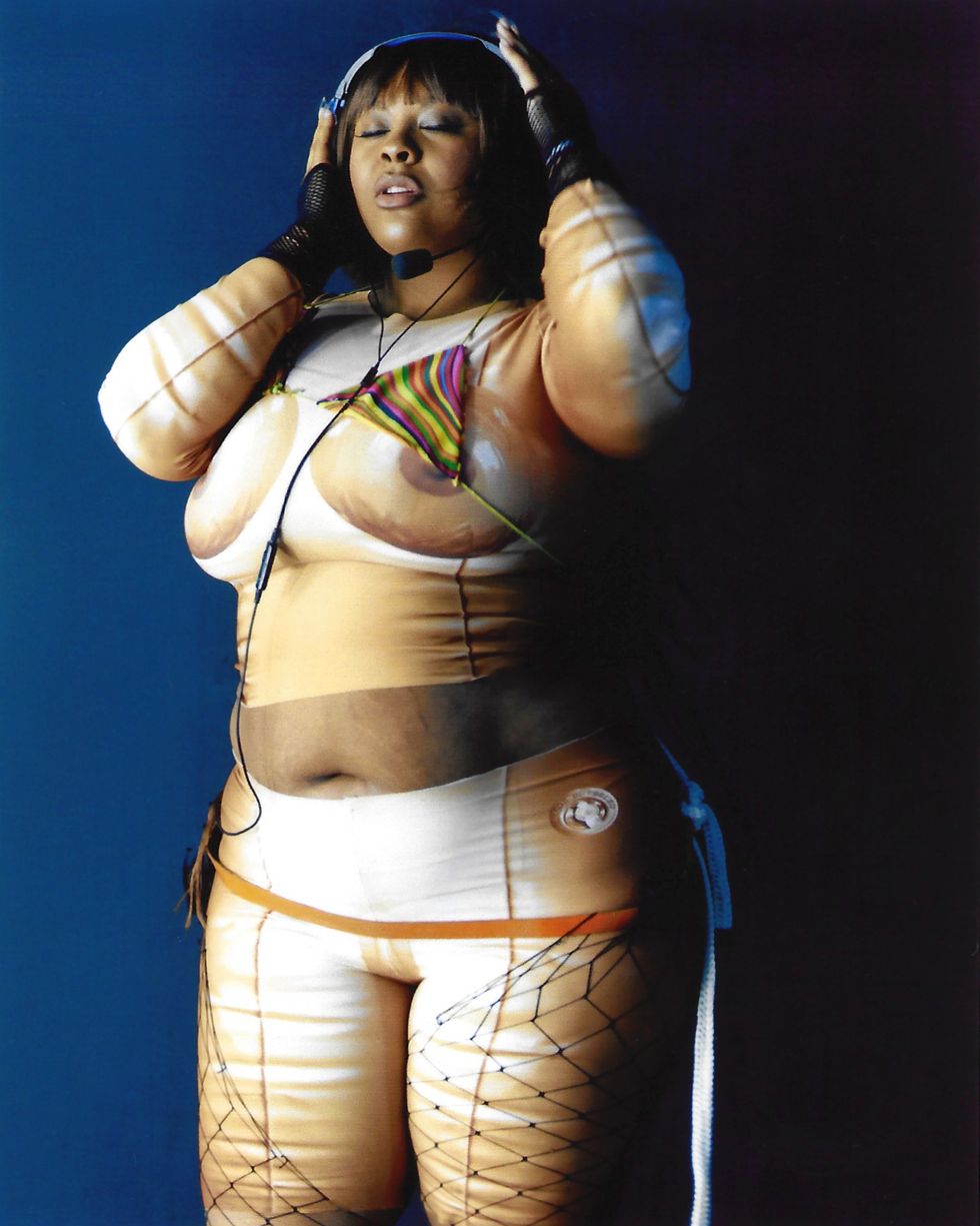 I think social media has also opened the floodgates of accessibility. I have gone through many phases in the past of trying to figure out what form of online expression is most true to myself. I’ve had eras of being too ashamed of how I look to even post a wholesome selfie, and I’ve had eras of thirst traps and social media sex work. Both have left me confused on who is in control, me or the consumer. Now I find myself looking for a balance, one that feels like I am sharing my body in a way that serves me. The Inflatable Set mimics that dichotomy. The wearer seems to be fully exposed, nude in the most hyper sexual way, but in reality is completely covered and in control of what they choose to share of themselves.