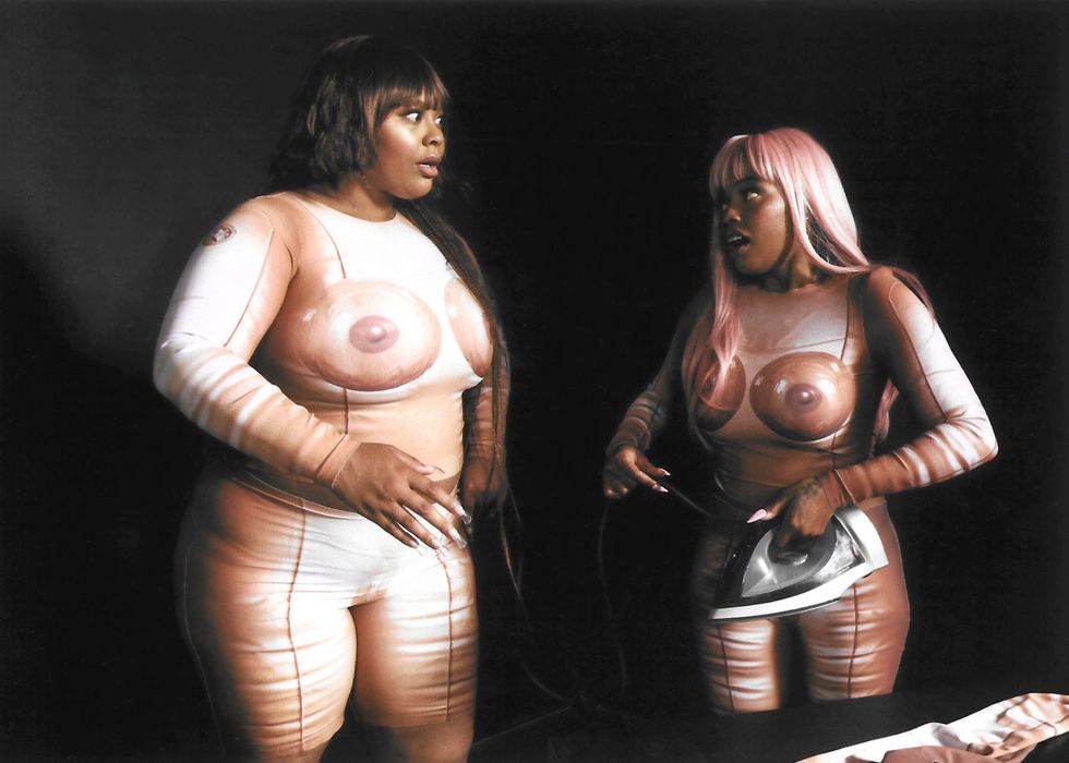 Enter The Inflatable Set, a bodysuit printed with an inflatable sex doll, introduced in the brand's editorial called "The Desperate House Dolls." "My work has always revolved around the body, I started out as a figure painter and moved into fashion, taking that obsession of the human form with me," Sommers tells PAPER. "After starting my brand Peeled by Marie Sommers, I hyper fixated on the concept of interactive clothing, working on several collections that featured custom painted hands sewn into the garments to cover or expose the wearer's body. I wanted to explore the idea of being nude without actually being nude."