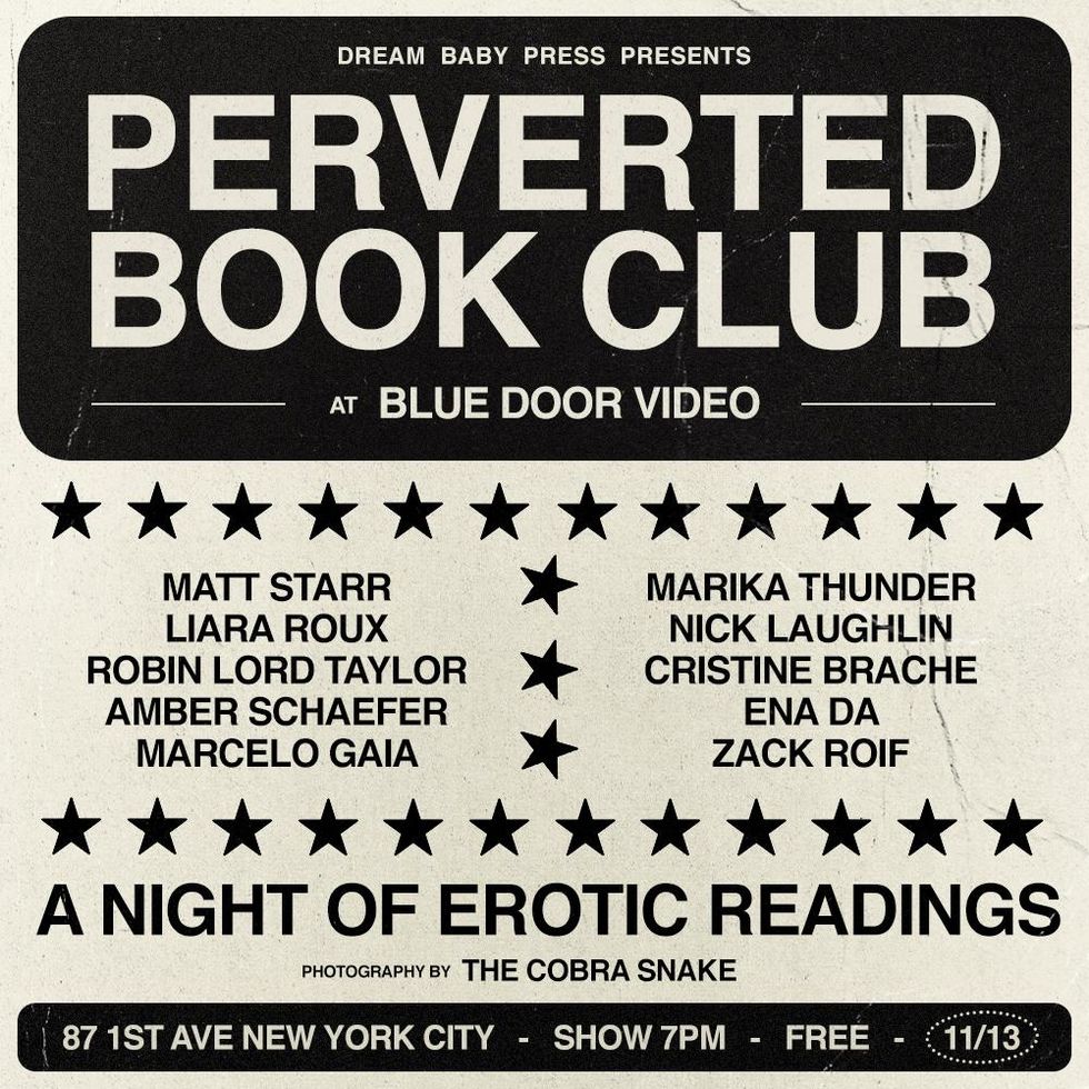 Put on by Dream Baby Press founders Matt Starr and Zack Roif, the first-ever event is set to take place this Sunday, November 13 in an old-school porn shop called Blue Door Video, where New Yorkers can celebrate eroticism by watching 10 artists read non-original works that are typically enjoyed in private.