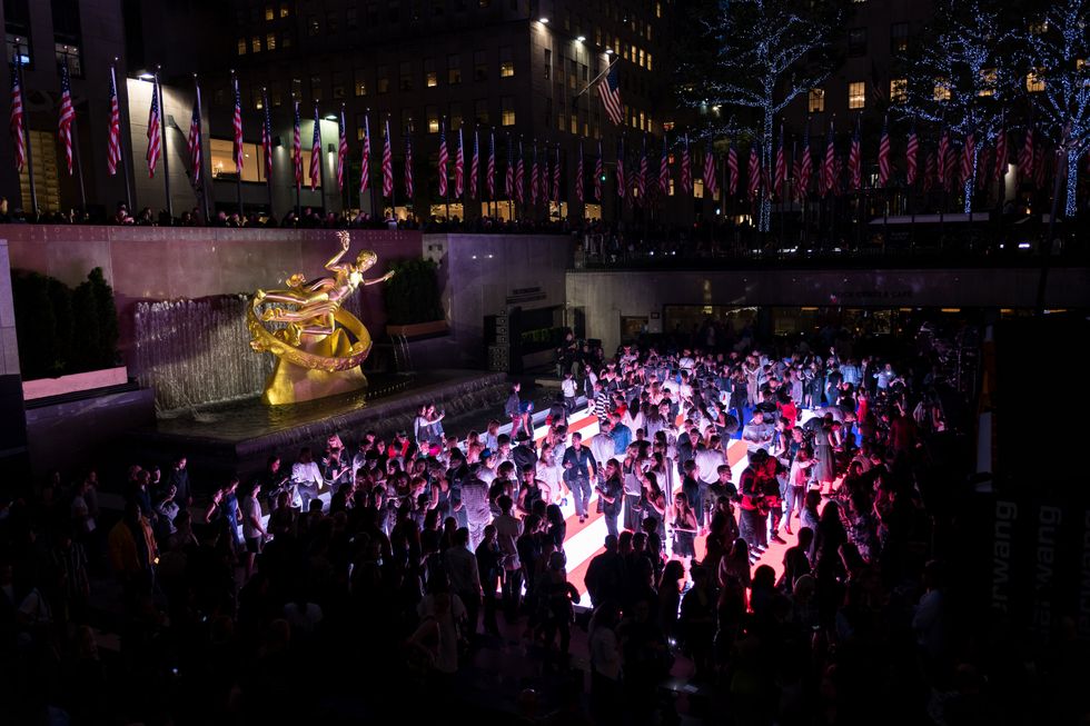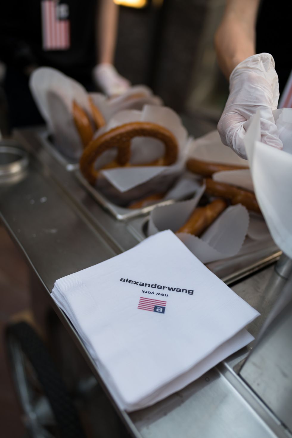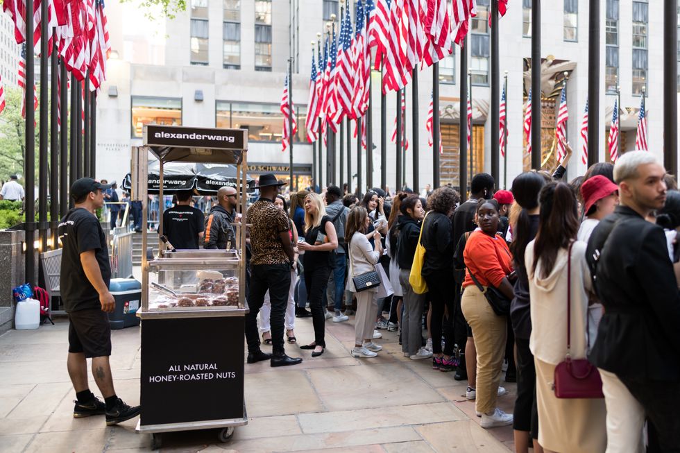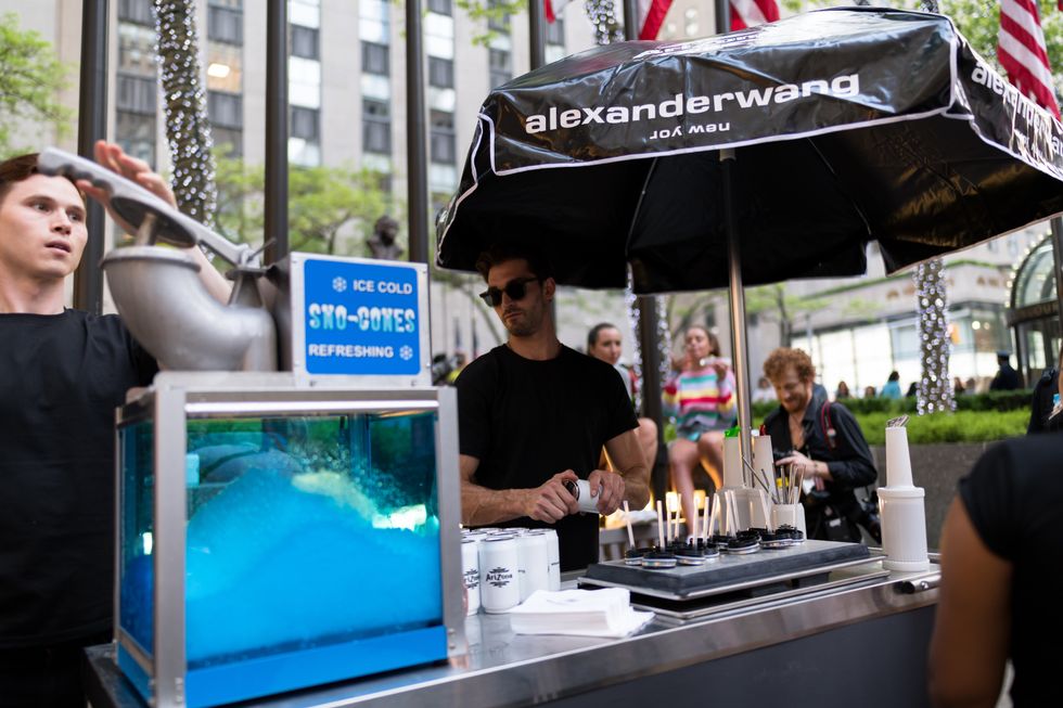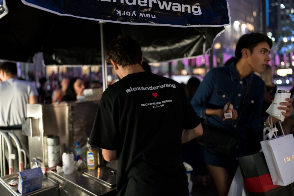 But, really, what made Collection 1 2020 such a spectacle was the fact that it was opened to the public. While VIPs and executives gathered by the checkerboard runway below, people were watching from above by the sidelines of the iconic Rockefeller Center fountain. And Wang made sure that New Yorkers and visitors felt welcome, even providing free New York treats such as hotdogs, pretzels, roasted nuts, and canned snow cones and green tea slushies with the Alexander Wang signature label, of course.