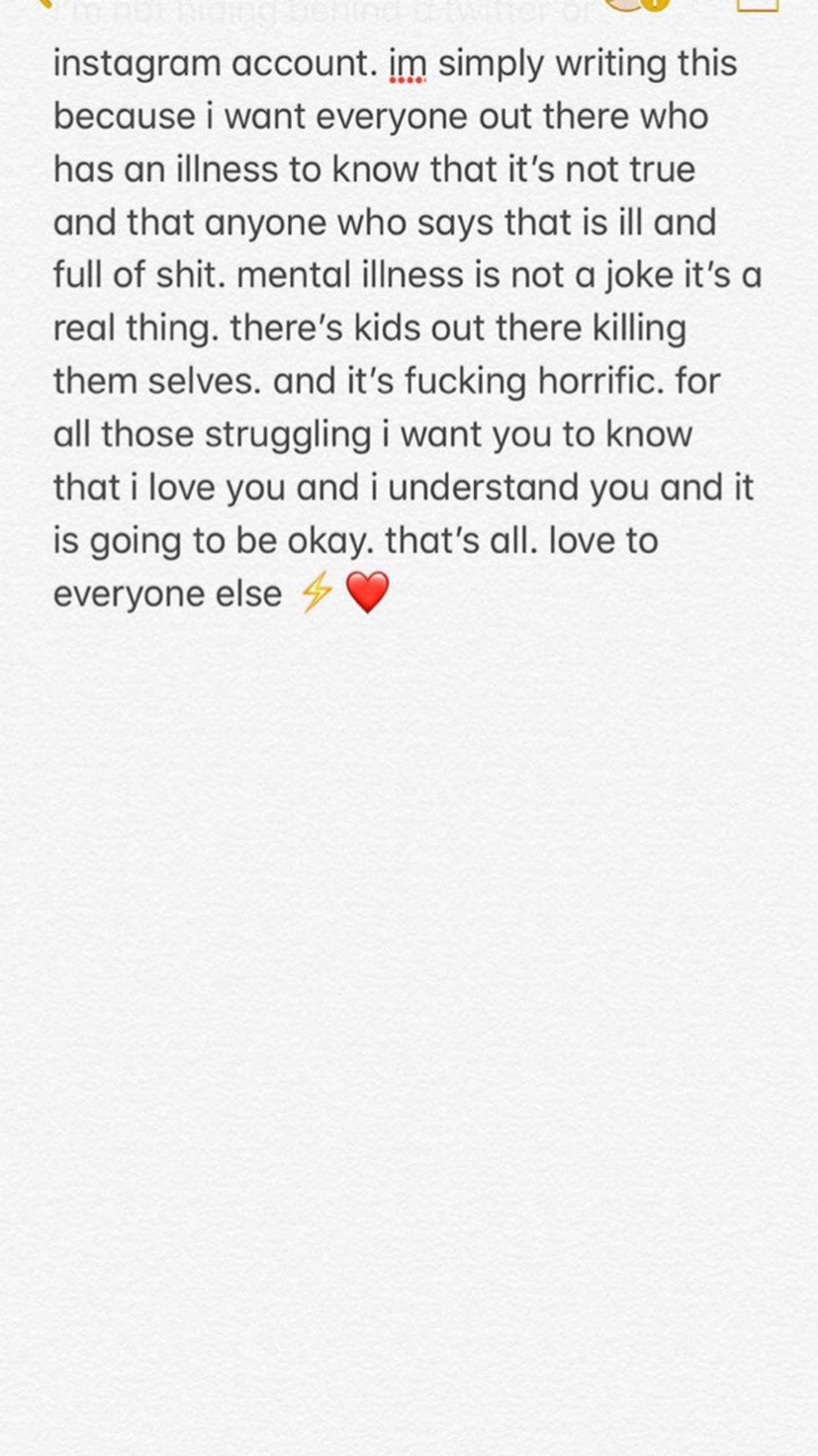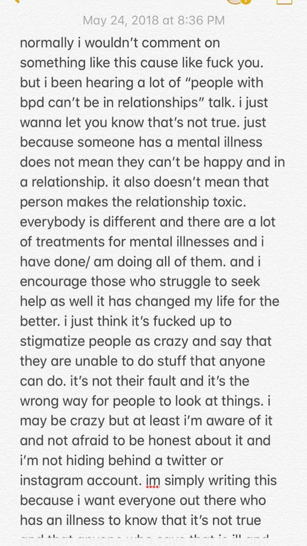 He continued, "Just because someone has a mental illness does not mean they can't be happy and in a relationship. It also doesn't mean that person makes the relationship toxic. Everybody is different and there are a lot of treatments for mental illnesses and I have done/am doing all of them…I just think it's fucked up to stigmatize people as crazy and say that they are unable to do stuff that anyone can do."