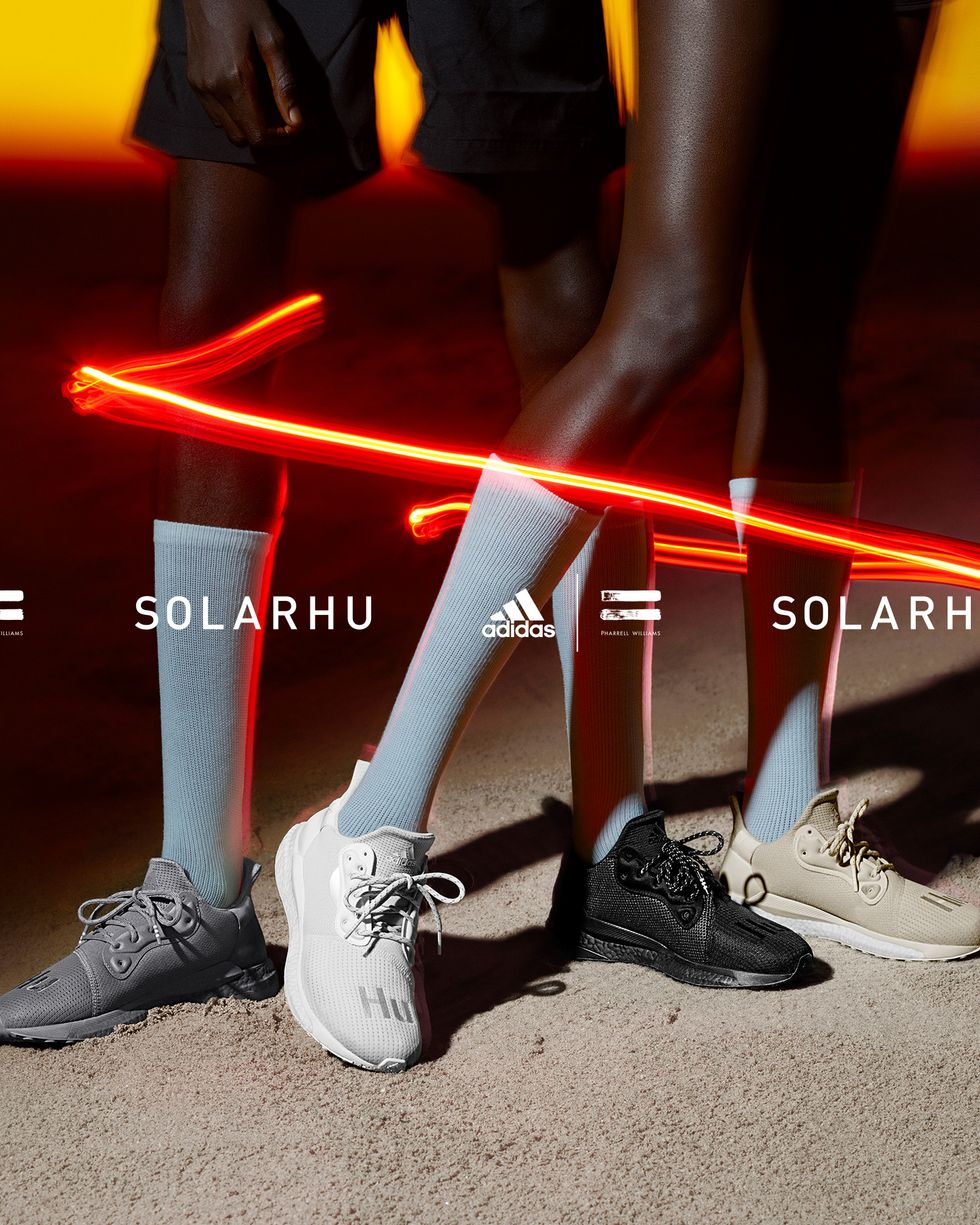 Those familiar with singer-producer-designer Pharrell Williams' past shoe collaborations will likely not recognize his newest creation with adidas. In what he's calling the SolarHu Greyscale pack, Williams is rolling out a four-part footwear collection that is unconfused by wild color-blocking and intentional brightness, but rather heightened by its plainness.