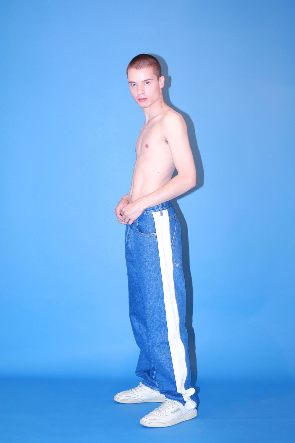 For the first season, it's bold and there's a high emphasis on color blocking and fabric blocking. We've made this jeans with these huge white stripes of twill on the sides, which have been a pain in the ass to learn how to make without having the indigo from the denim get everywhere. The collection is quite unisex, as well.