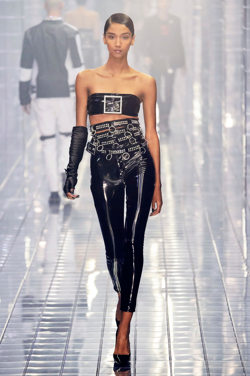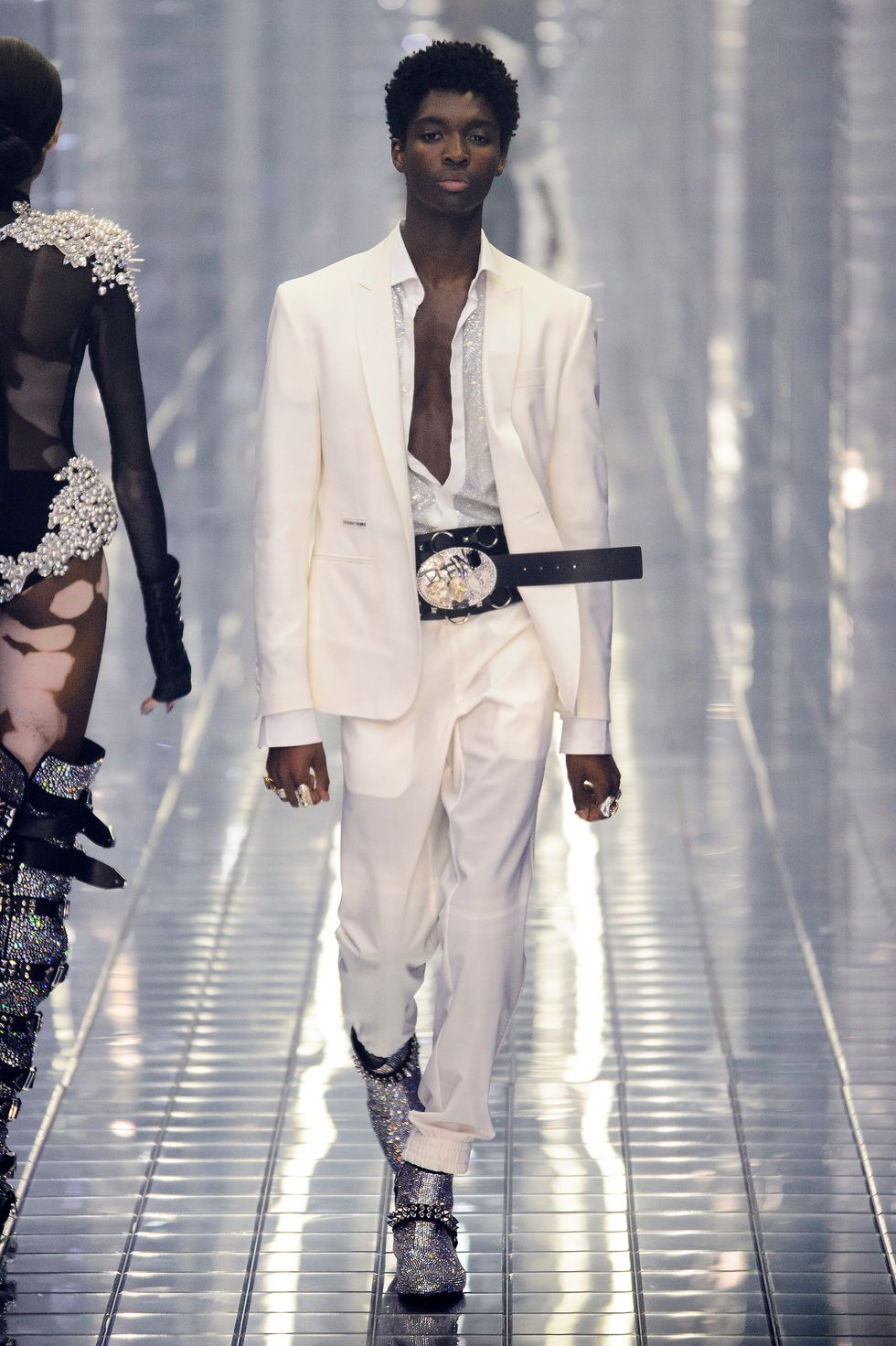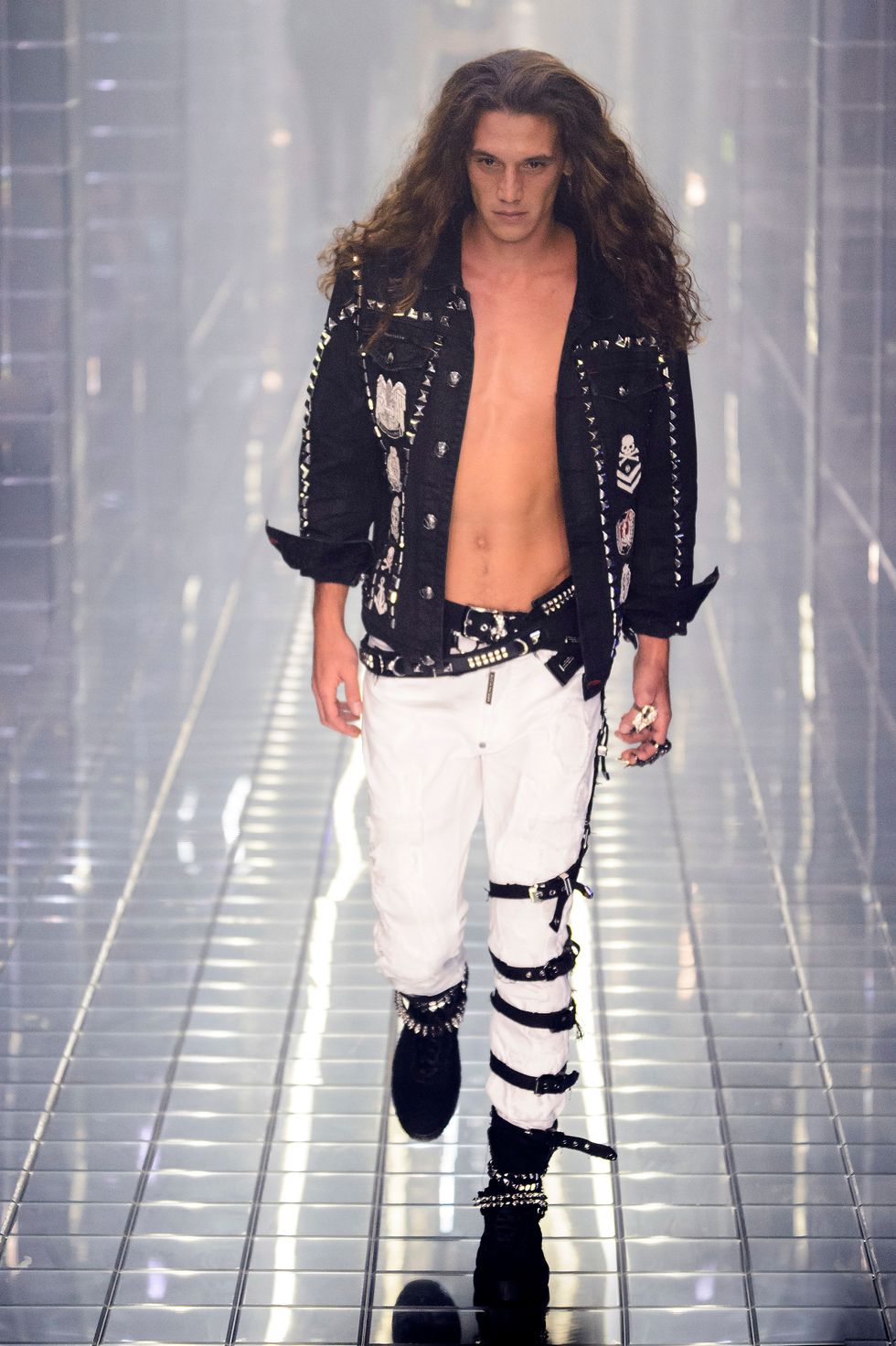 Philipp Plein's spring 2019 show in Milan was, as is his trademark, completely over the top. The show, a tribute to Michael Jackson, included several nods to the King of Pop – rhinestones glittered on booties, socks, and jackets, and Alton Mason even danced like the iconic performer. Models stomped down a mirrored runway in light-up LED sneakers reading "Philipp Plein," and the clothes, as per Plein standards, were very, very sexy, with a light touch of biker style.