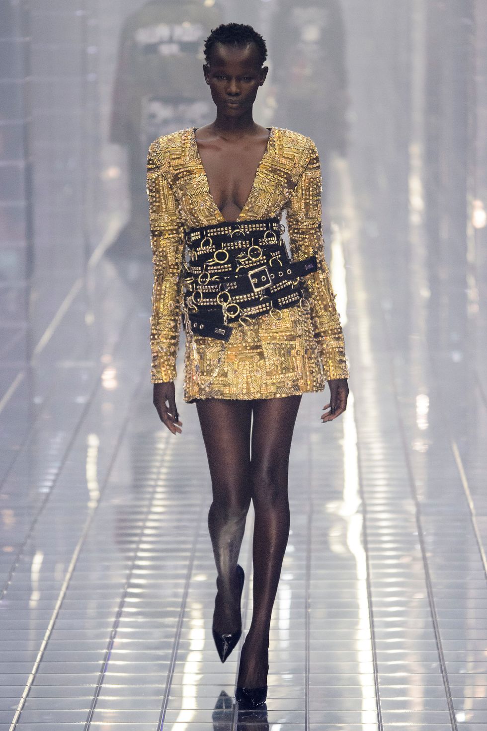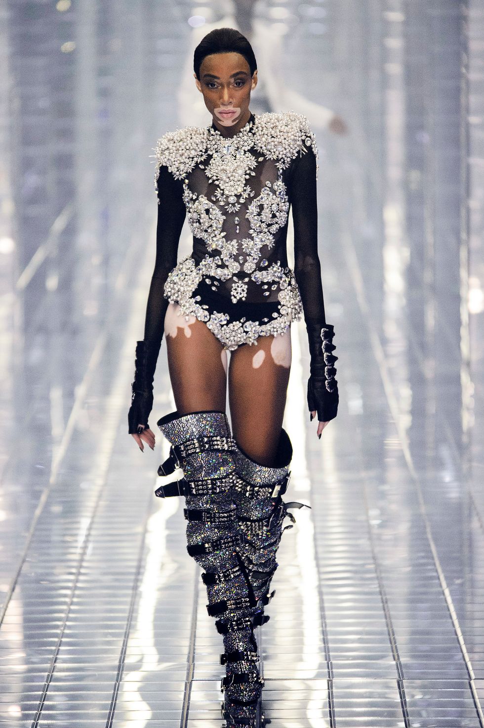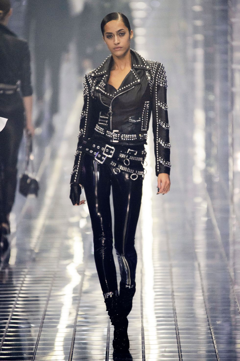 Philipp Plein's spring 2019 show in Milan was, as is his trademark, completely over the top. The show, a tribute to Michael Jackson, included several nods to the King of Pop – rhinestones glittered on booties, socks, and jackets, and Alton Mason even danced like the iconic performer. Models stomped down a mirrored runway in light-up LED sneakers reading "Philipp Plein," and the clothes, as per Plein standards, were very, very sexy, with a light touch of biker style.