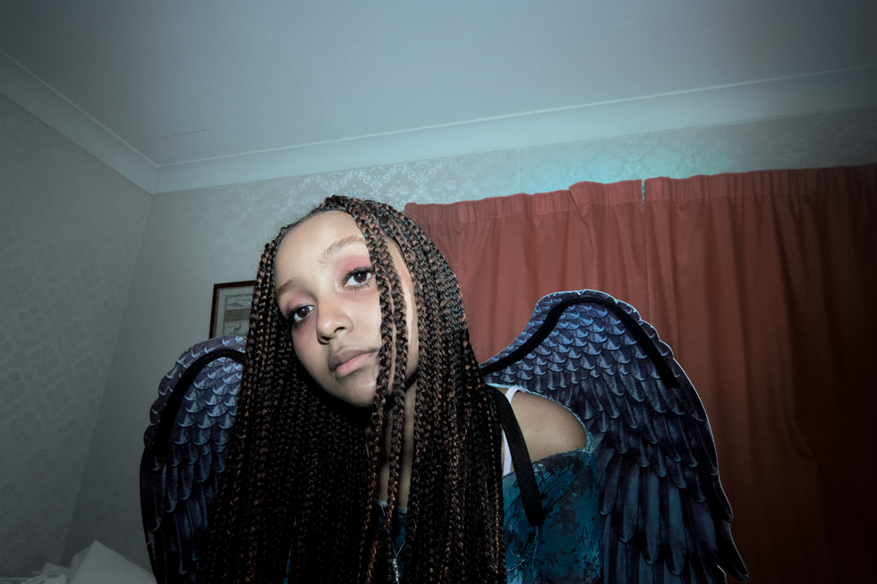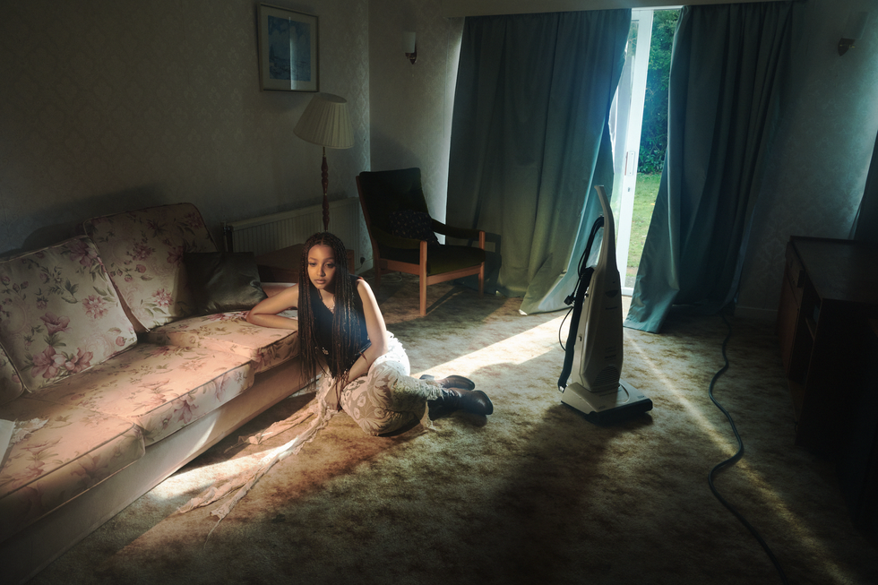 The artwork for her debut project, a glossy 10-track mixtape called to hell with it (released October 15), sees PinkPantheress posing dramatically in front of a white picket-fenced house in the middle of the night, as lightning strikes in the background. A haunting visual, it's inspired by the rich, saturated photography of David LaChapelle and sinister, suburban tableaux of Gregory Crewdson.