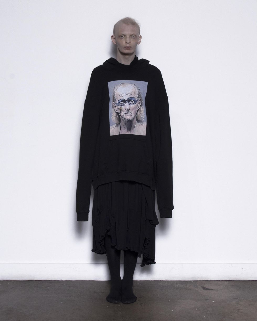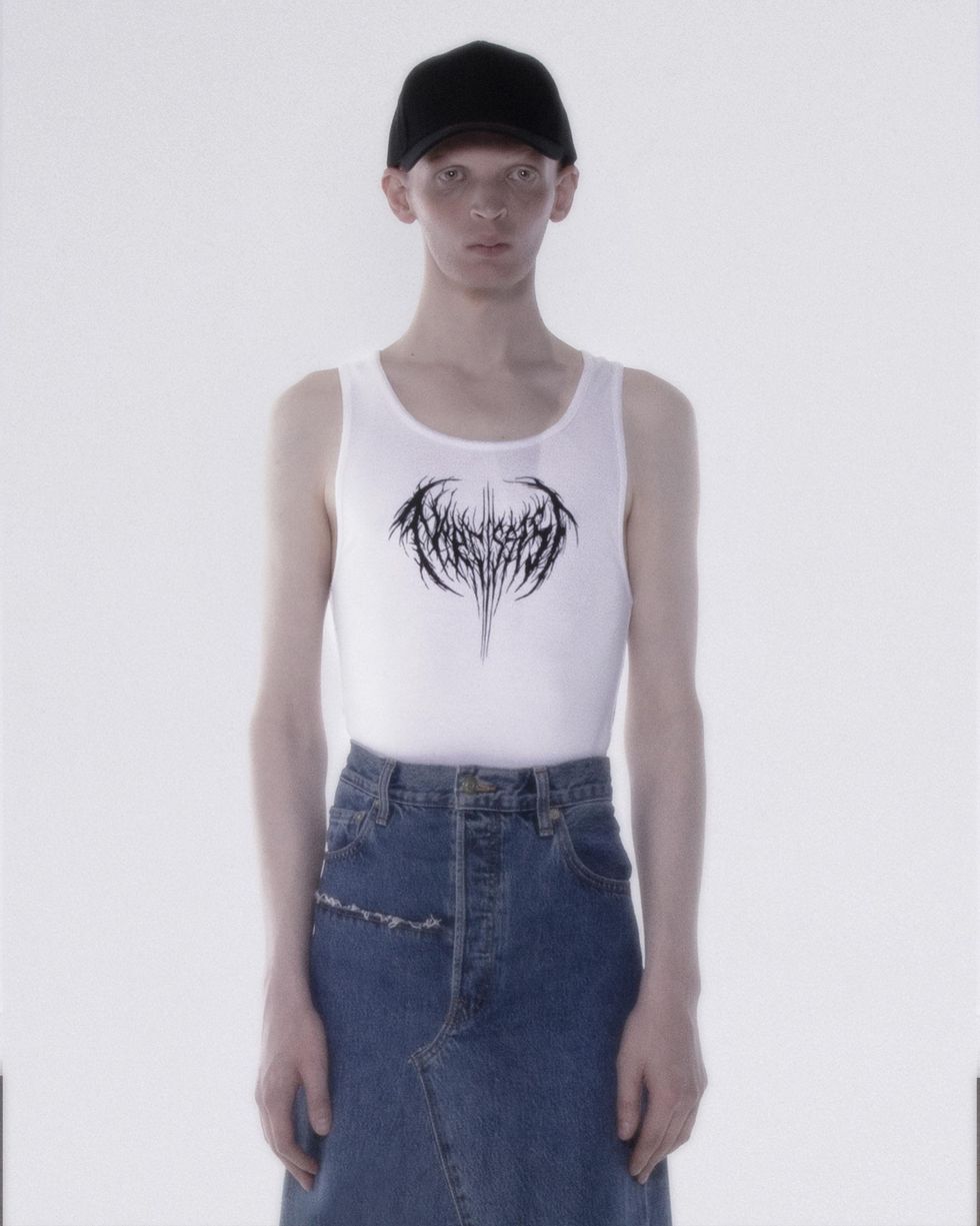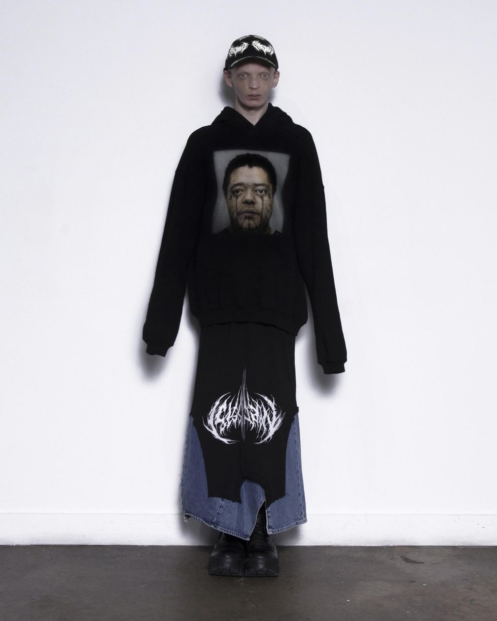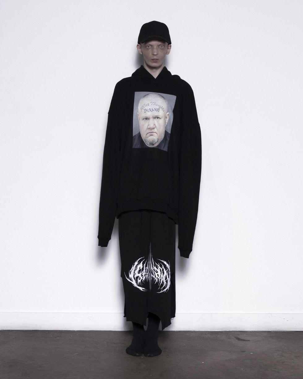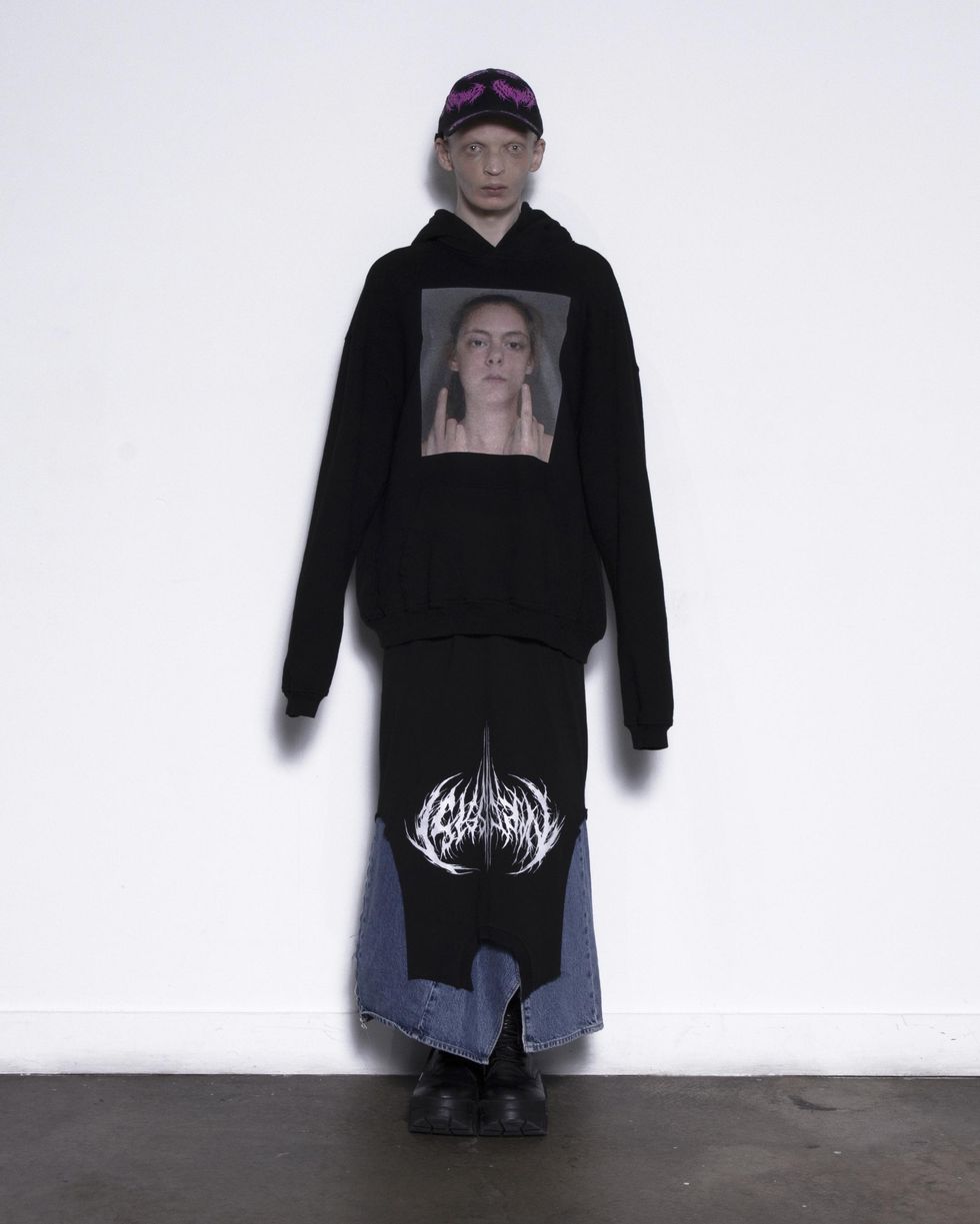 The 26-year-old rapper and model’s latest merch drop isn’t really a merch drop at all: it’s Narcissist, a new nine-piece cut and sew collection featuring a selection of striking hoodies, hats, singlets and tees. This week’s initial drop is the first of many: there are denim maxi-skirts on the way, as seen in the photos for the initial drop, as well as, Carti tells PAPER, a wedding dress. The first run of pieces, though, keeps things simple, with classic oversized silhouettes, the spidery Narcissist logo and a handful of intriguing mugshots.