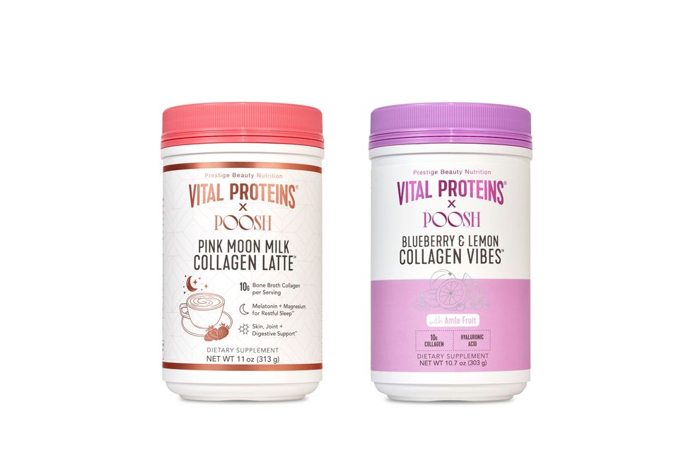 Kourtney Kardashian's Poosh website launched a month ago, and has already given us so much: candid interviews with Kris and Kendall, a revealing chat with Scott Disick about co-parenting, a momager-approved brownie recipe, and plenty of Calabasas beauty and wellness secrets. Now Kourt has revealed her first two Poosh products, in collaboration with cool girl collagen brand Vital Proteins. Poosh x Vital Proteins launches today with a protein-packed daytime powder meant to be taken in the morning, as well as a relaxing night time anxiety remedy. Both contain peptides meant to plump up the skin and increase elasticity.