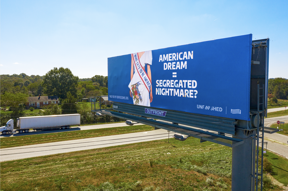 The billboard is a part of a nationwide initiative by the art collective For Freedoms called "2020 Awakening," which partnered with different artists to erect billboards in each of the 50 states that touch upon issues of the current campaign cycle to encourage "deep thinking and self reflection" (it kicked off during Indigenous People's Day on October 12).