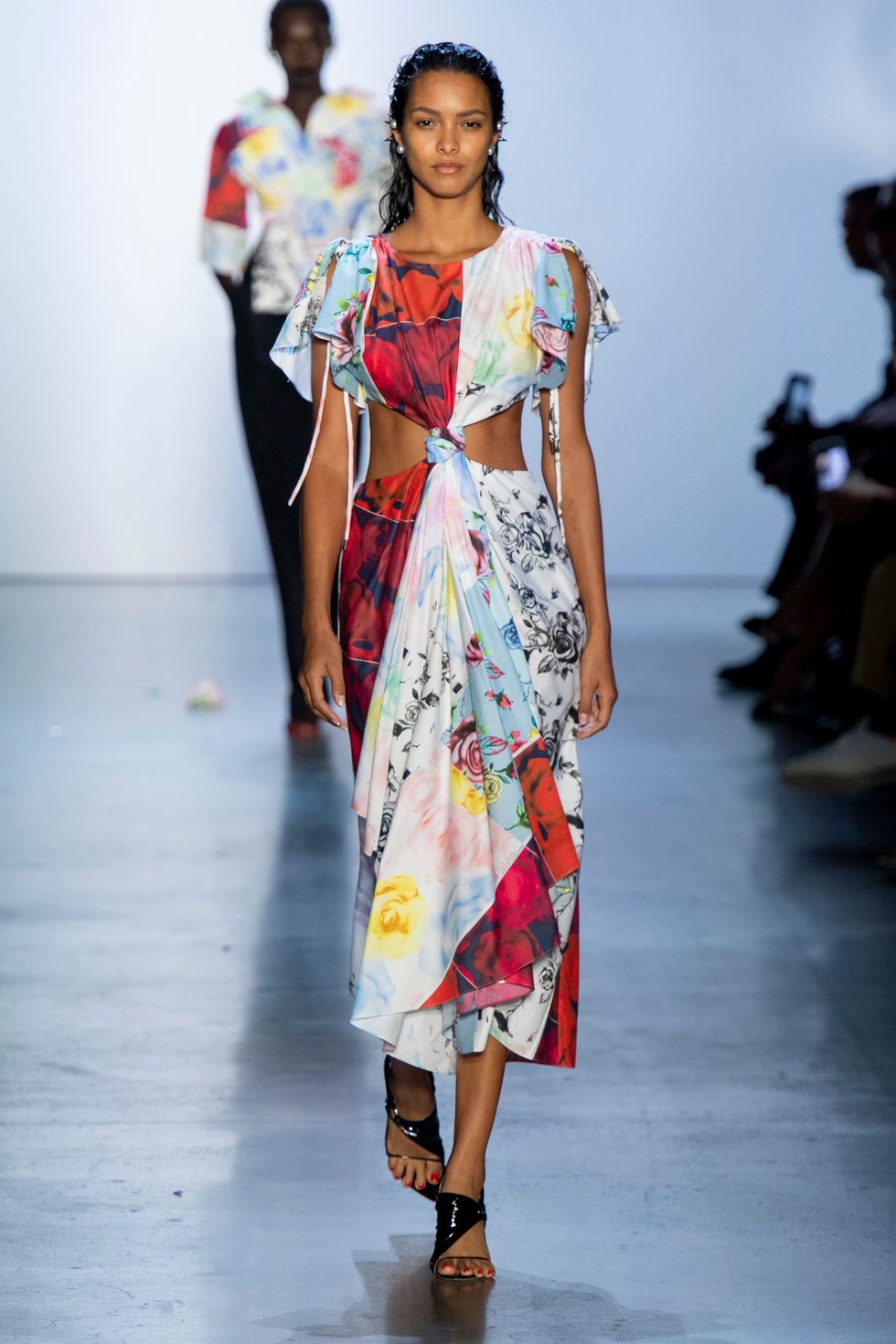 Thigh-high slits, and sexy cutouts revealed some peekaboo skin on asymmetrical printed dresses with some knot details added in for good measure.