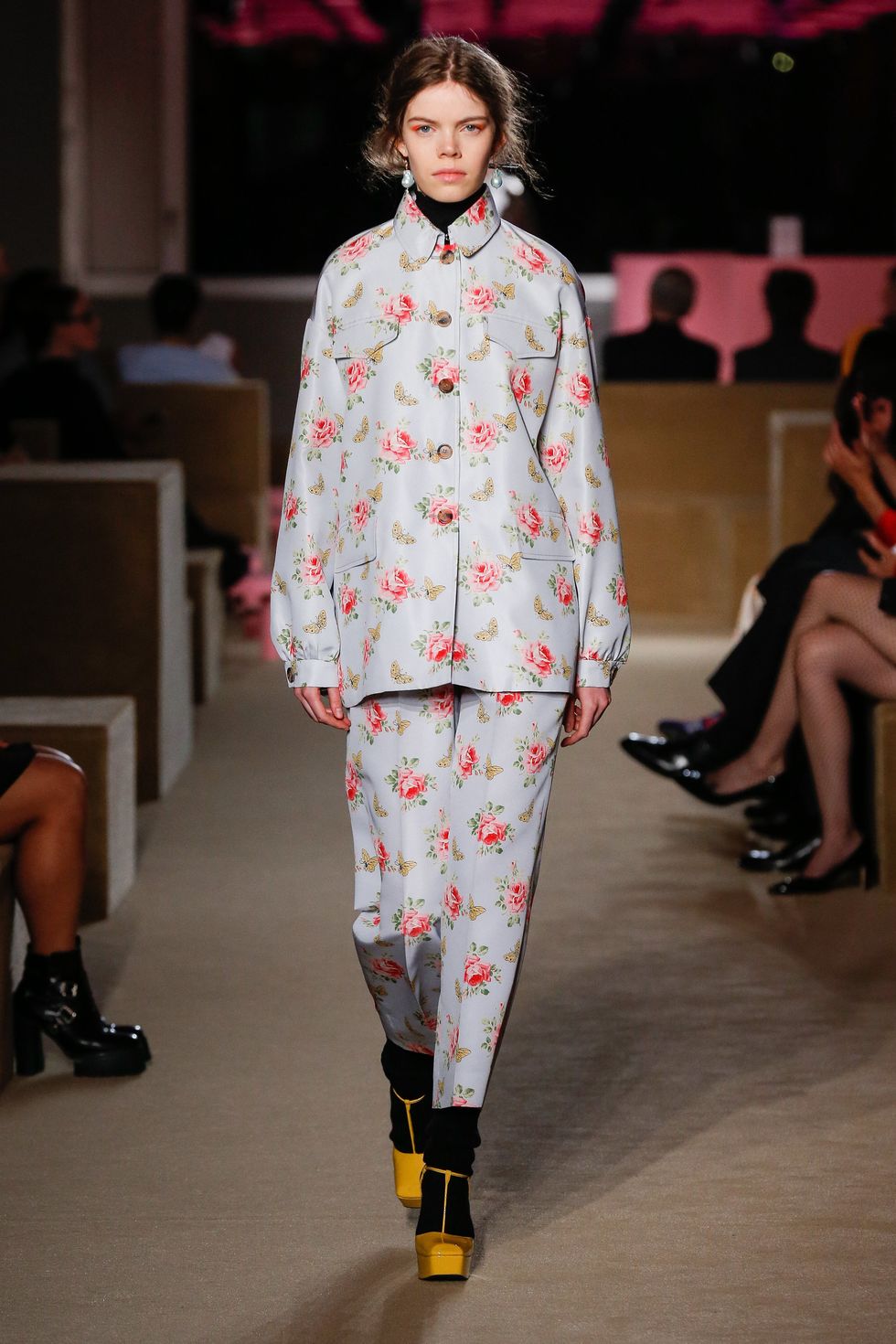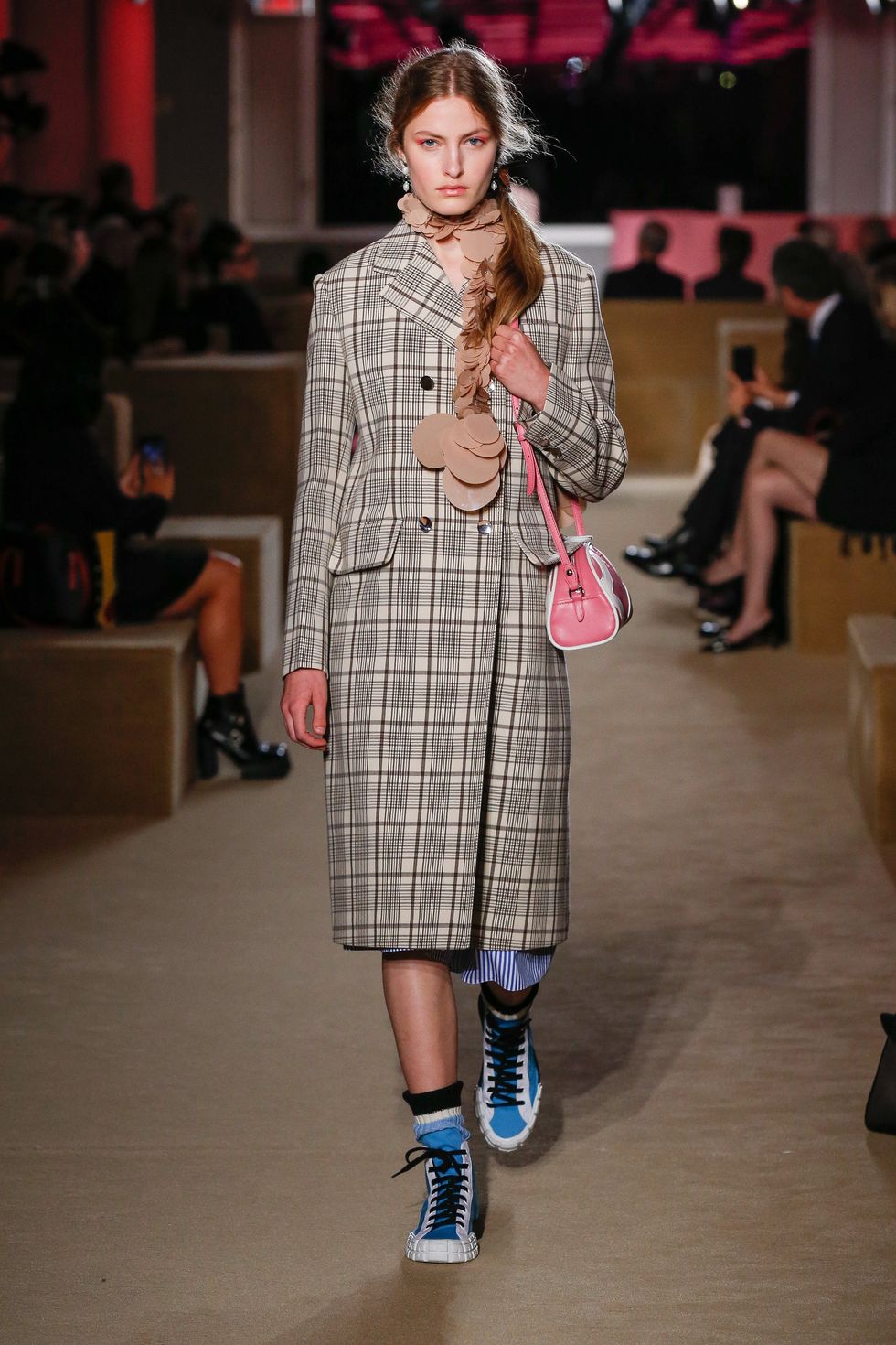 Sending out layered looks in contrasting plaids and stripes or patterned with micro-florals, the heavily tailored (sometimes even pleated) collection was topped off by some striking accessories. There were paillette scarves and beanies, baroque pearls, bright striped socks, drop earrings, backpacks, and the timely reintroduction of the brand's iconic Bowling Bag in time for the 20th anniversary of its release.