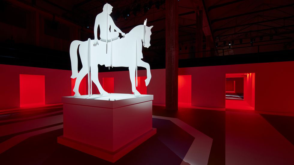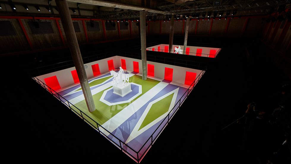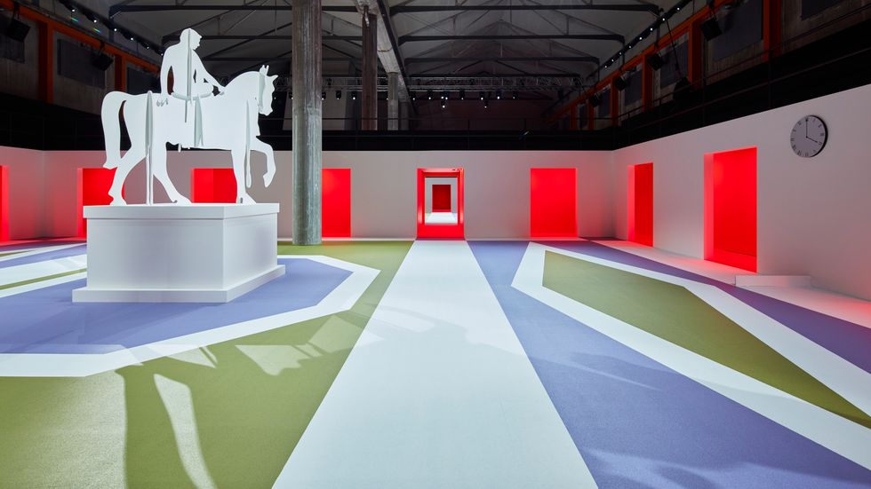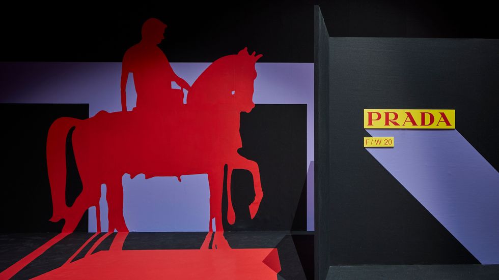 Noted architect and Prada collaborator Rem Koolhaas designed the set for the show by way of his AMO studio. The set was comprised of two piazzas with multi-colored, geometric flooring and a statue of a man atop a horse and podium. "I wanted an equestrian statue, but of course equestrian is not politically correct," Mrs. Prada told reporters backstage, per Vogue. "So I told Rem [Koolhaas], 'Let's do an equestrian that is totally non-heroic.'"