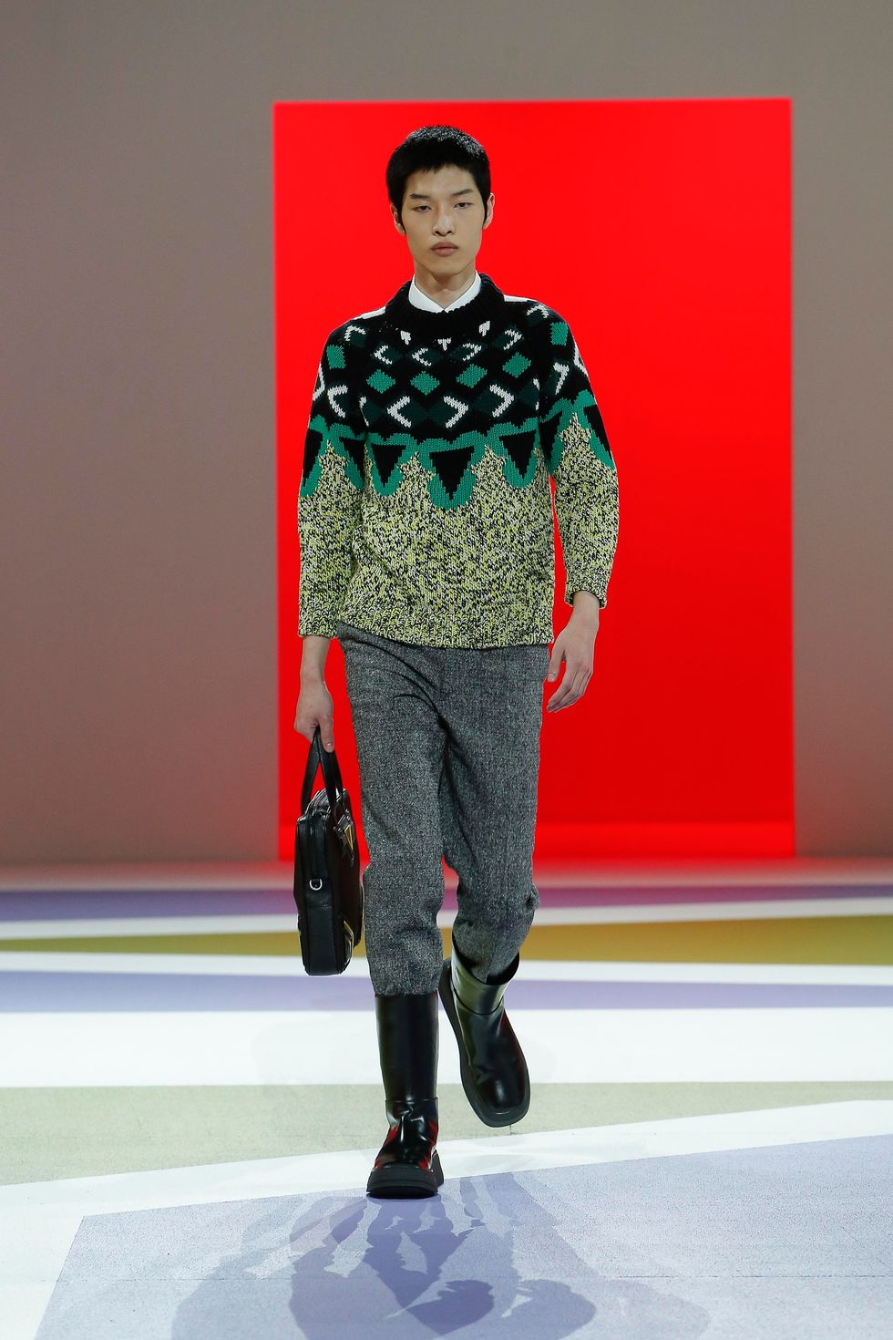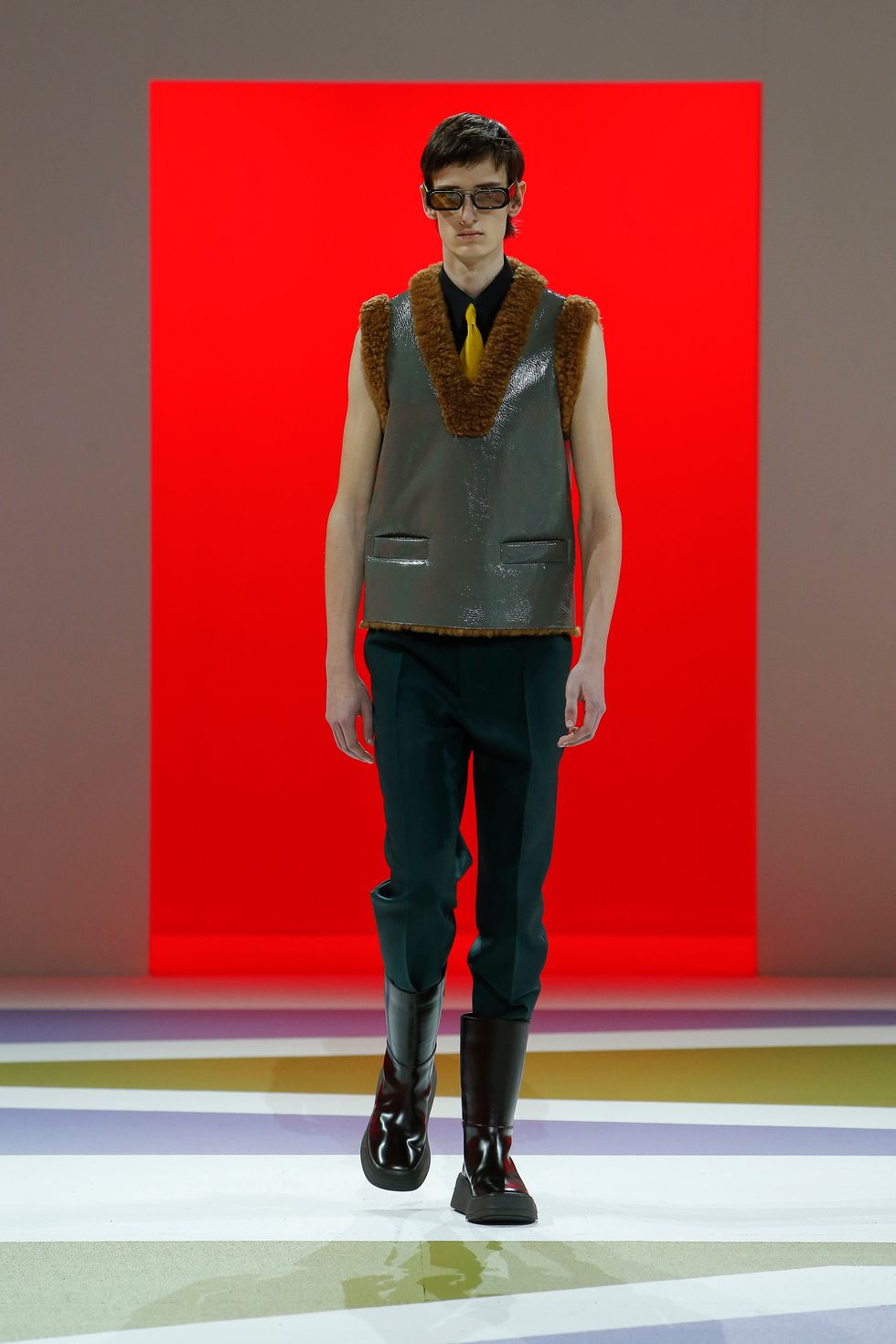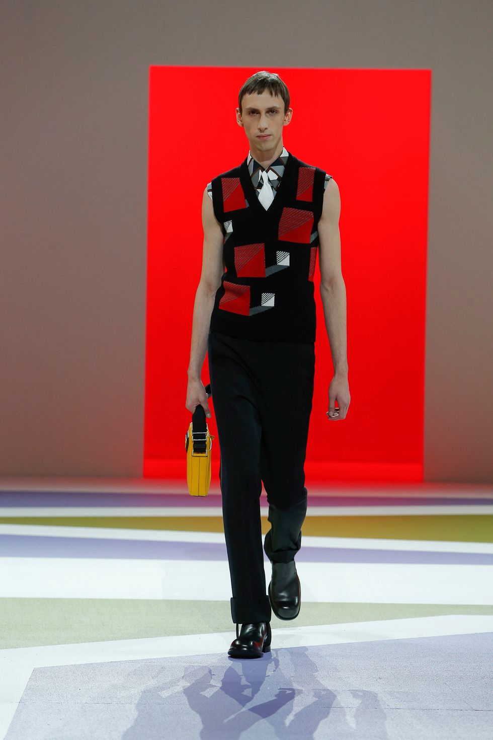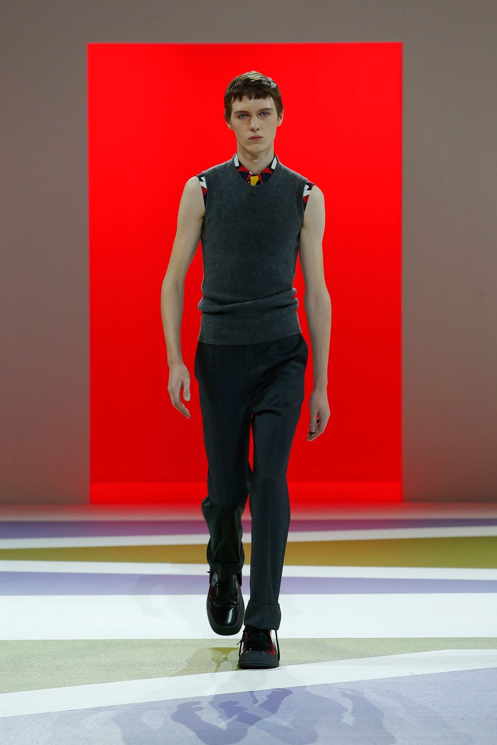 Prada's boys will apparently be baring their entire arms this fall, if the brand's fitted sweater vests/sleeveless button-downs are anything to go by. But it was the variety of professional-looking dress styles that emerged as one of the biggest themes, with three-piece suits, corduroys, acid-hued coats, and sporty nylons all making up the new mode of workwear. Words like "surreal," "postmodern" and "metaphysical" made up the show notes, encompassing Prada's cerebral and conceptual approach to designing classic staples.