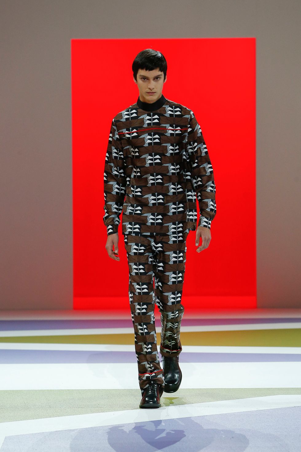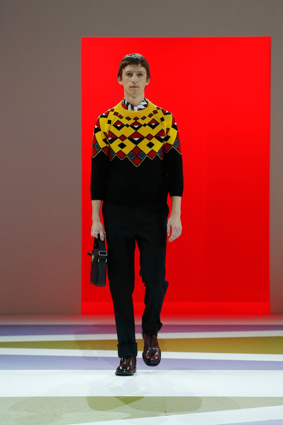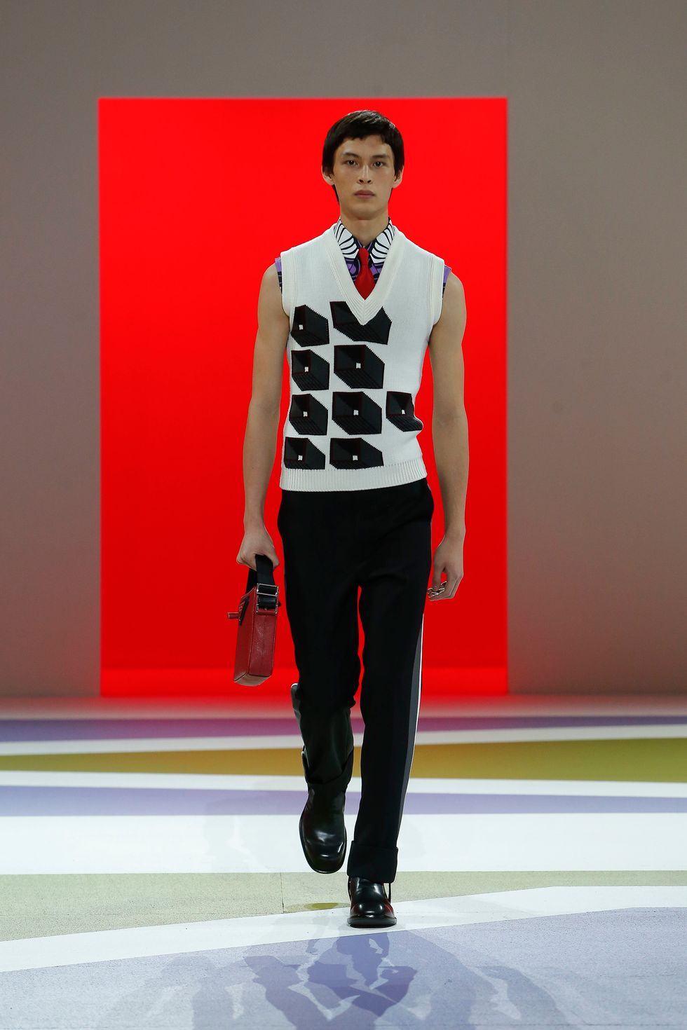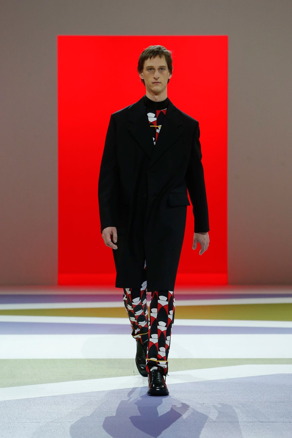 Prada's boys will apparently be baring their entire arms this fall, if the brand's fitted sweater vests/sleeveless button-downs are anything to go by. But it was the variety of professional-looking dress styles that emerged as one of the biggest themes, with three-piece suits, corduroys, acid-hued coats, and sporty nylons all making up the new mode of workwear. Words like "surreal," "postmodern" and "metaphysical" made up the show notes, encompassing Prada's cerebral and conceptual approach to designing classic staples.