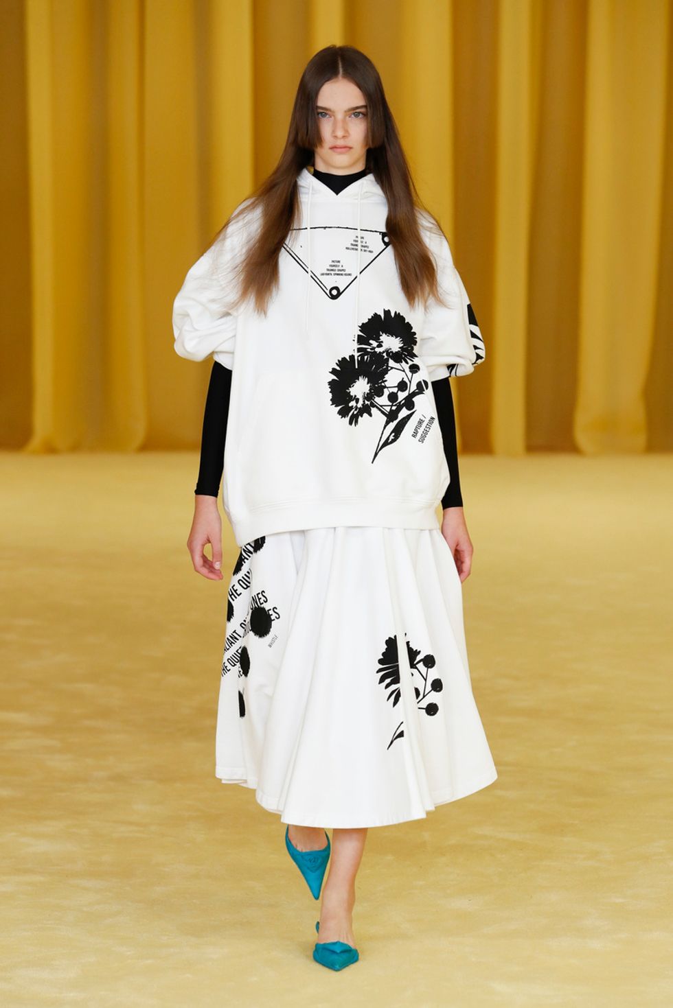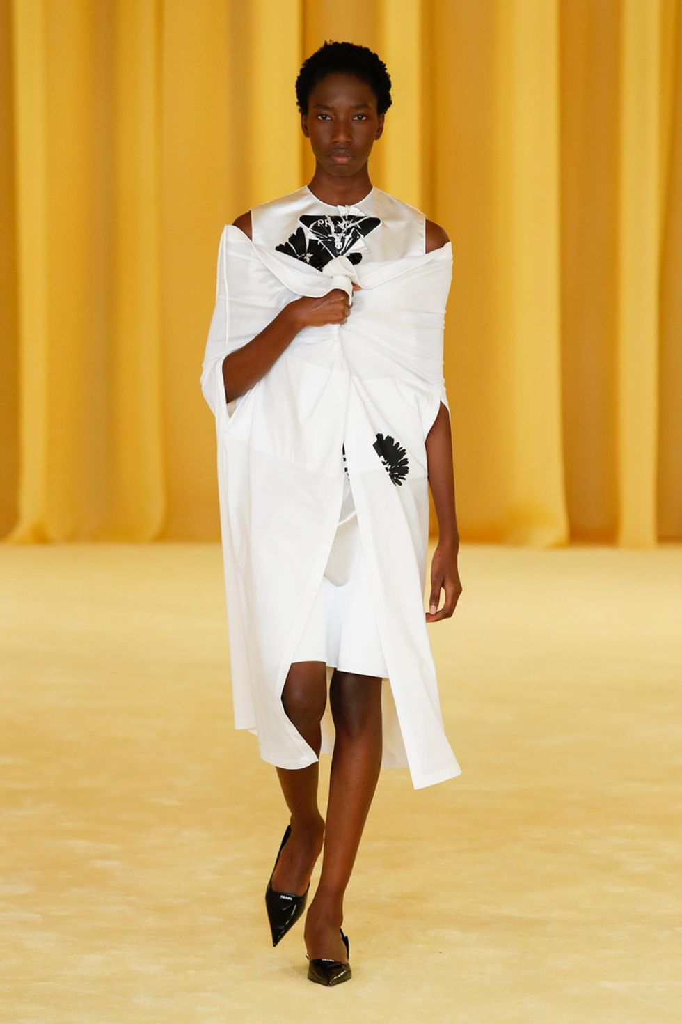 Elsewhere, a series of graphic artworks created by Peter de Potter (a longtime collaborator of Simons) were applied over archival Prada prints, while a rectangular wrap fastened around the torso by a single hand was quintessentially Miuccia, a gesture she explored in her final collection as solo creative director last season.