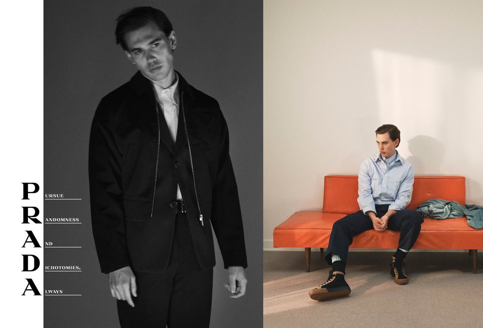 The images, shot by photographer David Sims in LA, showcase two photos of Ocean juxtaposed against each other, including a photo of him wearing a bolo tie and looks from the spring collection. In addition, the word Prada is used as an acrostic poem, spelling out phrases coinciding with the campaign subjects. (Ocean's includes "Programming Rhythms And Dancing Again.")