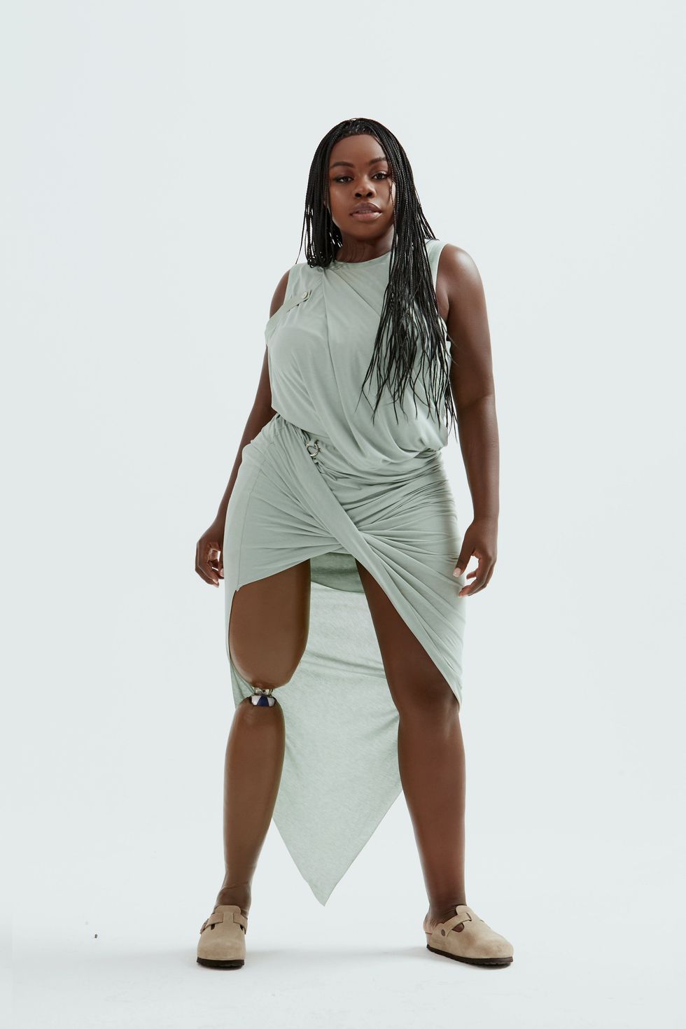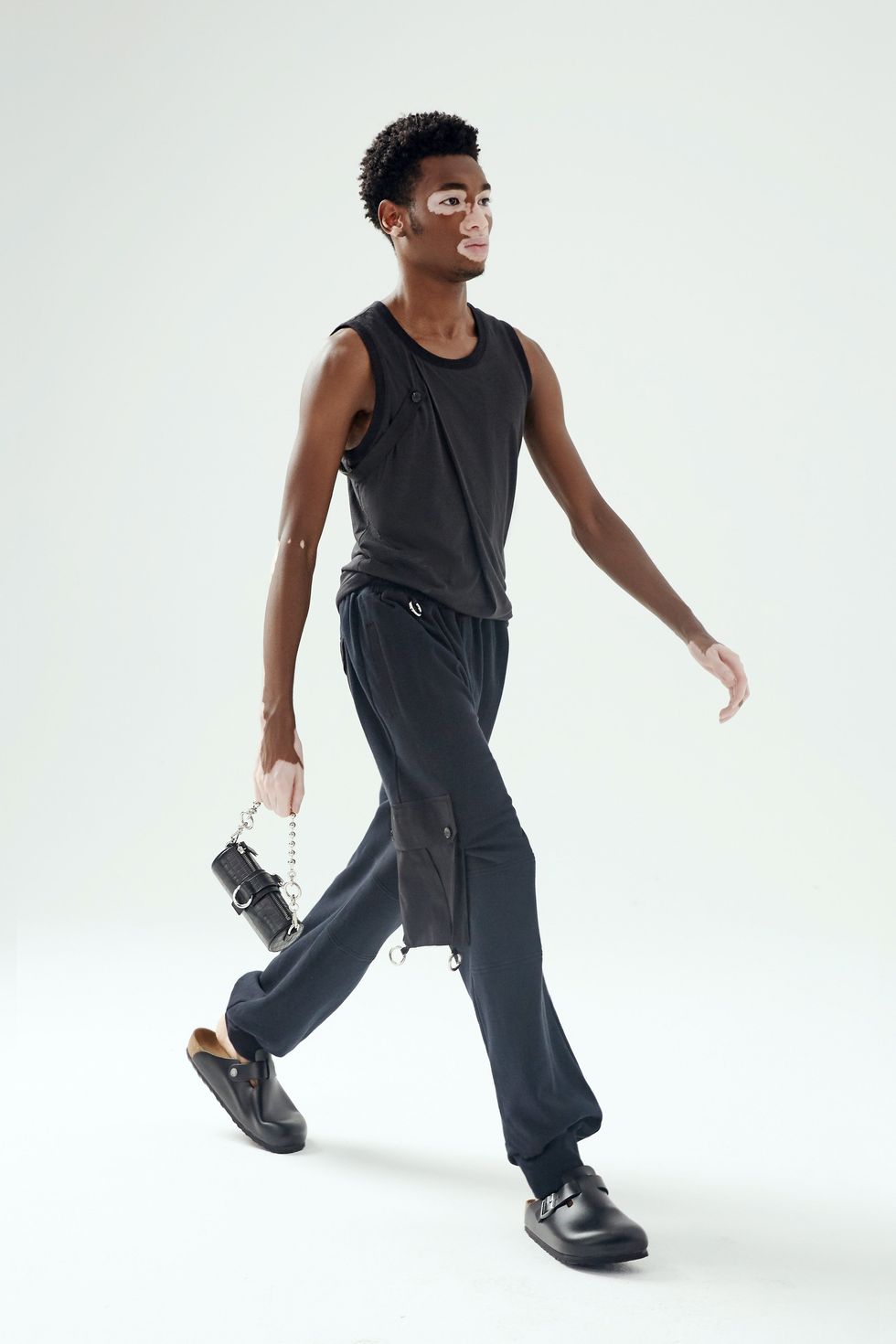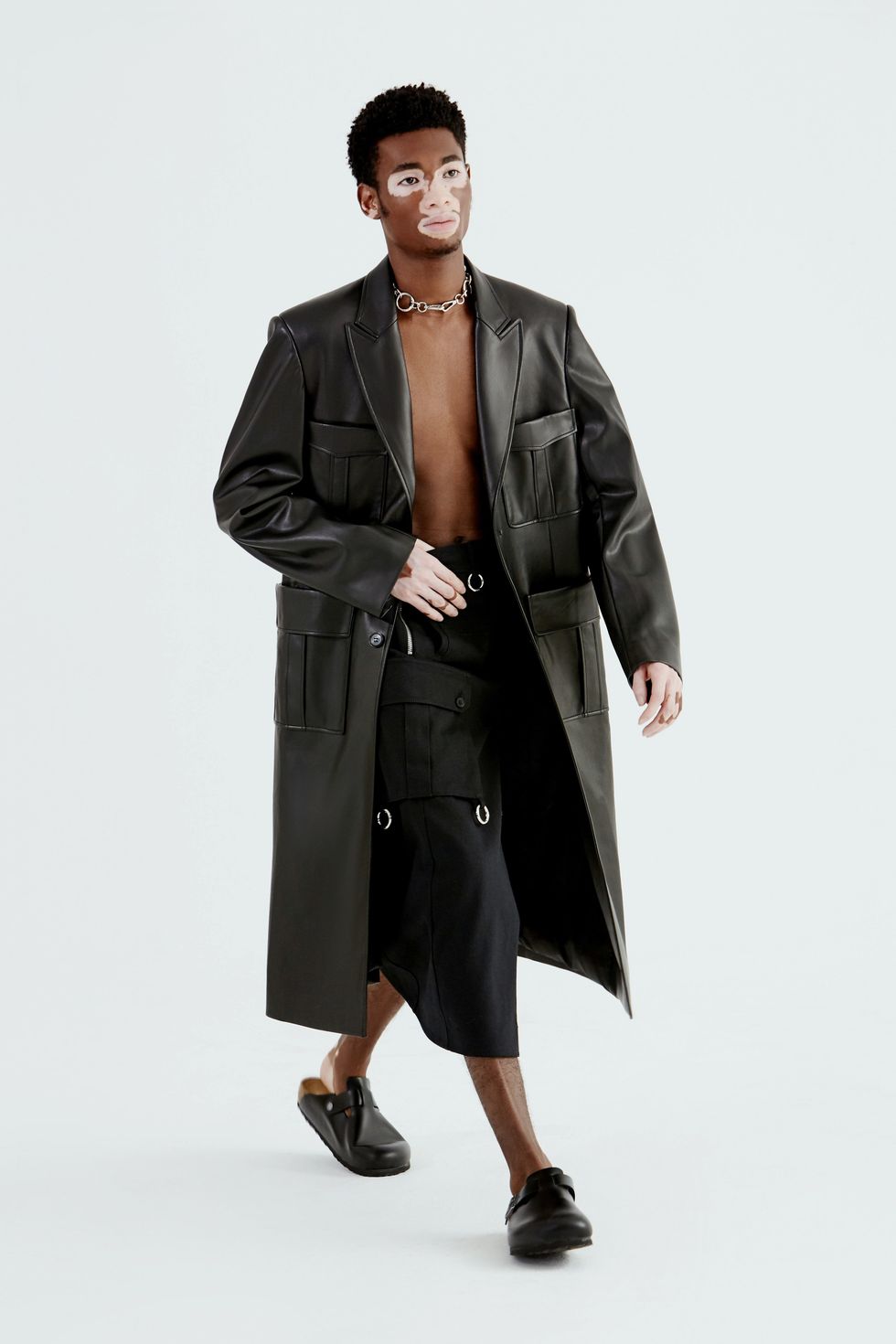 Calvin Klein star Yvesmark Chery, whose vitiligo is redefining male beauty, strutted in a broad-shouldered leather coat. Amputee model and musician Marsha Elle posed in a white trench and green jersey tank and skirt. Dominique Castelano, who dedicated her inclusion to "all the hot queer Asians," strutted in a sheer top and faux leather pants.
