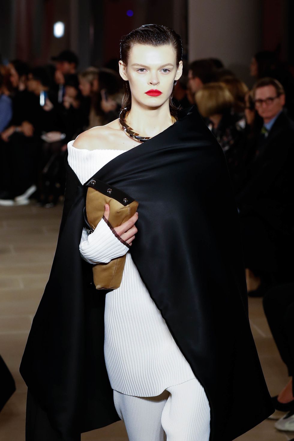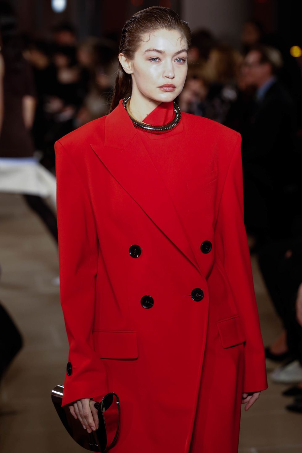 Kendal struck the right tone by keeping the skin dewy, the hints of all-over highlighter further enhanced with a bright matte red lip. "This season was all about the '90s," she told PAPER. "So we're doing gorgeous, luminous skin, brushing the eyebrows, filling in when necessary, curling lashes, and using a little bit of lip balm on the top of the cheeks to really give that feel. And then some girls are getting a bold red lip. It's completely matte too, so it looks very modern especially against the dewy skin and wet hair. "