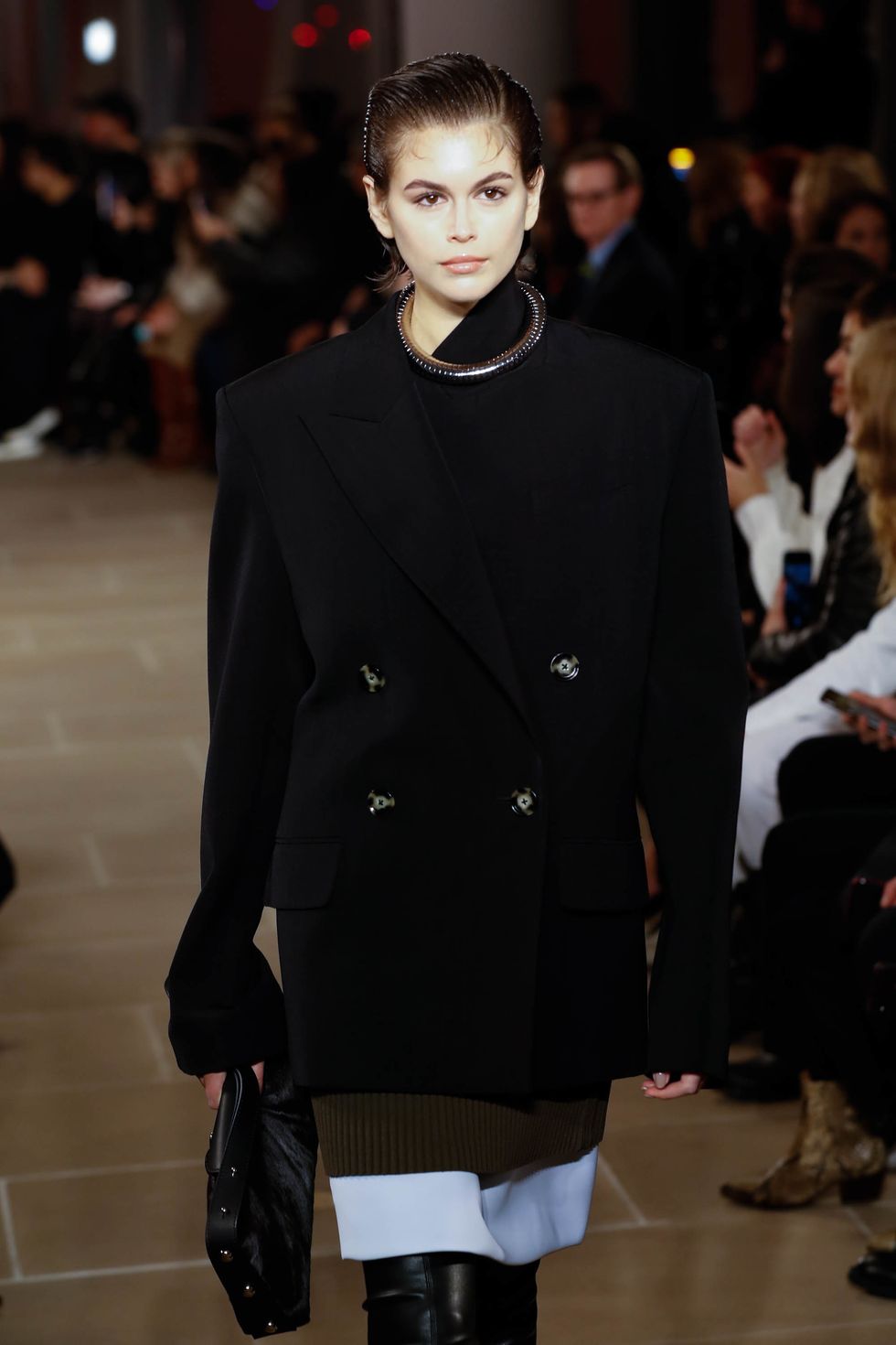 Palau stayed true to the mid-'90s aesthetic, while turning the heat up a notch, sculpting slicked back hairdos. "I am inspired by mid-'90s, kind of strong, sexy, boyish women in a way," he told PAPER backstage. "It's a very tough gesture. It's like greasy and wet-looking. There's comb marks, there's that point where girls always want to go a little boyish. So this is an extreme version of this."