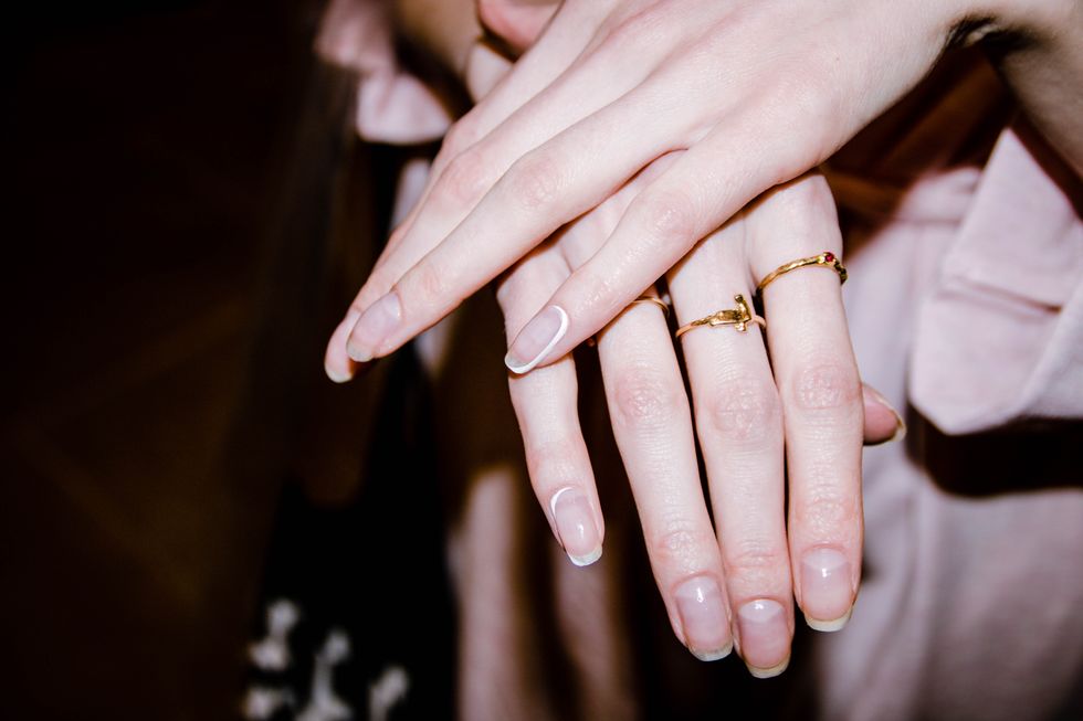 "It looks really good on everybody and it's just really cool and edgy," she explained backstage. "The main look today is called 'Milieu.' This one has a clear base, top coat, curved lines but only only on the pinky. The other one is the same but with a matte finish. So we have three looks, in a way very exciting, in a way very not exciting, but it's all about care, and also a hint of nail art on the pinky."