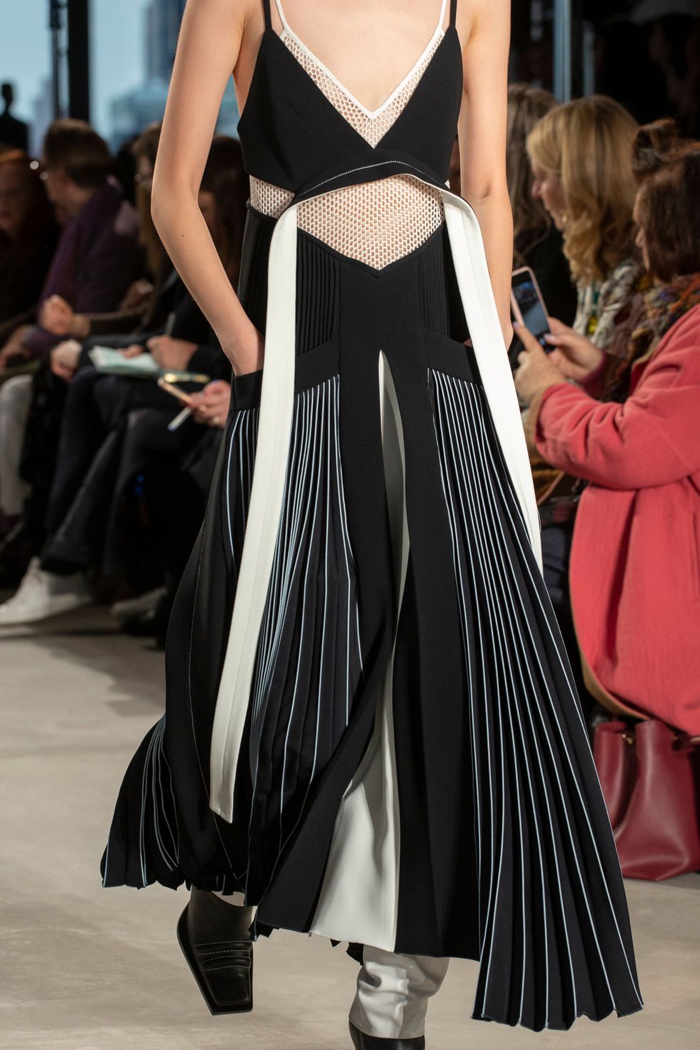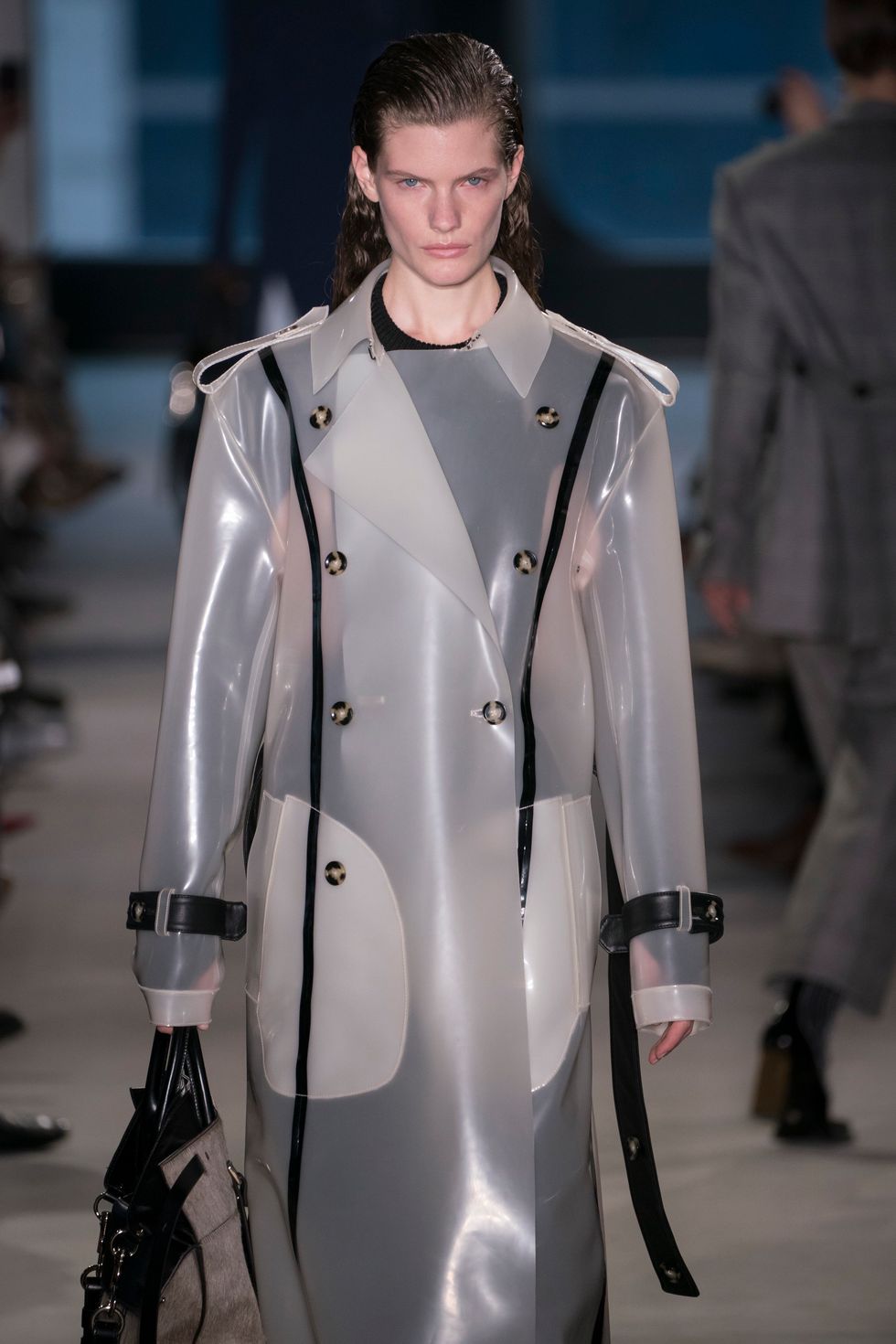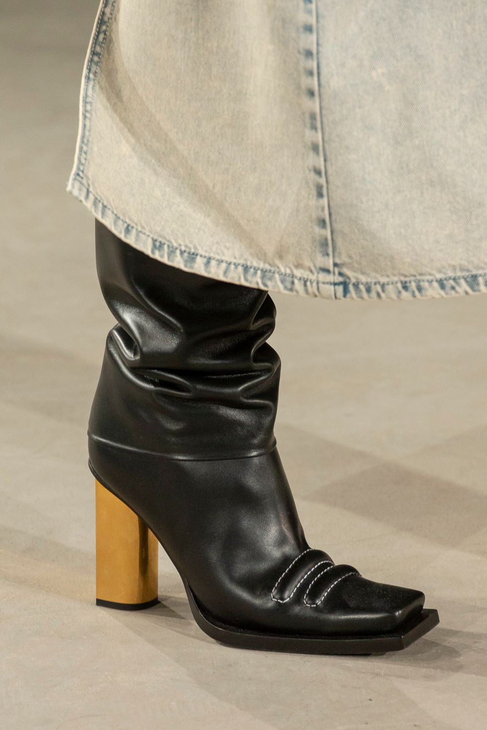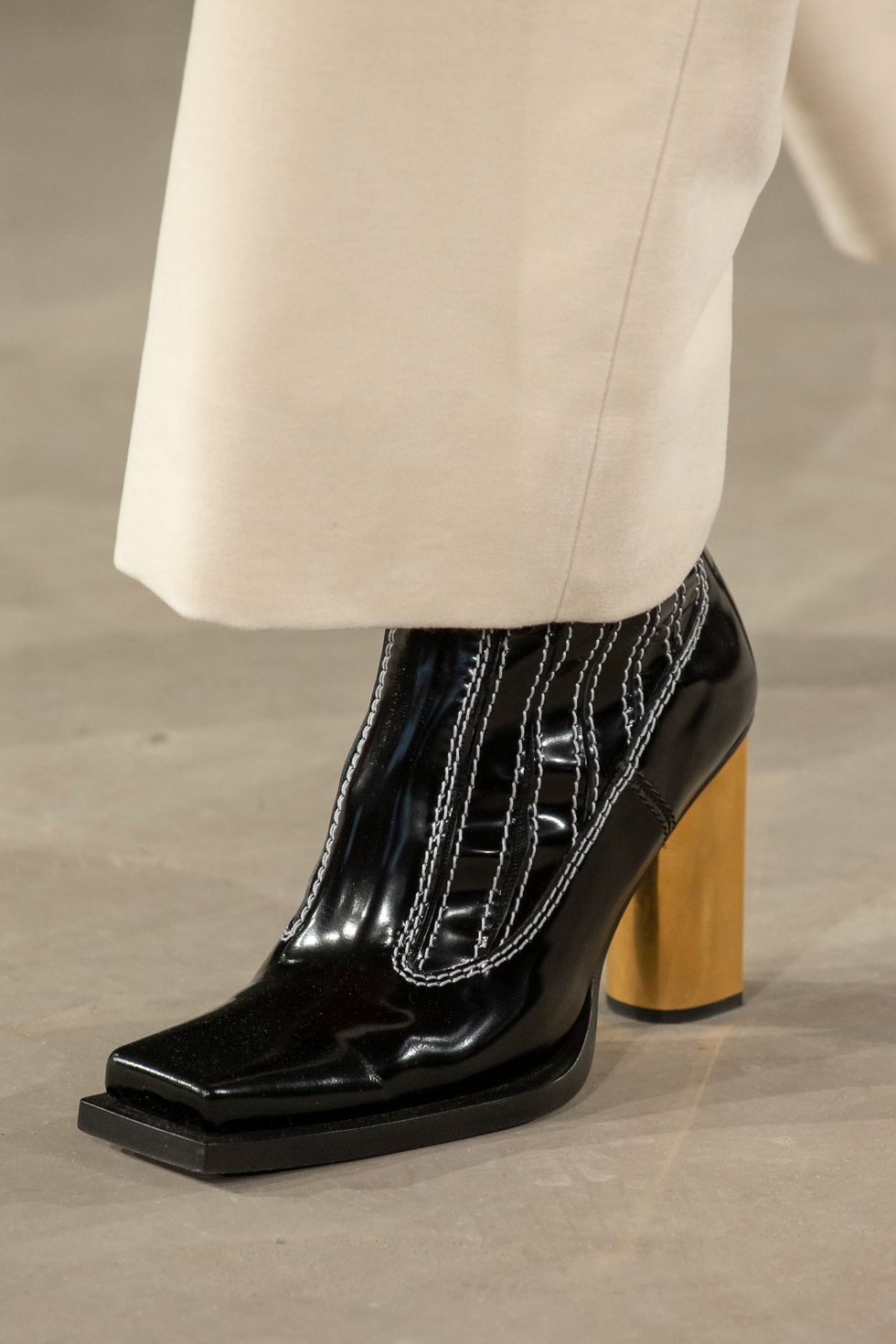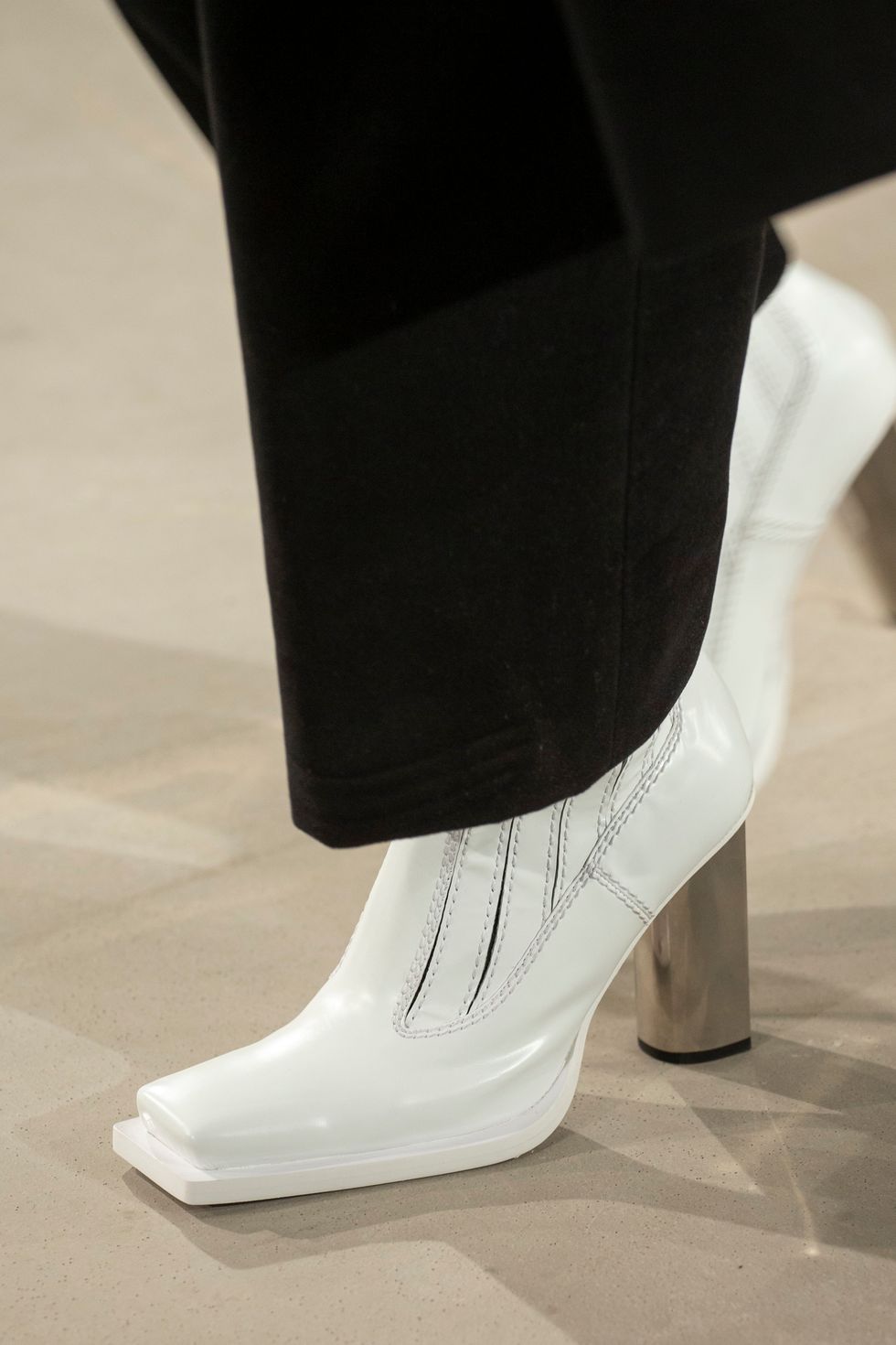 The co-gender show featured the most covetable pairs of leather square-toe shoes. In white and black, the chunky soles became a fixture of design. Some of the black options came with visible contrast stitching.