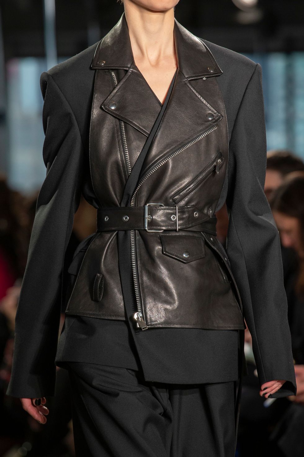 The fabrics in this collection looked particularly elevated and expensive — such as the chunky yet flattering knits. But none so much as the structural leather skirt and leather accented jackets and vests.