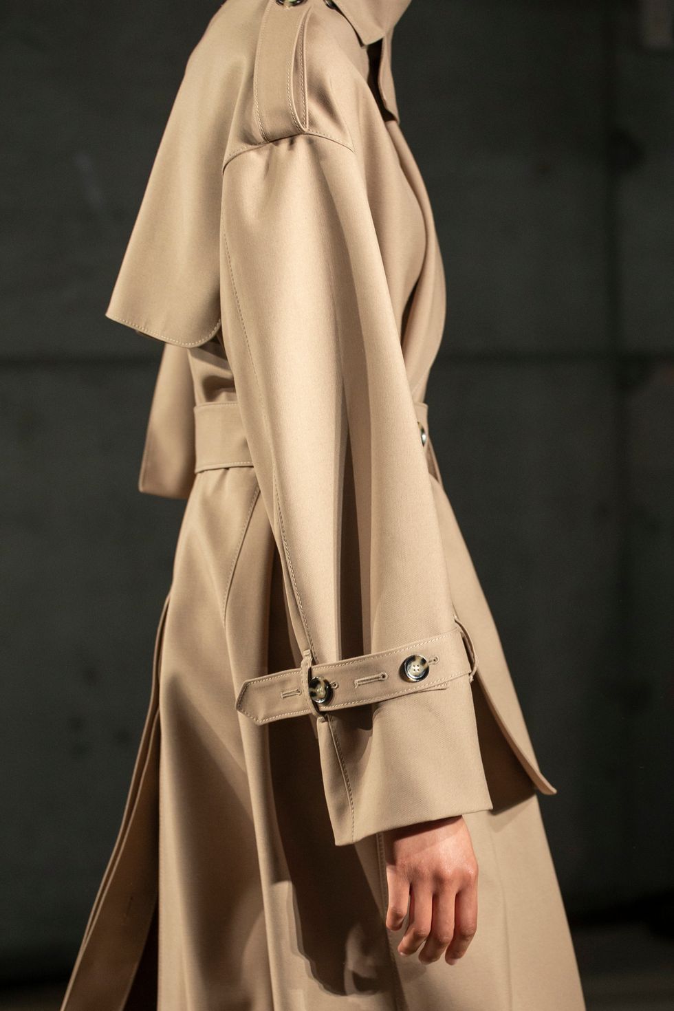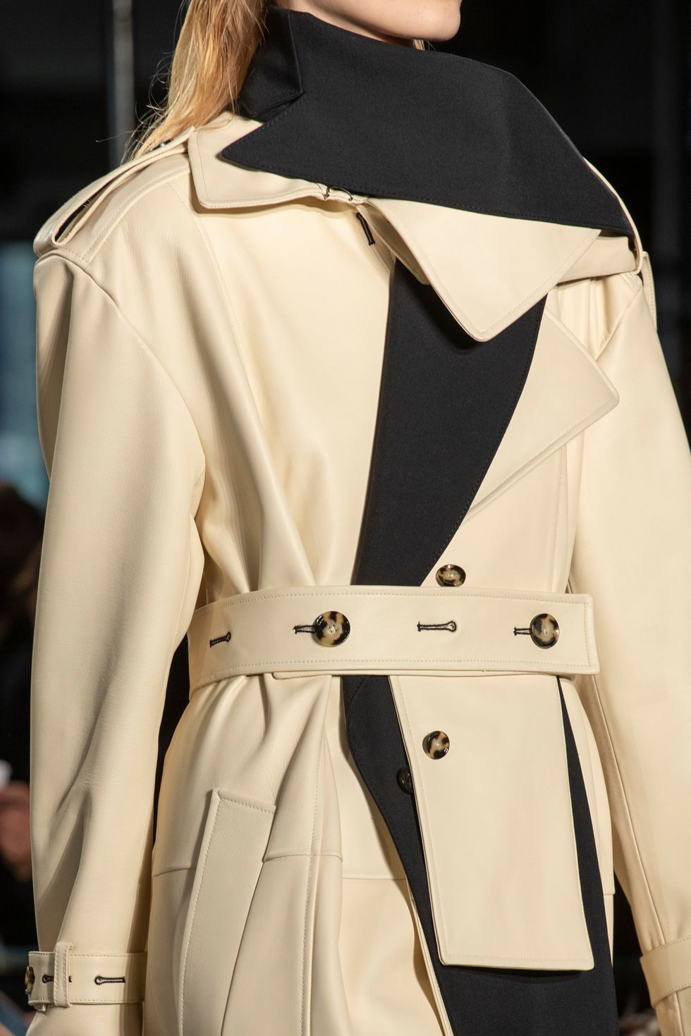 For men, the classic trench coat was oversized and accented with black fabric. For women, it was redone in leather with open shoulders and awkward, yet perfect hodgepodge of buttons.