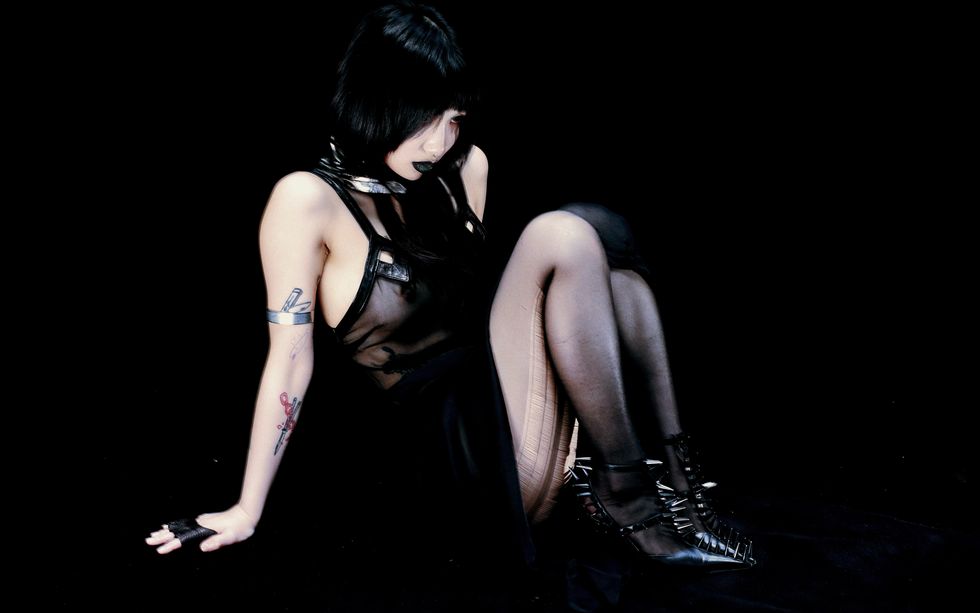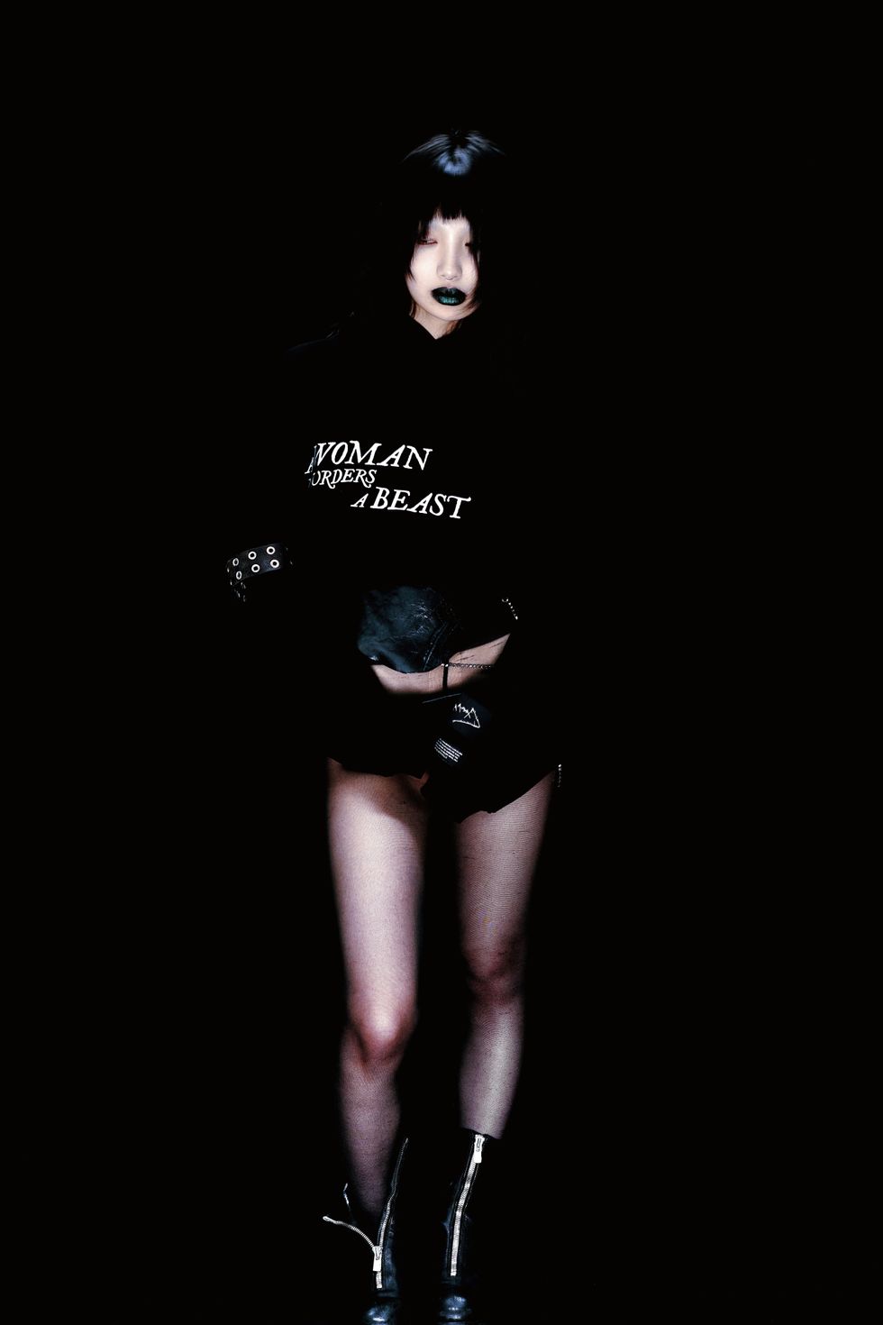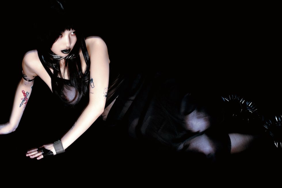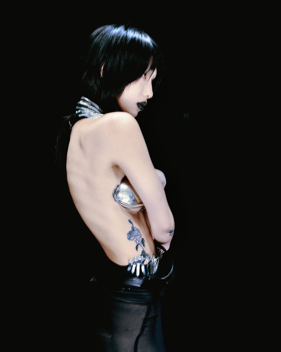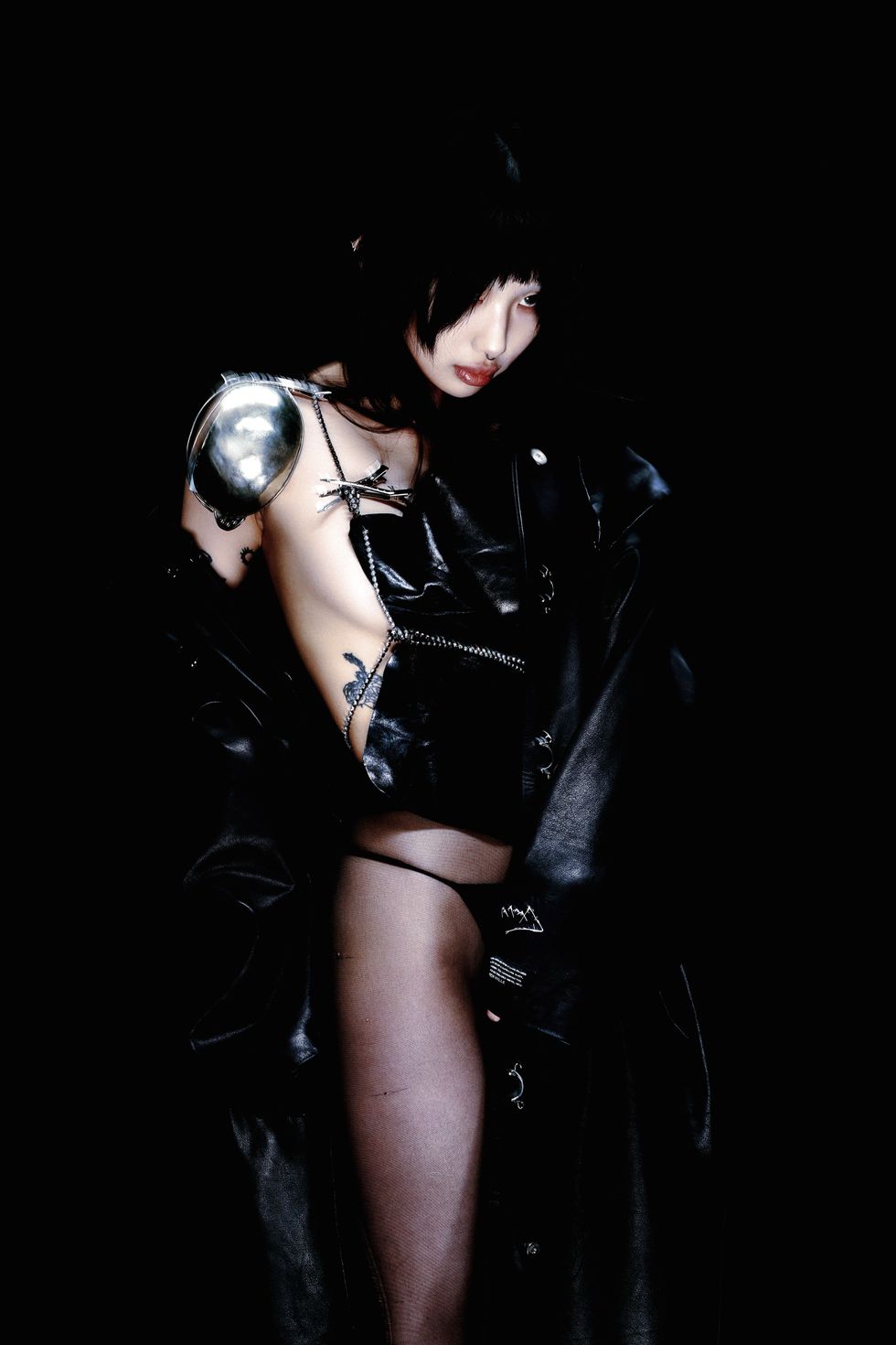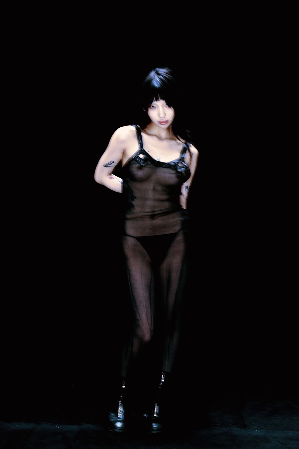 "The concept was to create a character bred from a state of confusion," Marks tells PAPER. "We wanted her to feel archival but futuristic, somber but void of emotion, real but completely fake. We wanted to place her in an abstract setting of entrapment and study, so her character feels like an experiment. We wanted to pose questions about the current direction of the human persona."