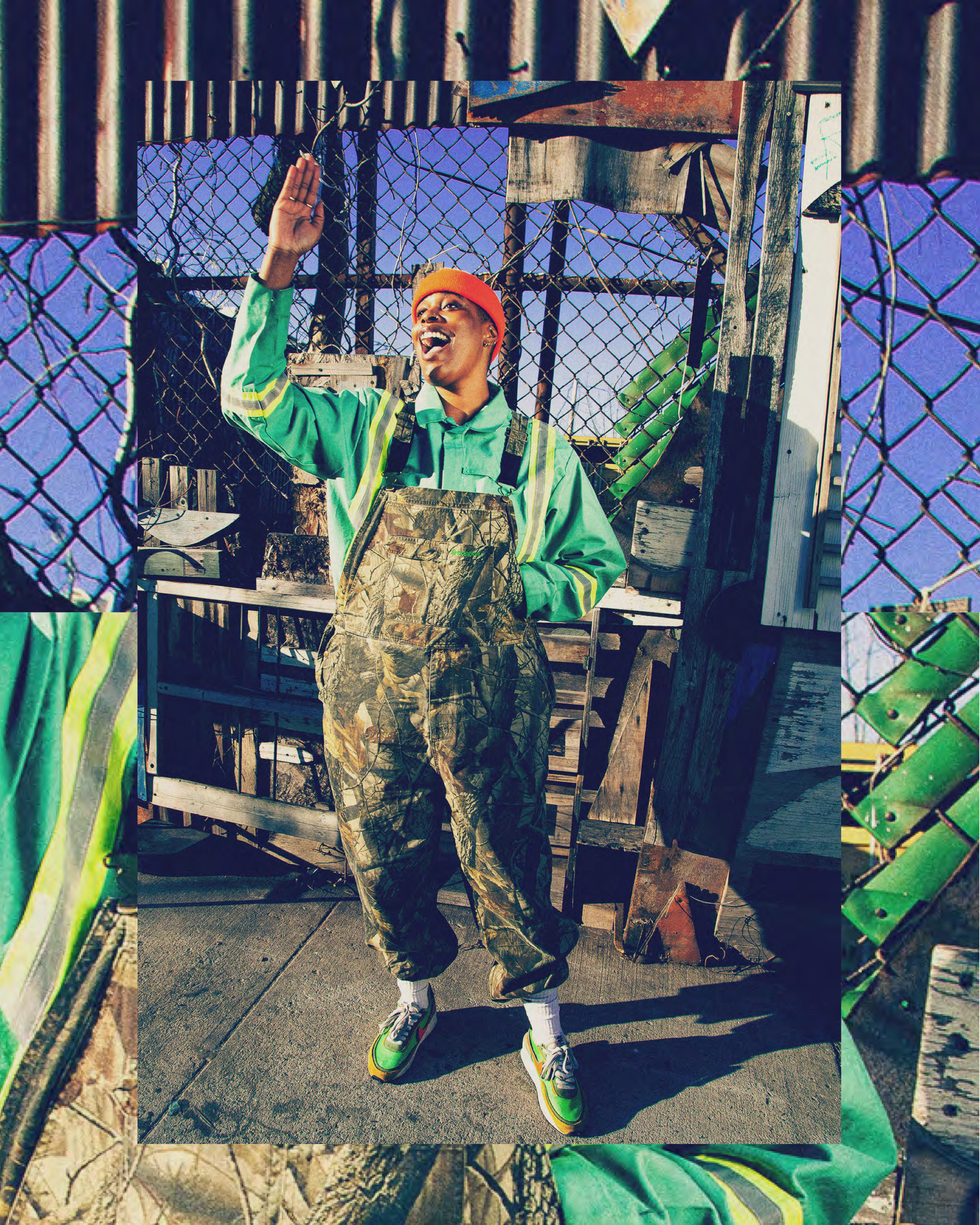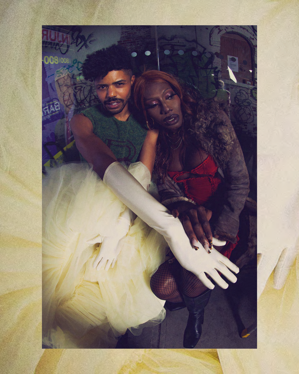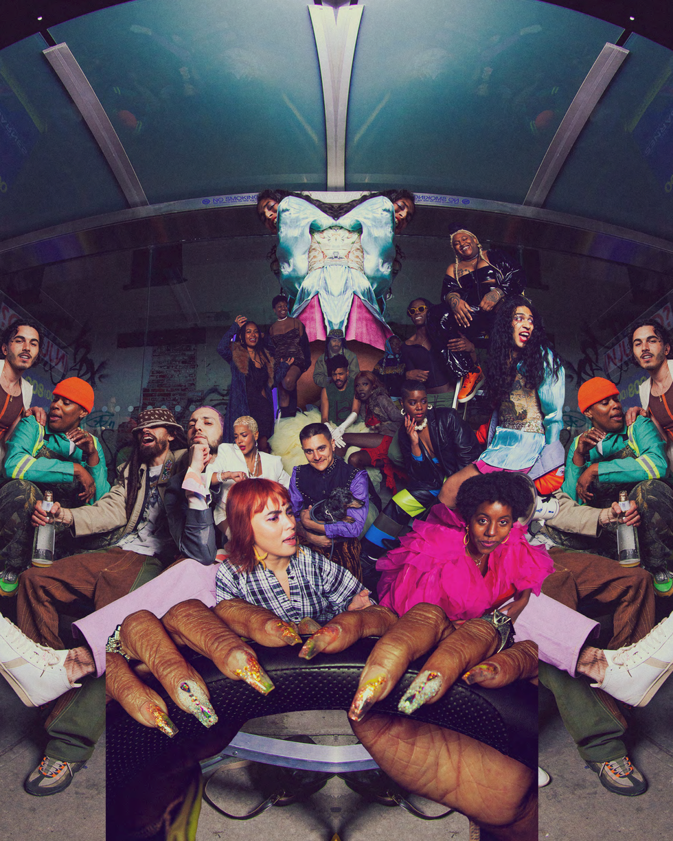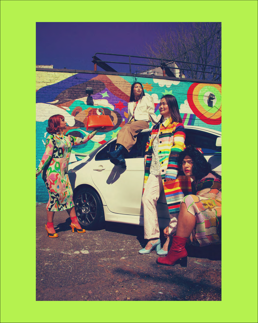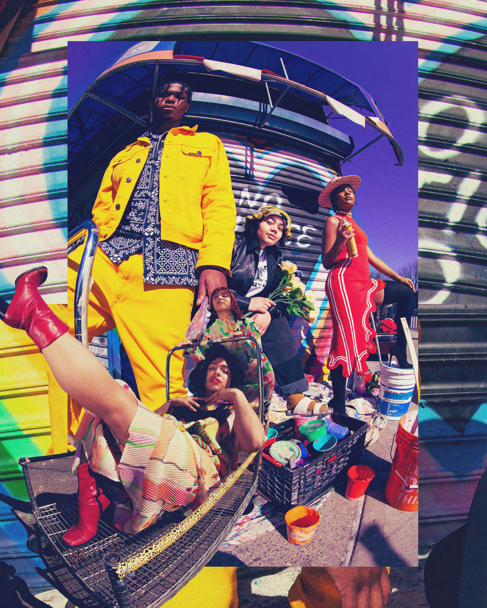 (On Jahel) Suit: Levi's, Shirt: Sacai (On Frida) Tee: Sacai, Shirt: Theophilio, Shoes: Coach (On Evie) Dress: PH5, Hat: Christian Siriano (On Caroline) Dress: Julia Heuer (On Bryan) Dress: Julia Heuer