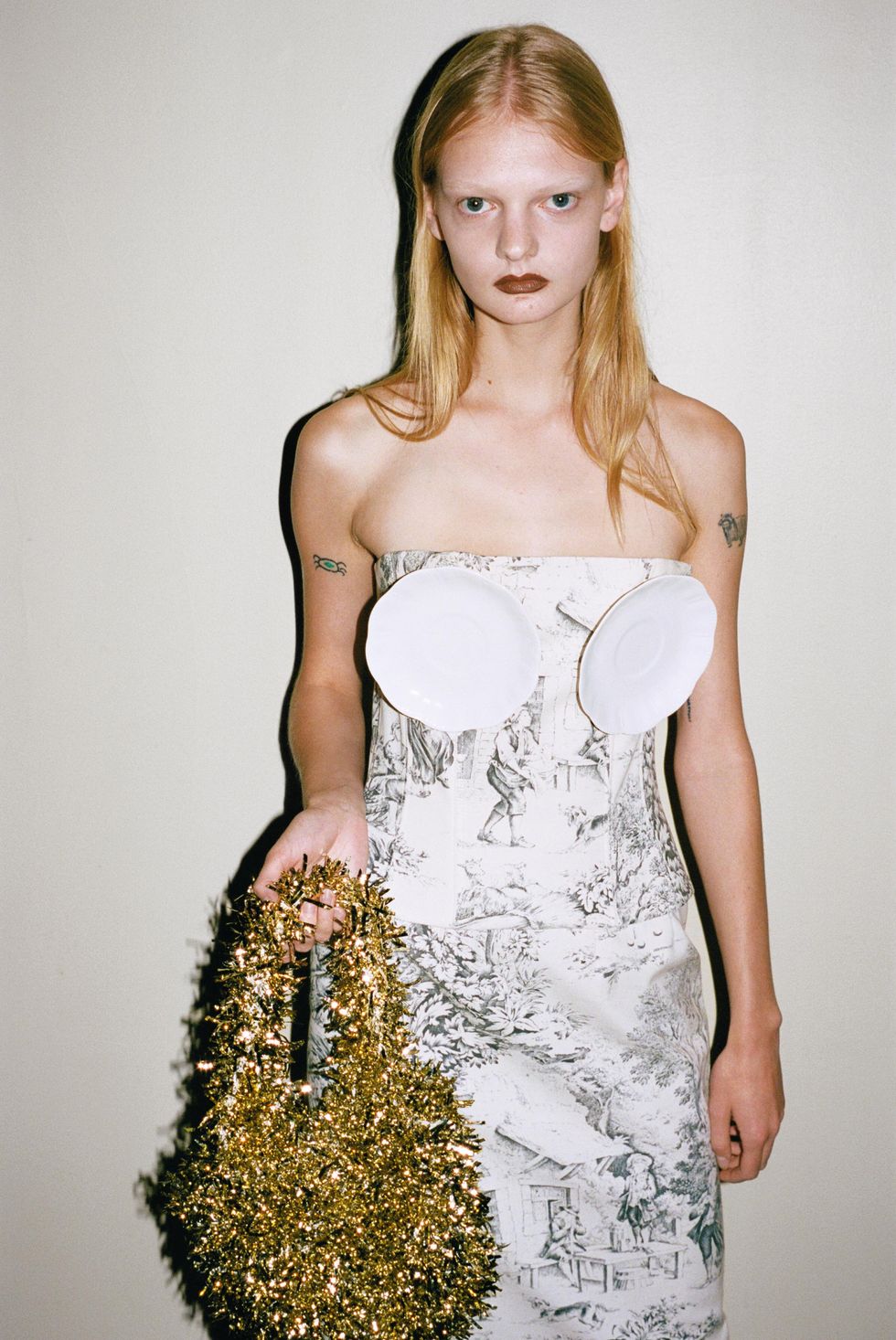 Above all, Marks' perspective is always driven by a refreshing sense of humor, which lends itself perfectly to the now unavoidable meme-ification of fashion week. Her looks, while always romantic and beautiful, easily find an immediate home on our newsfeeds. When her cheese heads or cheese heels emerged onto the catwalk, iPhones immediately sprung up; the same goes for a dress with two saucers covering the model's boobs and, on the back, her butt cheeks.