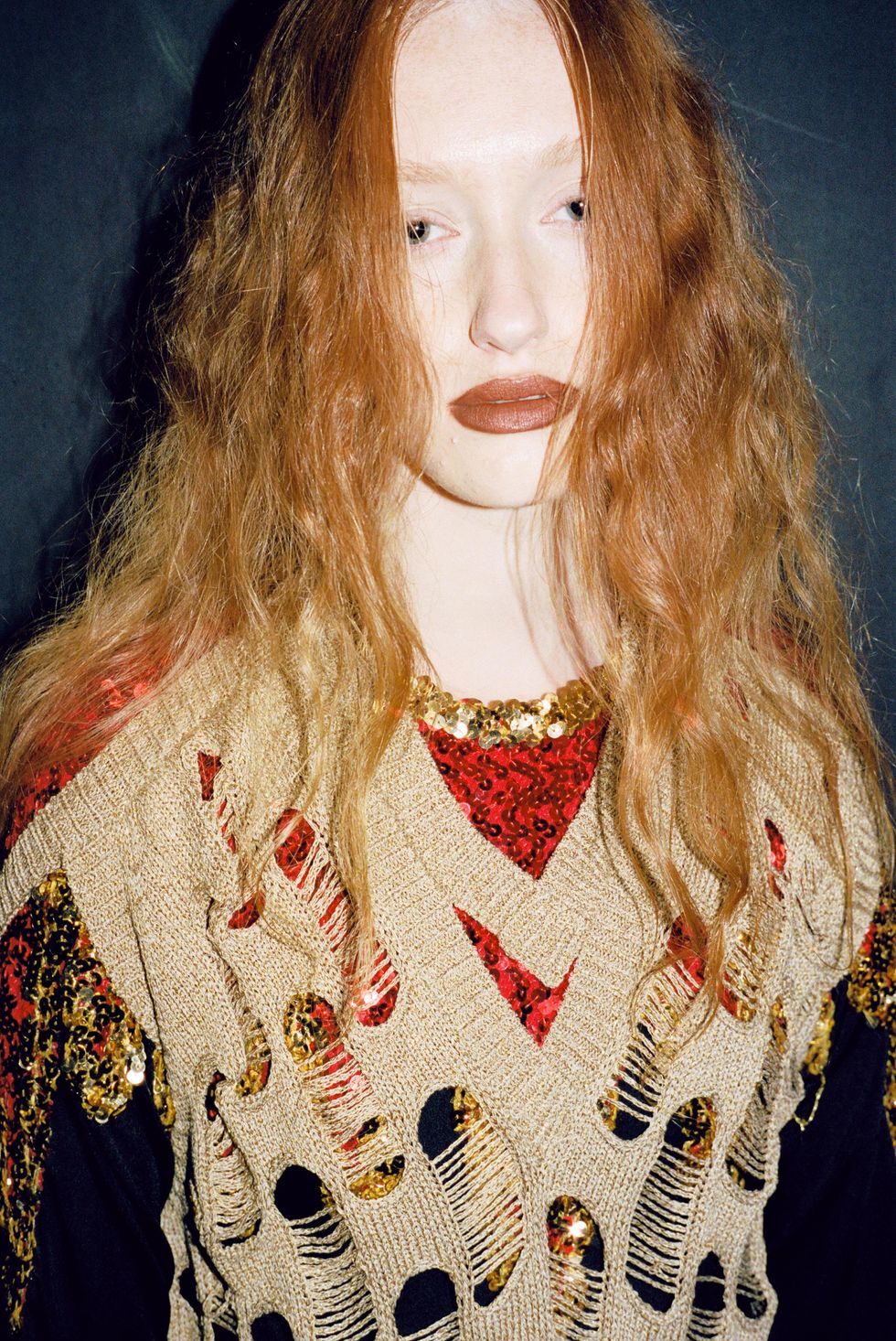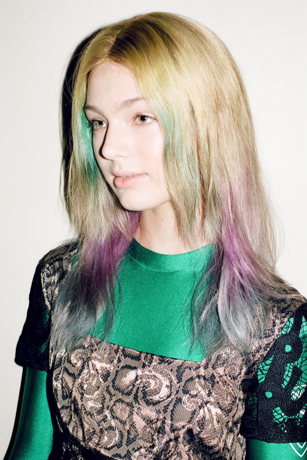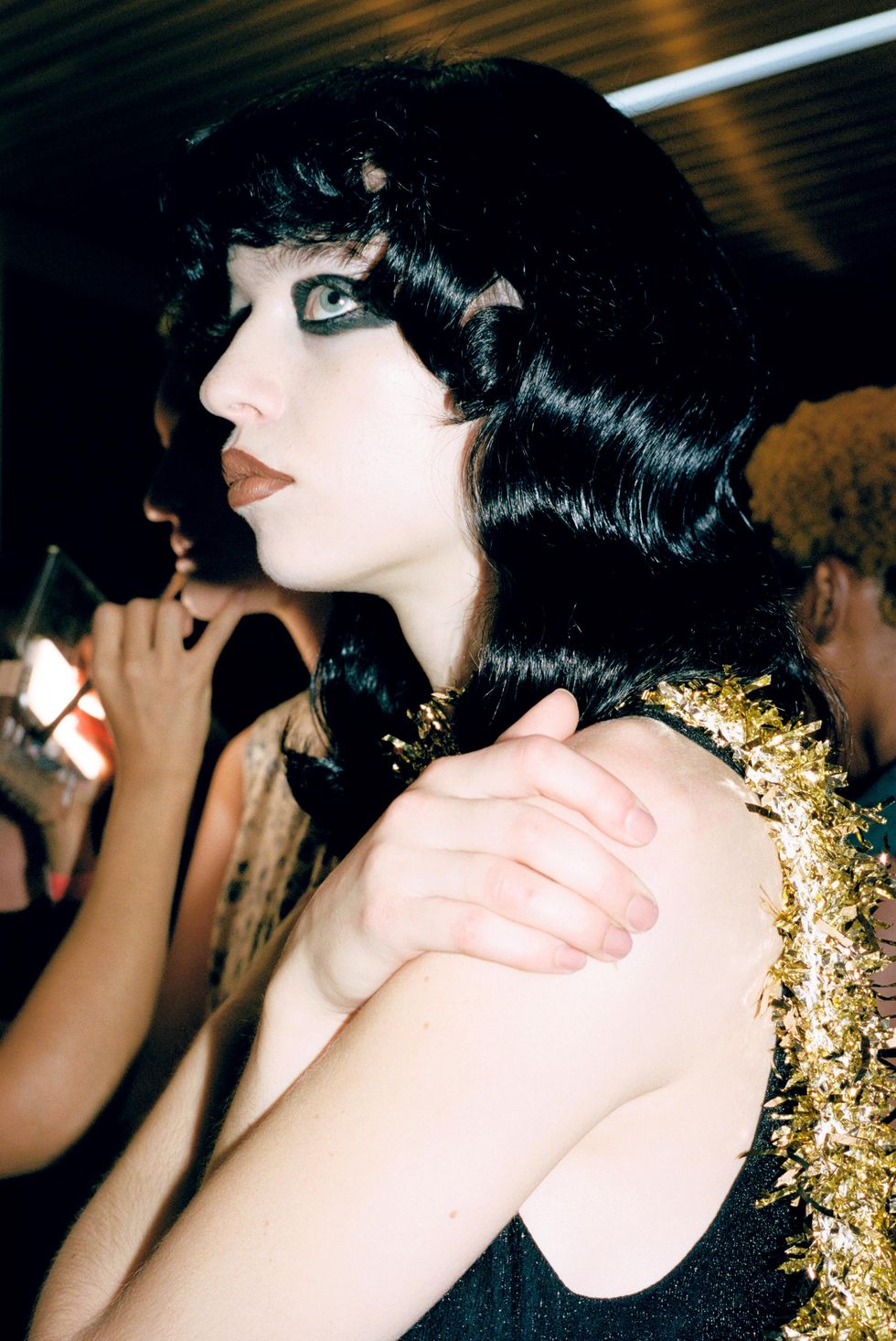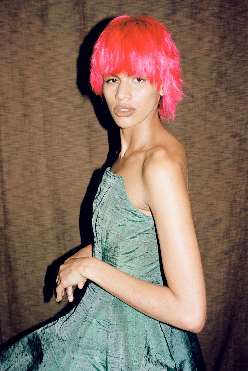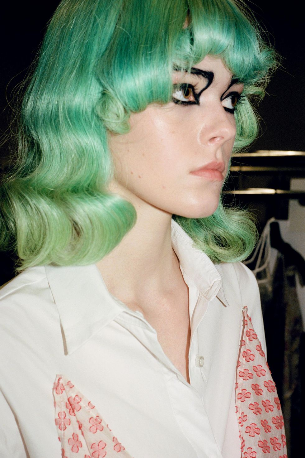Like our tentative return to normalcy, where togetherness has come with risk and, at times, guilt, the Puppets and Puppets look still had a bit of an edge, whether in its styling (by Stella Greenspan) or hair (Blake Erik) and makeup (Akiko Owada). Eyeliner was heavy-handed, with charcoal outlining models' eyes like dark caves, and the hair brought in some rebellious hues, from faded turquoise to orange or jet black, in flapper curls. "We are teetering the line between hauntedness and hopefulness," a press release reads.