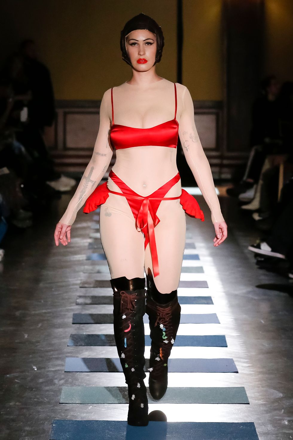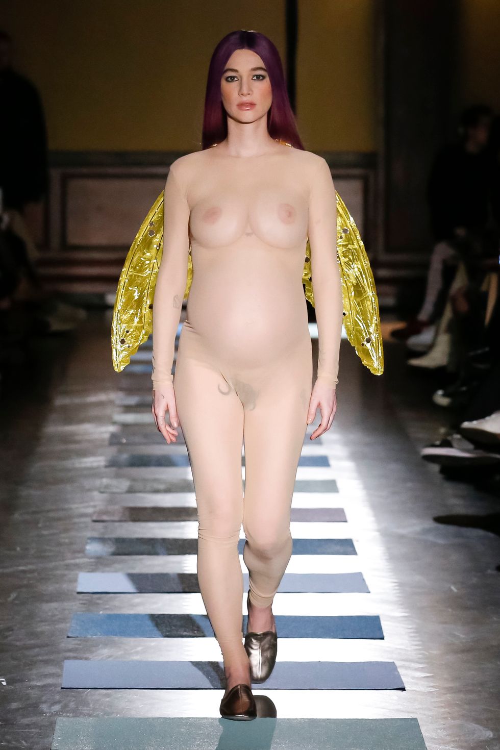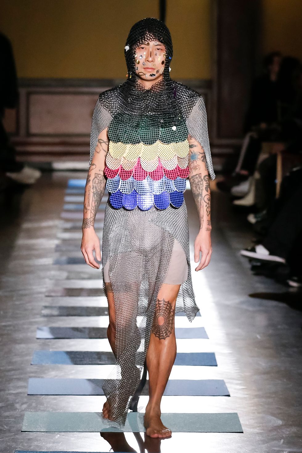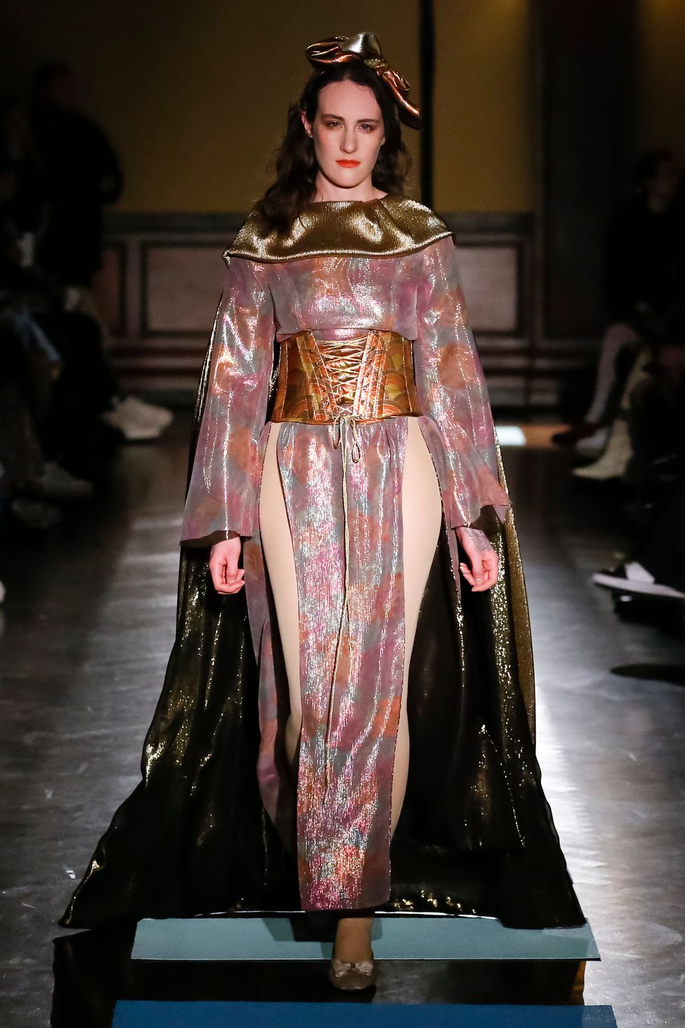 And so Mark and Argentina set out to pay thorough homage to his work — Argentina sewed each piece by hand, working nonstop for weeks and sleeping on the couch in Mark's apartment-slash-studio. The models, a clubby cast of New York's Very Cool, also had a hand in creating their characters. Performer and artist Bobbi Menuez opened the show as an adorable troll doll prince in a spandex henley and leggings, accessories embellished with chocolate-chip cookies and strands of popcorn; Lou Dallas designer Rafaella Henley wore a stunning gold dress and cape with a silk-lamé corset; a pregnant Alexandra Marzella wore a sheer nude bodysuit with fairy wings; Richie Shazam was a showstopper in an intricately constructed Tiffany-blue corset with double-bustle pants; Mission Chinese chef and owner Danny Bowien was a shining knight in chainmail; and poet Precious Okoyomon wore a squishy pink breastplate referred to in the show notes as "pillow armor." Each model, styled by Stella Greenspan, also had an individual beauty look (this is rare), with makeup by Grace Ahn and hair by Blake Erik.