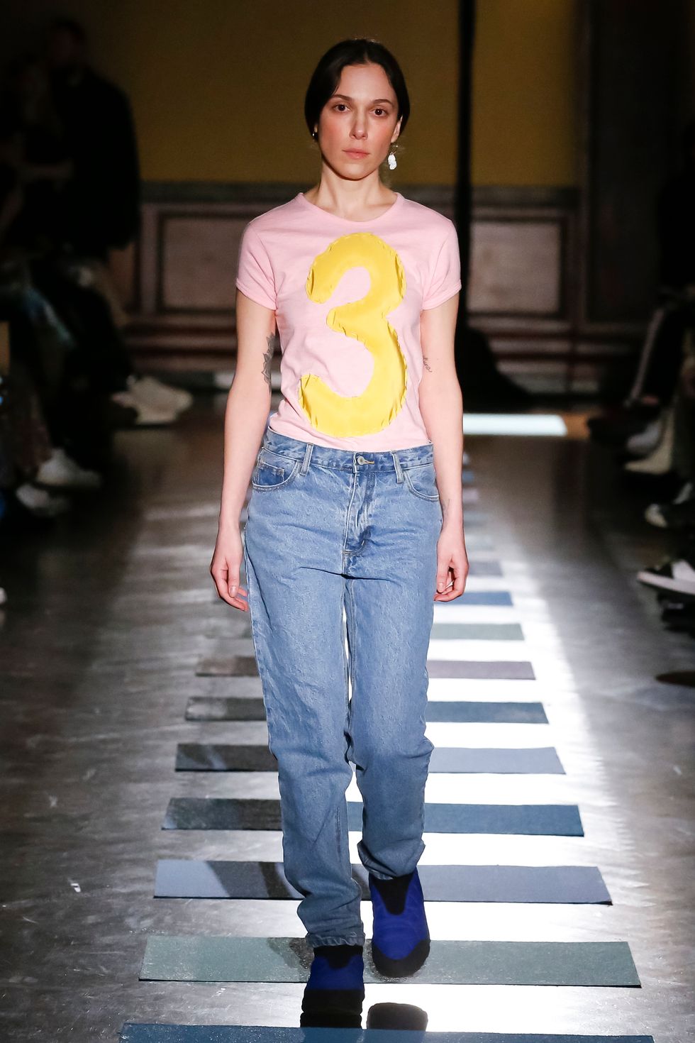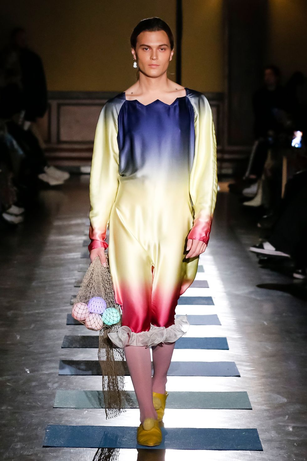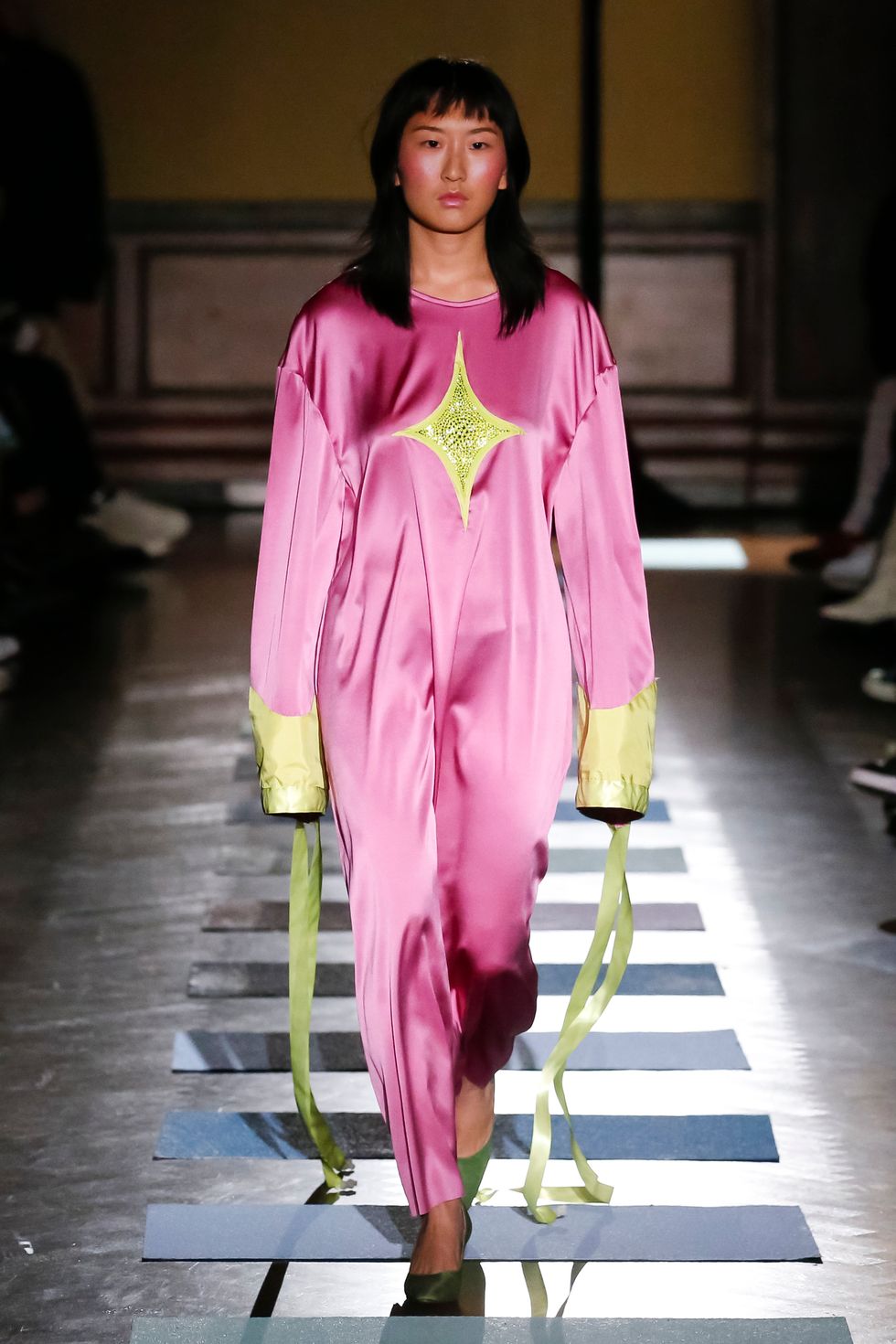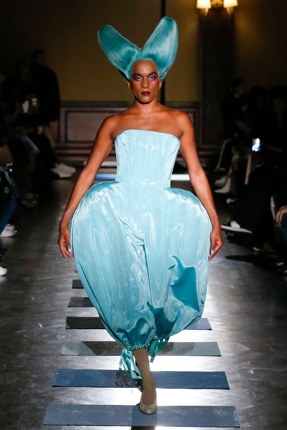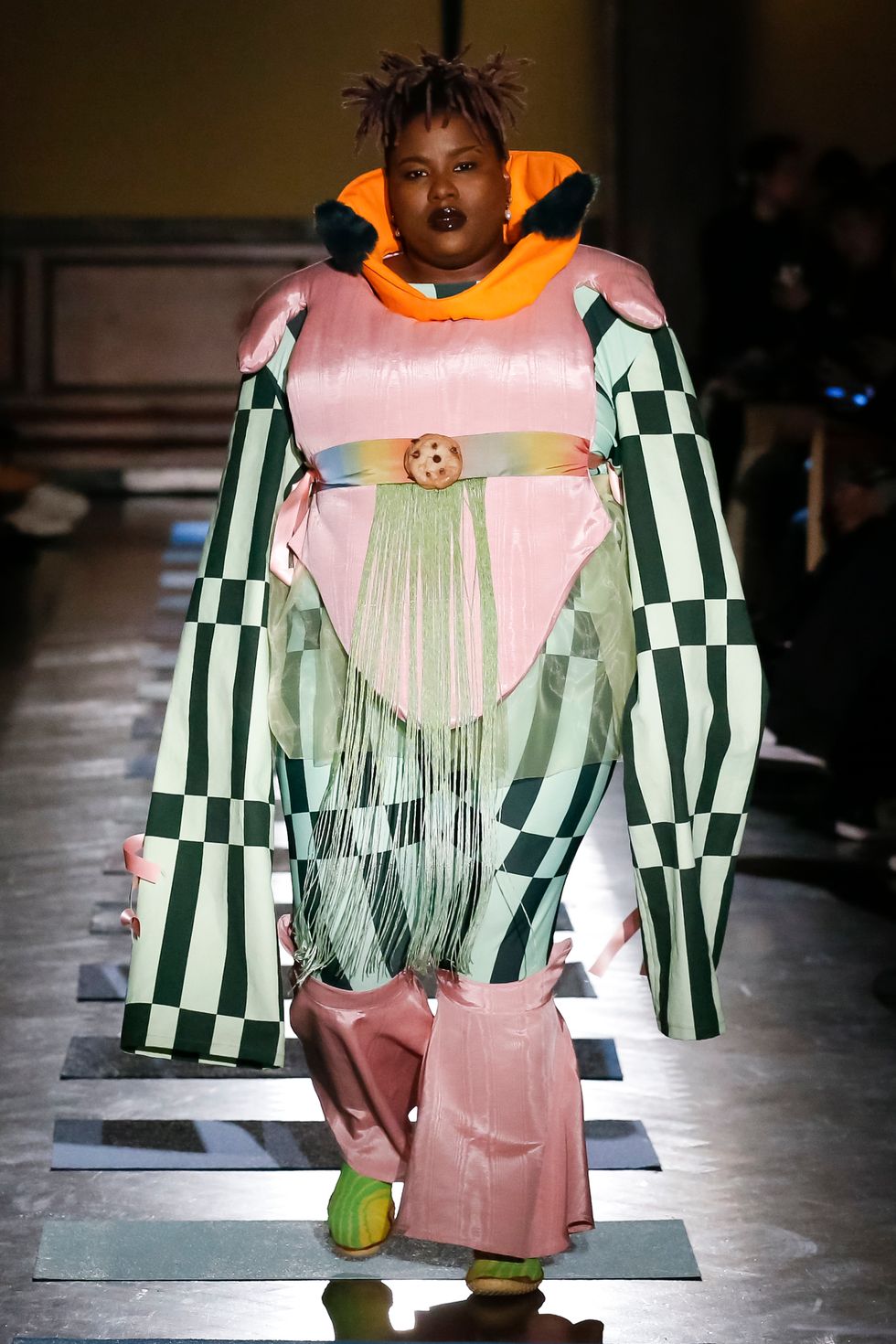 Both Mark and Argentina walked in the show, Mark in a chill t-shirt and jeans and Argentina in a bejeweled charmeuse dress with popcorn dangling from the sleeves (the food accents have quickly become a Puppets signature — Mark said that she's "snack-centric and I always have been, my brain is just like make that a chocolate chip cookie"). And the ethereal musician Caroline Polachek closed things out in a green pannier skirt and a matching batwing top with a pink collar named for Christian Lacroix, taking even courtly steps that made her look like she was floating. I recently ingested mushrooms and wept an Ocean of Tears at a Polachek show; as she walked out I let out a small yelp over the dramatic rendition of "Ave Maria" that served as the show's soundtrack. Apologies to Ms. Polachek and my seatmates.