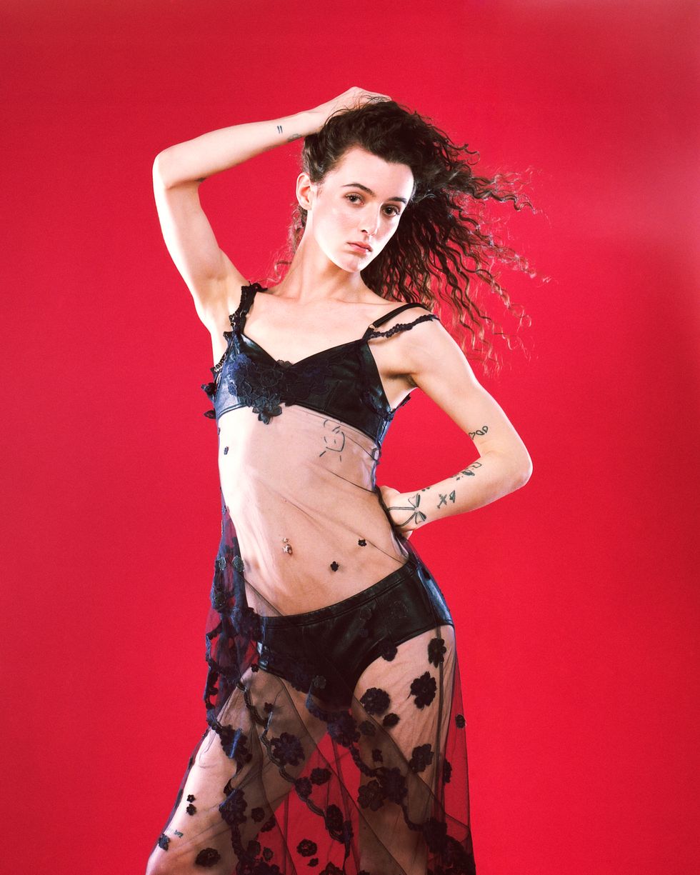 "A night out with us is definitely going to get hot since we can usually be found on the dance floor all night, so it's only fitting that Alaska wears a completely sheer lace dress. Any look for going out wouldn't be complete without leather, so naturally she needed to be in a leather bra and panty. I can't think of anyone else that can pull this off! She's gonna be dodging trade left and right." —Andrew