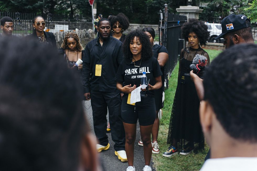Shortly before the 2 PM start time, the heavy rainfall wreaked havoc all across New York, with some parts experiencing massive flooding as a result of Tropical Storm Elsa. Outside the venue, guests waited it out patiently in the wet conditions, which alternated between light drizzles and biblical downpours. At one point, an emotional Kerby Jean-Raymond walked onstage to thank everyone for their support, with attendees bursting in cheers in solidarity with the designer.