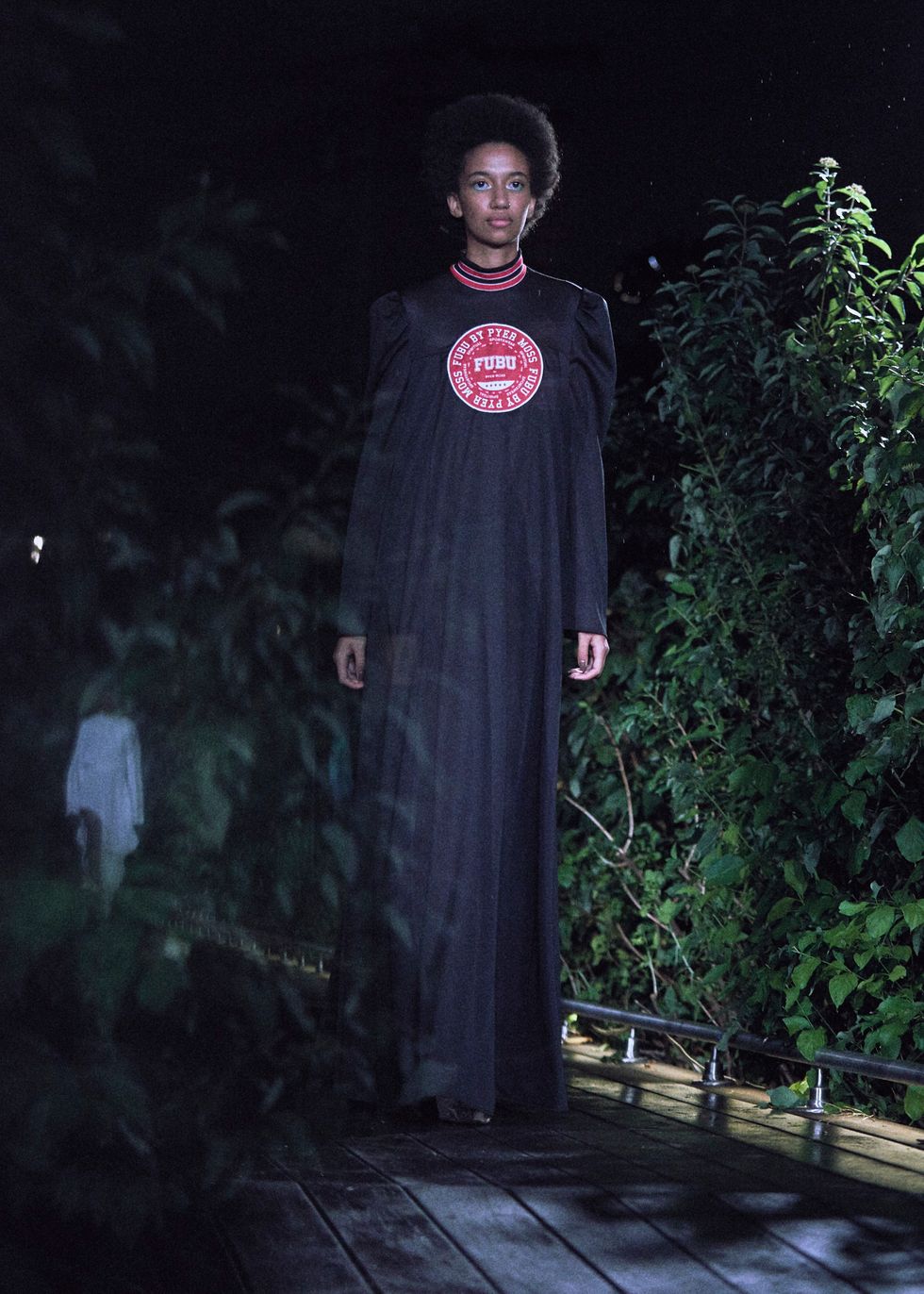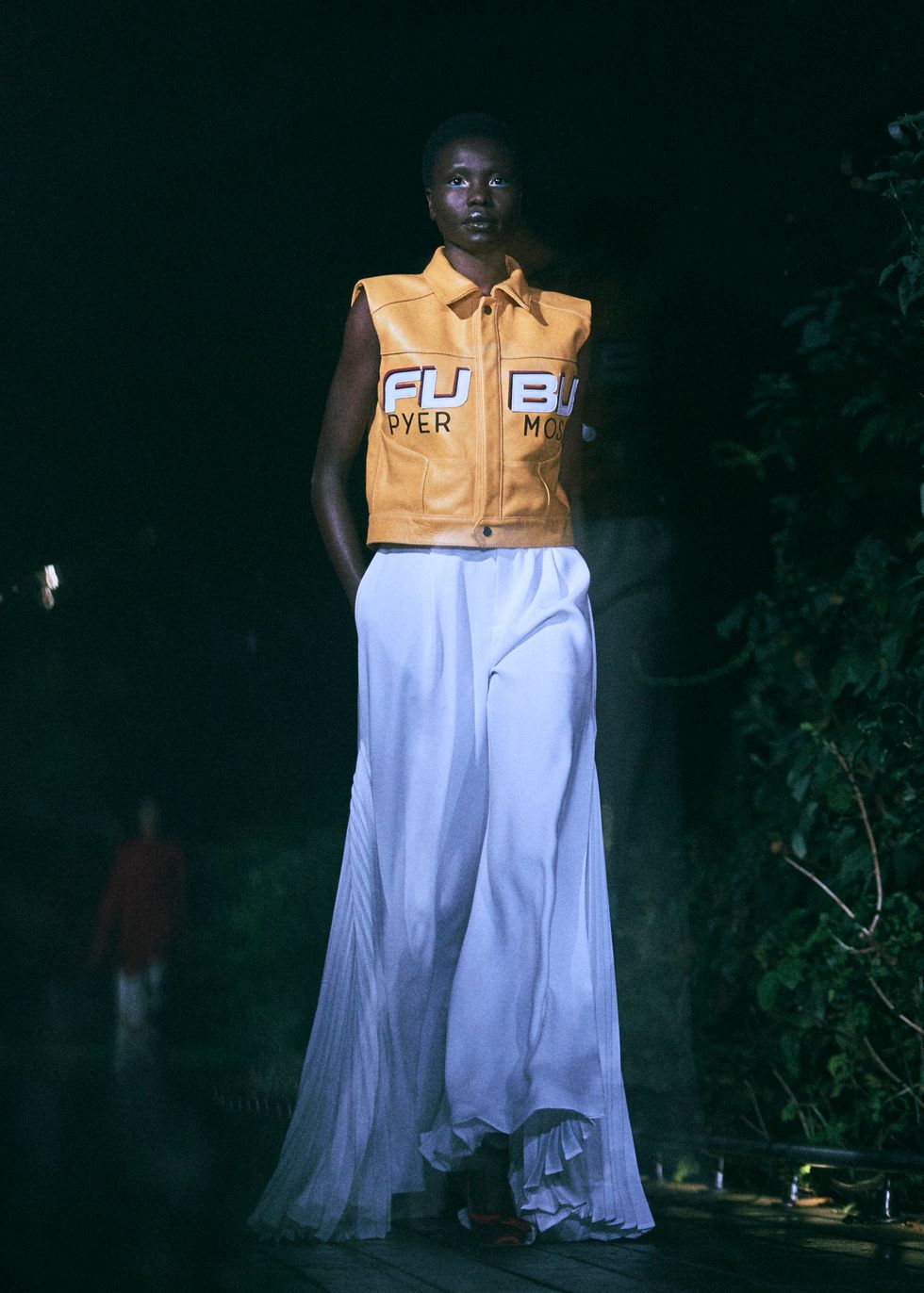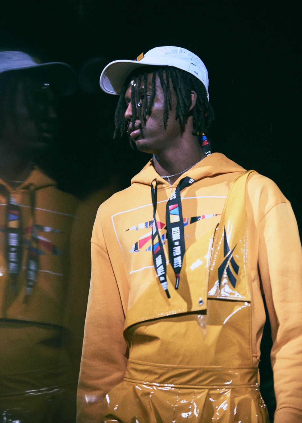 Jean-Raymond continued his Reebok partnership this season with technical outerwear, shorts, wide-cut active trousers, and sneakers. The designer also teamed up with Daymond Johns's Queens-born sportswear label Fubu on a maxi dress informed by sports jerseys, a tunic version in a children's size finished with a cape, and a pale yellow, logo vest.