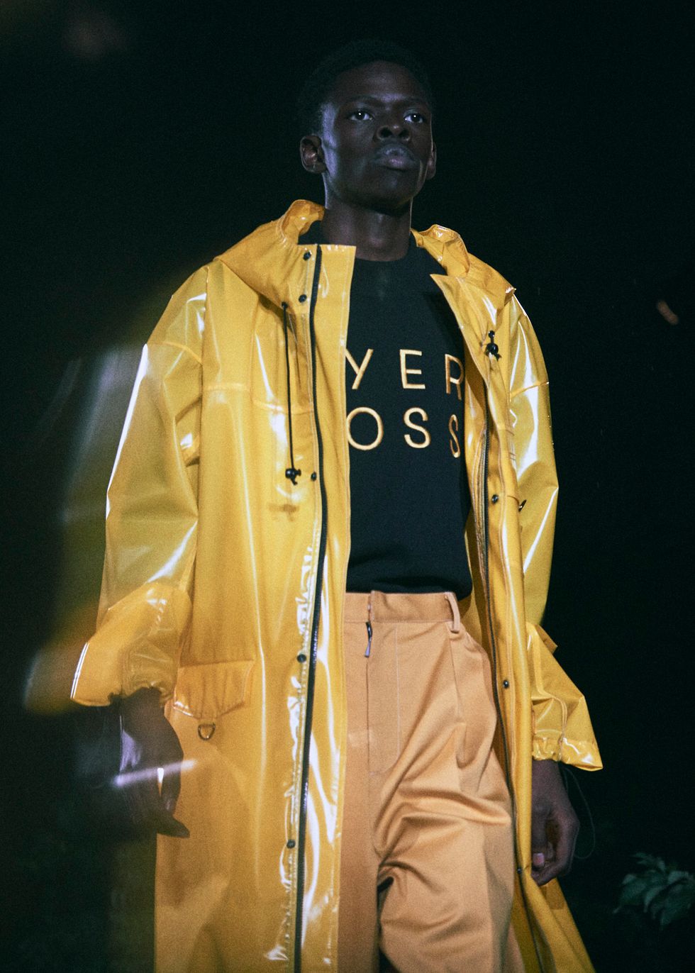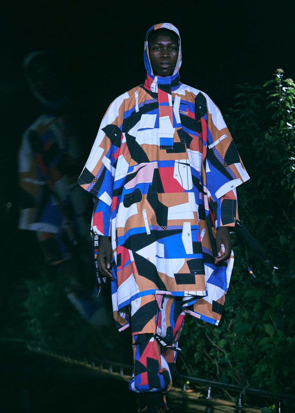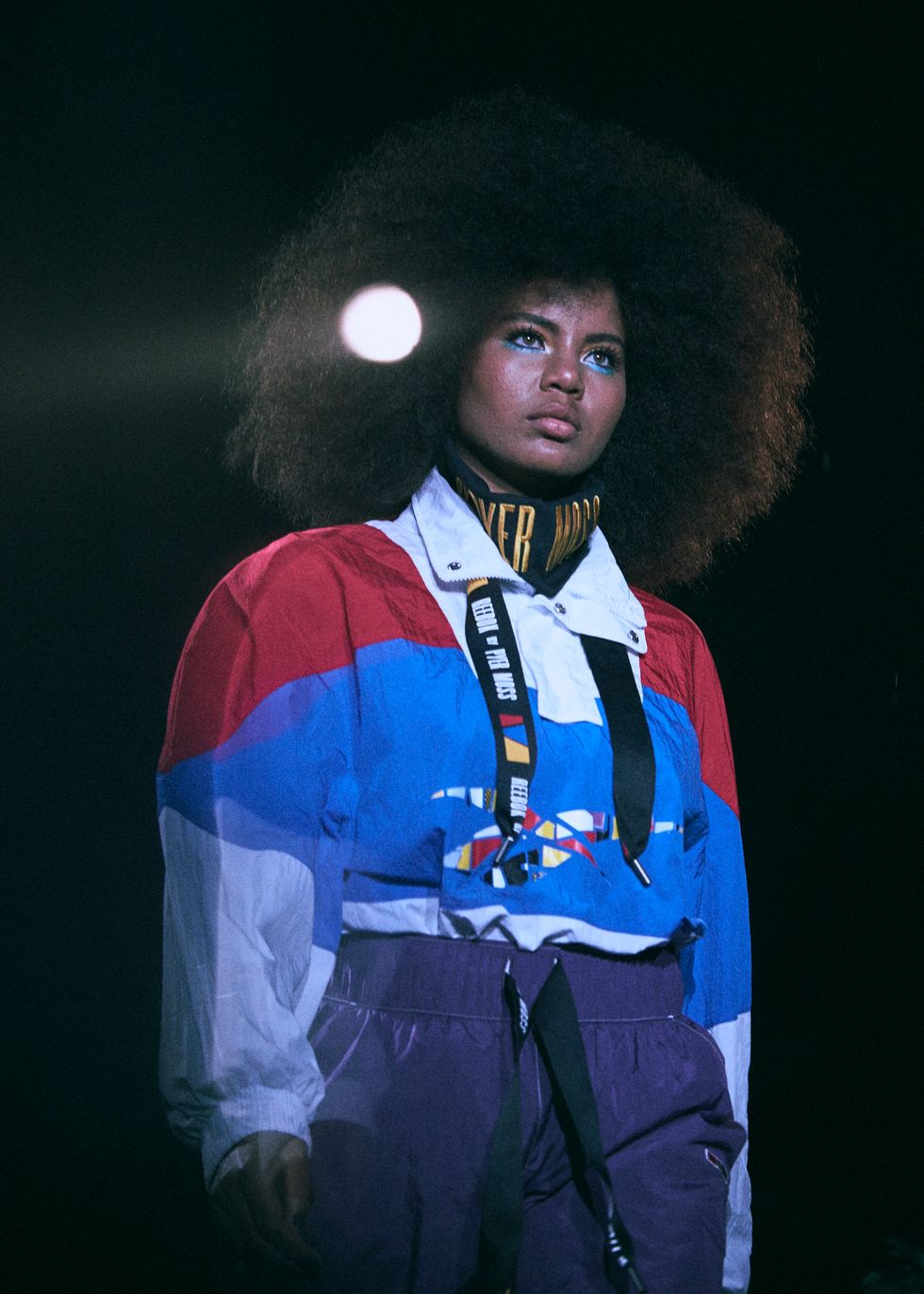 Jean-Raymond continued his Reebok partnership this season with technical outerwear, shorts, wide-cut active trousers, and sneakers. The designer also teamed up with Daymond Johns's Queens-born sportswear label Fubu on a maxi dress informed by sports jerseys, a tunic version in a children's size finished with a cape, and a pale yellow, logo vest.