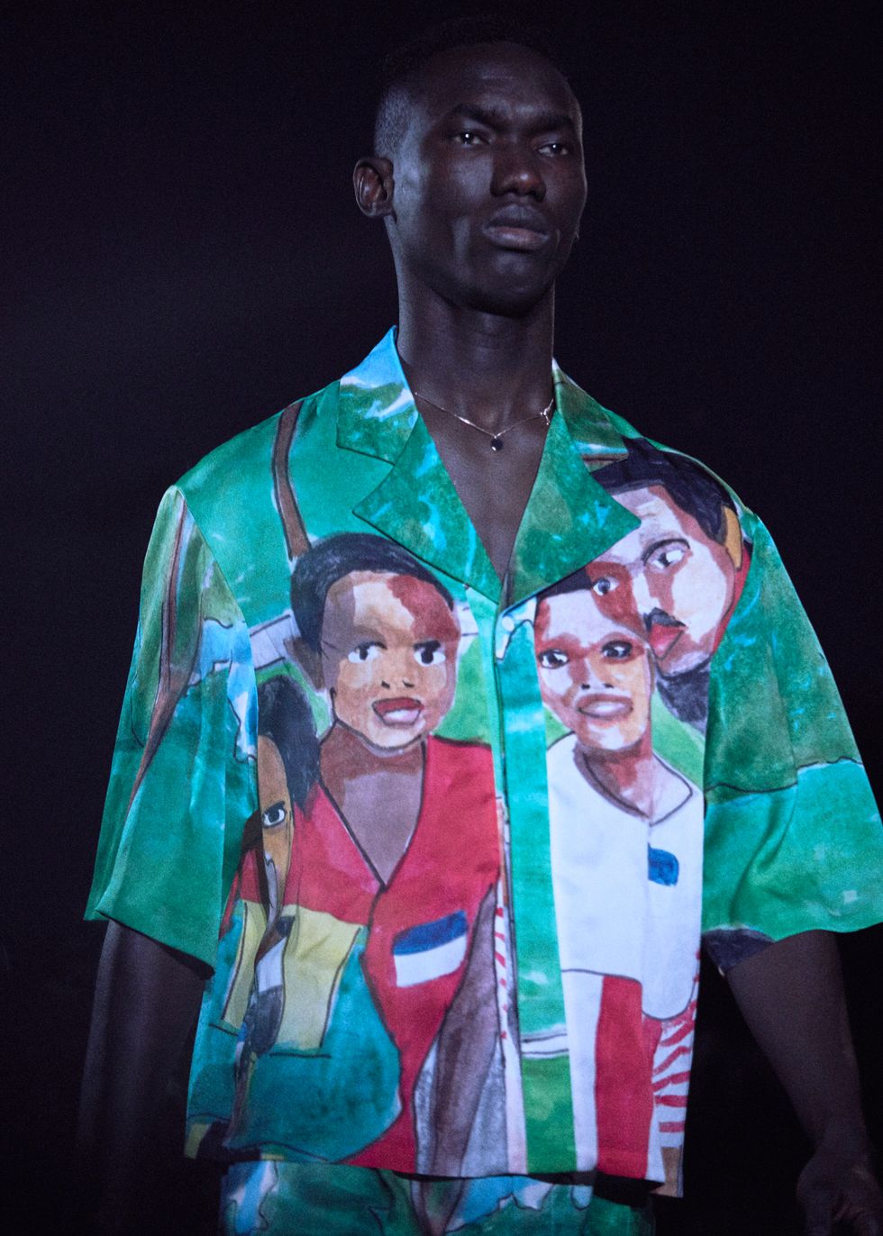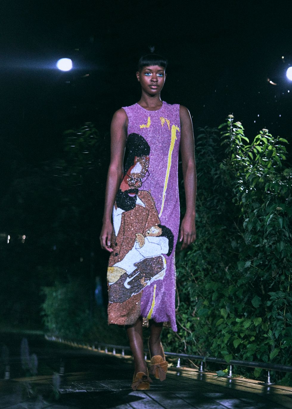 Paintings from multidisciplinary artist Derrick Adams's "Family Portrait" series was translated into prints and applied to fluid tunics, dresses, trousers, and handkerchief hem skirts. Seen grilling outdoors, walking down the wedding aisle, and cradling their children, the figures in Adams's works own their space, conveying a confident, positive depiction of black family life.