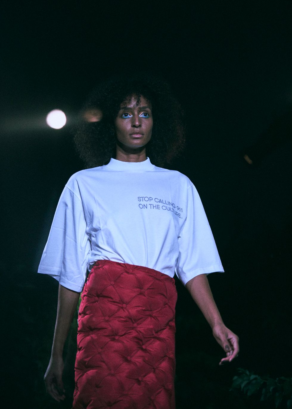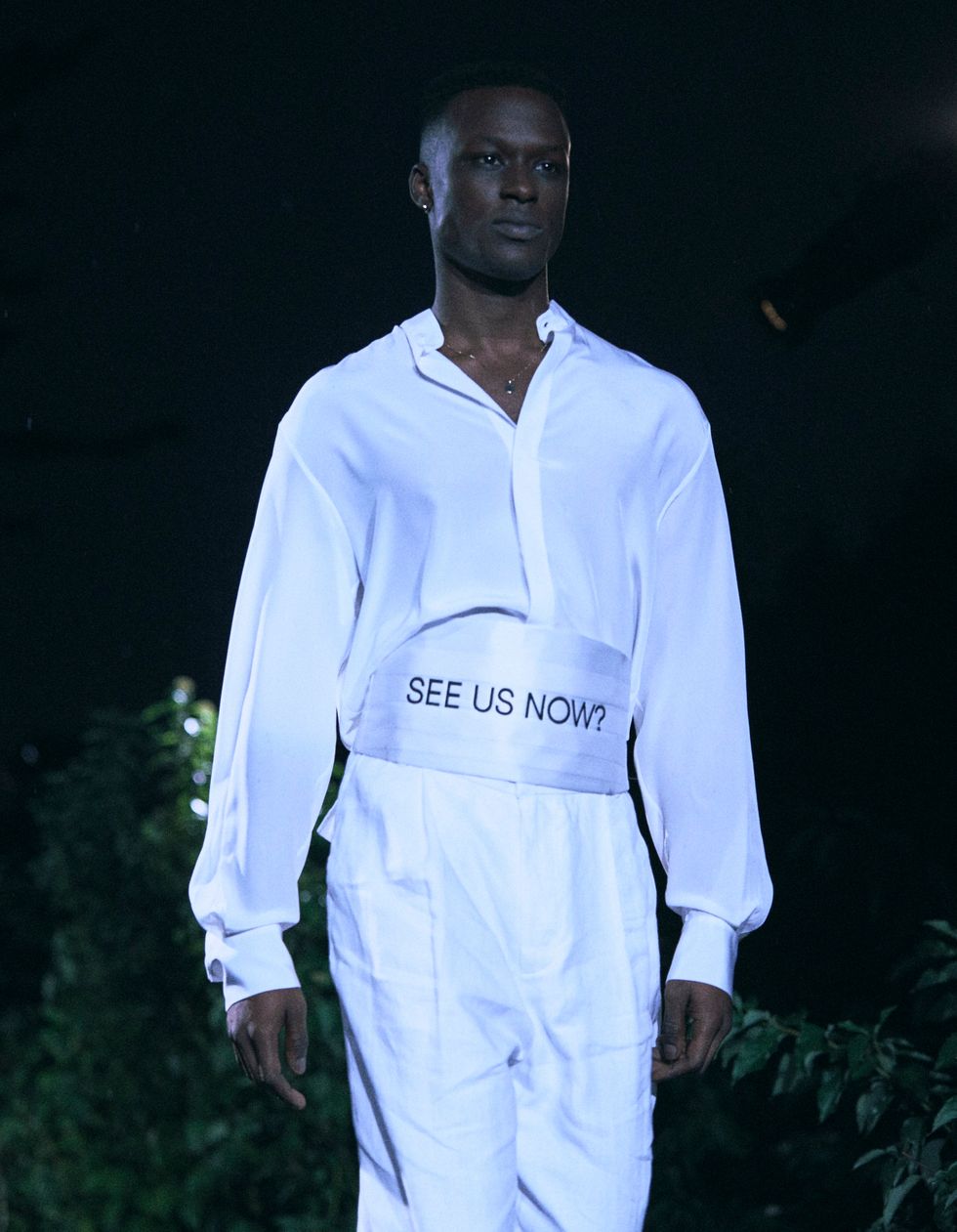 Phrases including "See us now?" and "Stop calling 911 on the culture," were emblazoned on a cummerbund and t-shirt respectively. Touching on the visibility of black talent and police brutality, the sentences reflect Pyer Moss's standing as a medium for social commentary.
