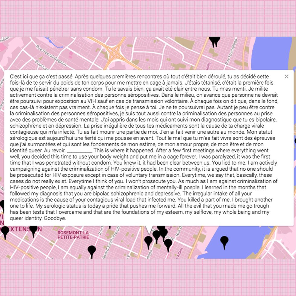 That folks were so quick to rush in to restore and revamp the site, as well as the spike in submissions, speaks to how powerful the project is as a digital space for queers to see themselves, to feel represented, to know they're not alone, by reading someone's intimate reminiscing of their teenage first love in Montreal, back when the world was against them; a trans person from a family of Egyptian refugees dropping a pin in their hometown for visibility; a coming out story that starts with family rejection but follows through to a year-and-a-half later in Alaska, when they're ready to let go of that pain — a personal triumph.