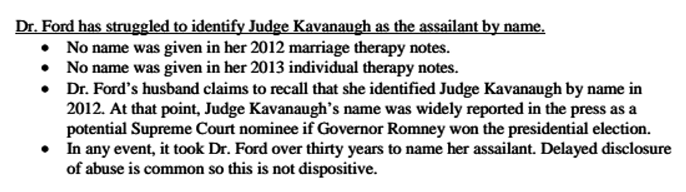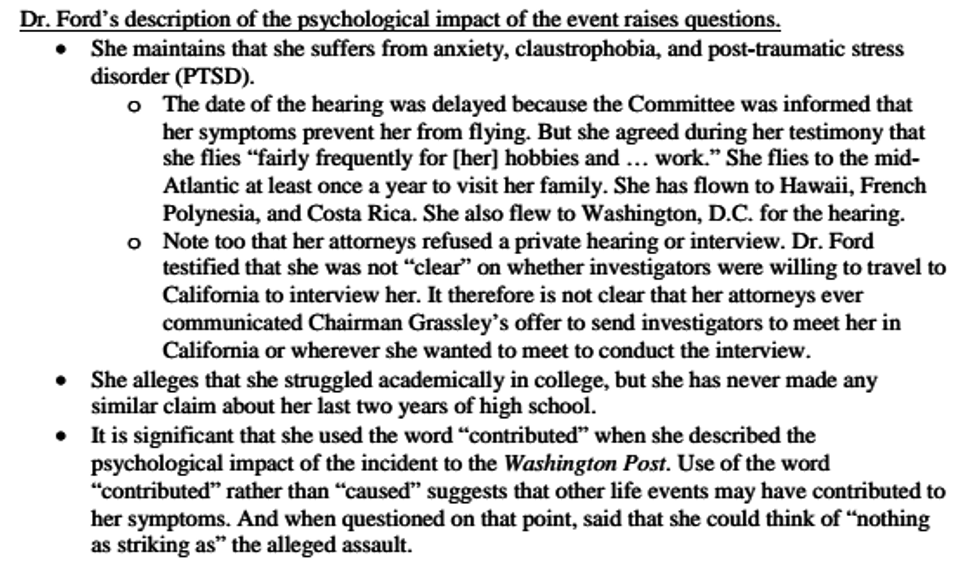 The memo also discredited Blasey Ford by poking holes in explanation of how her trauma has manifested.
