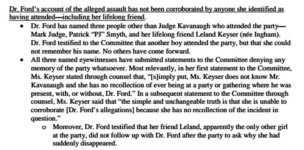 Just as Kavanaugh repeated his testimony, Mitchell focused on the fact that Mark Judge, Patrick "PJ" Smyth" and Leland Keyser stated that they do not recall the party where the assault allegedly took place: "Dr. Ford identified other witnesses to the event, and those witnesses either refuted her allegations or failed to corroborate them."