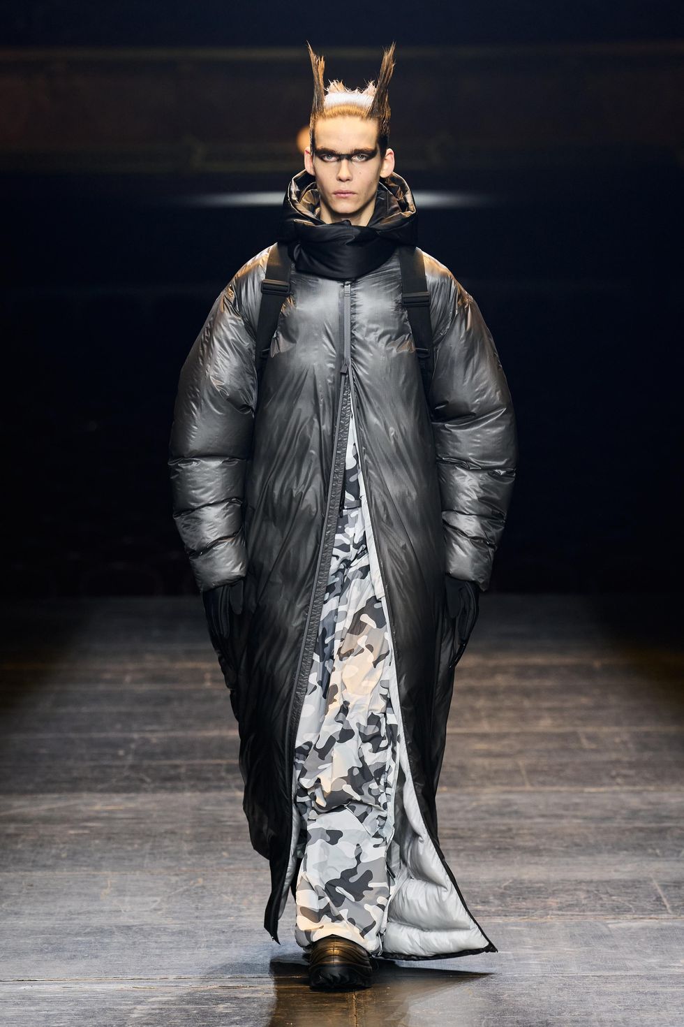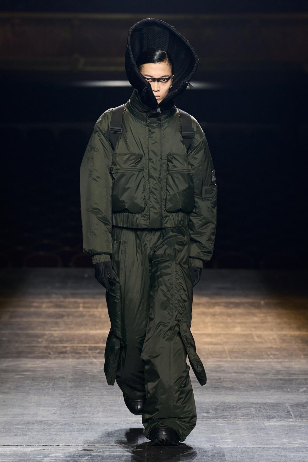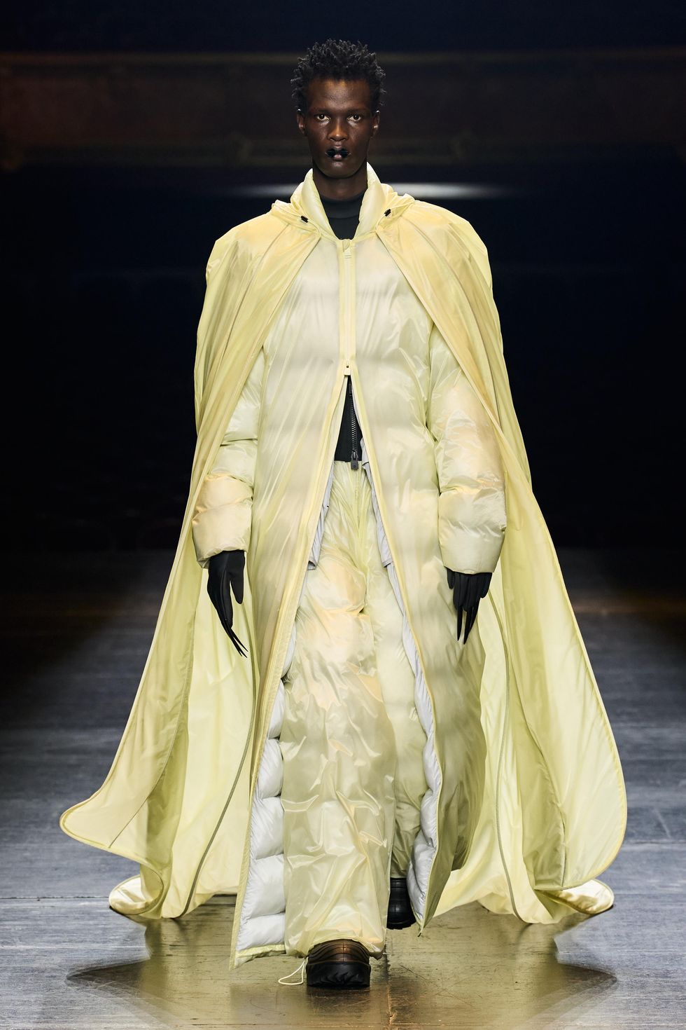 With each look the hero theme evolved as an idea about forward momentum, grounding and positivity. Silhouettes spilled to the ground in columns of technical fabrics and extended beyond reality. Other superhero iconography include theatrical capes, extended collars and new branding with a HERO application.